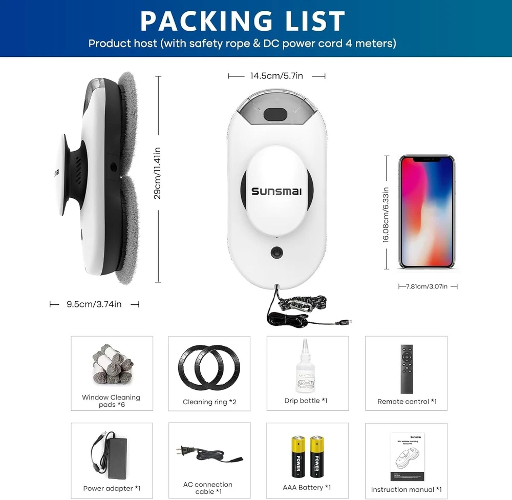 About this item Easy to clean: Say goodbye to the tediousness of traditional window cleaning, the automatic window cleaning robot is designed to be lightweight and easy to operate. Just one button start, you can enjoy the convenience of automatic cleaning Dual side water spray: Window cleaner robot with dual water spray will spray water in the forward direction, pre-moistening the stains, so that the cleaning is deeper and more thorough. Window glass cleaning machine upgraded with atomized nozzles that are not easily clogged 3 Intelligent Paths: The smart window cleaner robot has 3 intelligent cleaning paths that automatically detect window frames and obstacles and adjust the direction automatically. For heavily soiled areas of the glass, there is also the option to manually maneuver the robotic window cleaner for repeated cleaning Powerful suction & UPS: Vacuum motor technology gives the glass cleaning robot a powerful suction force of 2500pa-2800pa, which helps the window robot to adsorb onto the glass surface. The built-in UPS (Uninterruptible Power Supply) allows the window washer robot to remain on the glass for up to 30 minutes in the event of an accidental AC power failure Visual water tank: The window cleaner robot Sunsmai is equipped with a 50ml large-capacity water tank, which can complete the cleaning task of a large area at one time, without the need to repeatedly add water to improve the cleaning efficiency Washable cleaning cloths: For dirty windows, we offer 6 pairs of high-quality, interchangeable cleaning cloths that easily remove stubborn stains, while being easy to wash and replace to keep the window washing robot cleaning