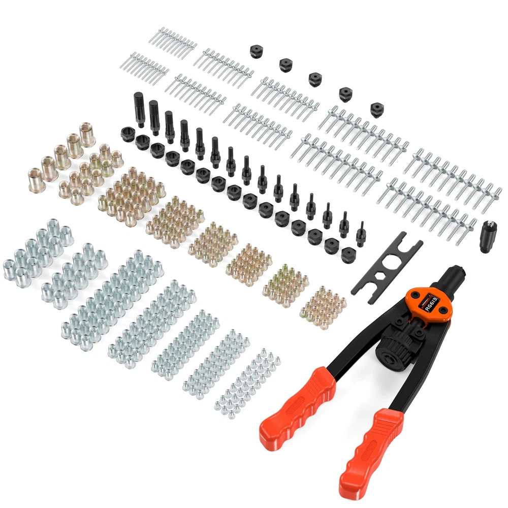 📦Dual-purpose rivet gun for riveting nails and nuts, with a length of 14 inches. 📦Includes 7 types of mandrels for rivet nuts (Metric sizes: M3, M4, M5, M6, M8, M10, M12). 📦Includes 8 types of mandrels for rivet nuts (Imperial sizes: 6-32, 8-32, 10-32, 10-24, 1/4-20, 5/16-18, 3/8-16, 1/2-13). 📦Includes 5 types of blind rivet nozzles for pulling rivets [ φ3.2 mm(1/8") , φ4.0 mm(5/32") , φ4.8 mm(3/16") , φ6.0 mm(15/64") , φ6.4 mm(1/4") ]. 📦Includes 7 types of metric nutserts (M3=30 pcs, M4=30 pcs, M5=30 pcs, M6=30 pcs, M8=30 pcs, M10=10 pcs, M12=10 pcs). 📦Includes 8 types of imperial nutserts (6-32=20 pcs, 8-32=20 pcs, 10-32=20 pcs, 10-24=20 pcs, 1/4-20=20 pcs, 5/16-18=20 pcs, 3/8-16=10 pcs, 1/2-13=5 pcs). 📦Includes 5 types of blind rivets [φ3.2 mm (1/8")=20 pcs, φ4.0 mm (5/32")=20 pcs, φ4.8 mm (3/16")=20 pcs, φ6.0 mm (15/64")=20 pcs, φ6.4 mm (1/4")=20 pcs].