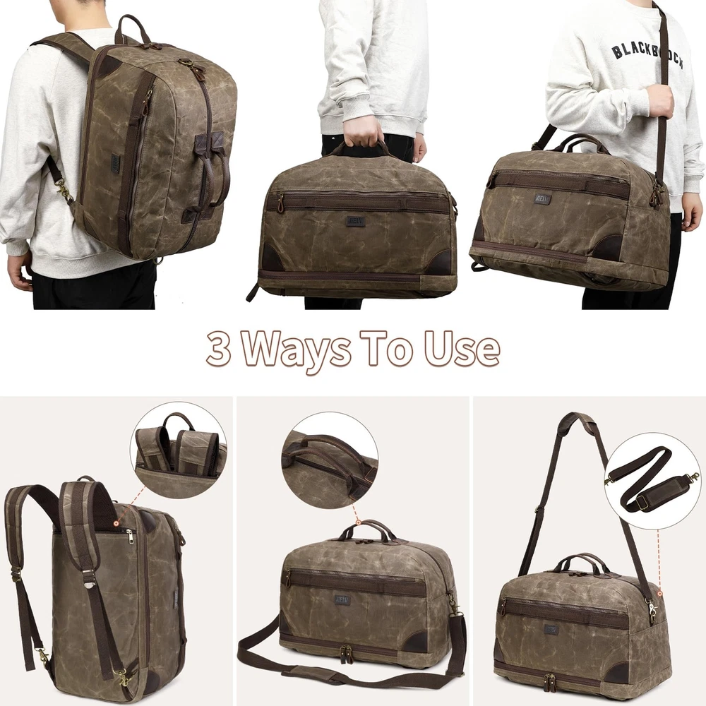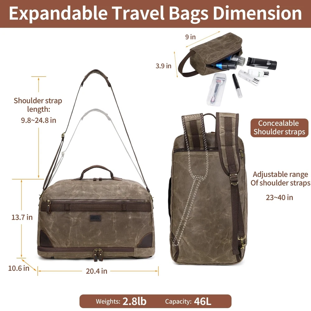 Duffel Bag for Travel: Convertible Weekender Overnight Bag Vintage Waxed Canvas Duffle Bag with Laptop Compartment, 3 in 1 Computer Backpack for Men Bags for Mens (Green) Product Details Color: Army Green Brand: Yamons MPN: Does not apply UPC: Does not apply EAN: Does not apply Product Dimensions: 20.4 x 10.6 x 13.7 inches Item Weight: 3.12 pounds Department: Men Manufacturer: Yamons Country of Origin: China Number of Compartments: 3 Item Weight: 1.42 Kilograms TRAVEL BAG & FREE TOILETRY BAG: 21.3"L * 11.8"W * 13"H that meets most international carry-on requirements. . And it comes with a free toiletry bag, which can helping you organize and maximize your space. It is a great gift for husbands and boyfriend's birthdays, wedding anniversary, Father's Day and Christmas. LARGE CAPACITY & LAPTOP COMPARTMENT: This Canvas travel bag has multiple zip pokects, help you pack easily and keep items organized. The laptop compartment is in the bottom pokect, the extra thickend sleeves well protect your electronics. 3 IN 1 CONVERTIBLE LAPTOP BAG: This duffle bag is not just a computer bag, it can also be a travel business backpack and the shoulder bag. Convertible duffle bag is designed with luggage sleeve, which can free your hands and keep your smartphone, ID card or passport inside easily when you're at the airport. PREMIUM VINTAGE WATERPROOF WAXED CANVAS MATERIAL:YAMONS overnight Bag is made of waxed canvas material.Waterproof material is pefectly protect your luggage. This vintage style is super cool for mens travel duffle bag. FINE CRAFTSMANSHIP: We are professional in bag making factory for more then 20 years. Providing the premium quality Bag and thoughtful design is all we purse. Please feel free to contact us for matter.