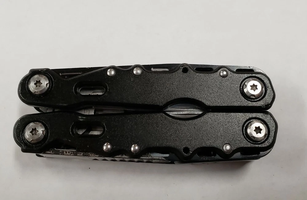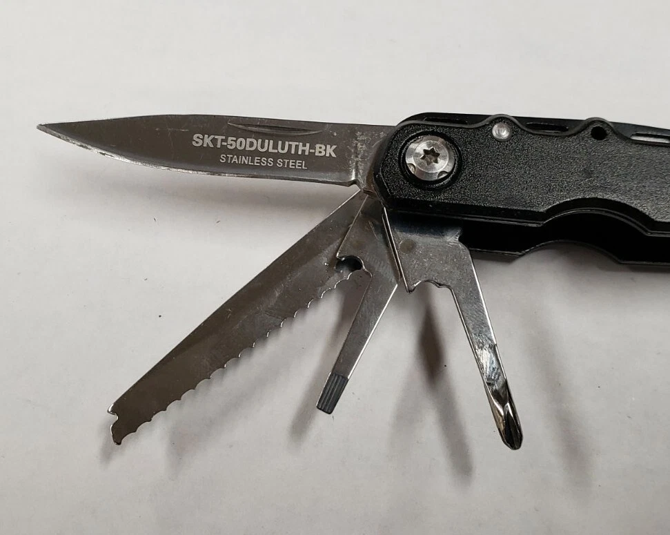 Bottle Opener, Can Opener, Knife, Phillips Screwdriver, Wire Cutter, Wire Stripper, Fish hook remover, Small flathead screwdriver, Large Flathead Screwdriver, Wood-Metal File, Awl, Saw, Traditional Pliers, Needle Nose Pliers