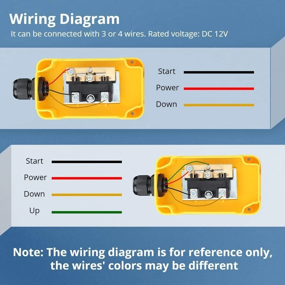 1 【Widely Used】With a size of 5.5 x 2.5 x 2.1 inches, the remote control switch is compact and portable. It’s suitable for most double-acting hydraulic pump power units, such as dump trailers, electric forklifts, electric sanitation vehicles, lifters, automobile tailboards, electric pallet trucks, lifting platforms, boarding bridges, electric basketball racks, and so on. 【3 Installation Methods】3 methods are available for easy access. A wall mount holder is equipped to place the remote control switch, and it perfectly fits the size of the switch. Besides, there are 2 magnets on the back of the switch for magnetic adsorption. You can also hang the switch to the wall via the hanging hole. 【Durable Plastic Protective Shell】The shell is made of high-quality plastic, which is wear-resistant, heat-resistant, anti-impact, and durable for long-term use. It can protect the dump trailer remote control switch from dust, moisture, and even bad weather, providing all-around protection for the wiring inside. 【Remote Control for Up Down】 Using this remote control switch with 2 buttons, you can remotely control a dump trailer to lift or put down items. The remote control is easy to use, bringing more convenience and improving working efficiency with no limitation by distance. 【3-Wire 4-Wire Connecting】Unscrew the back cover with a screwdriver, and you can see the wiring terminals. The remote control switch can be connected with 3 or 4 wires to meet your different needs. The rated voltage is DC 12V. Please refer to the wiring diagram shown in the picture. Product Description