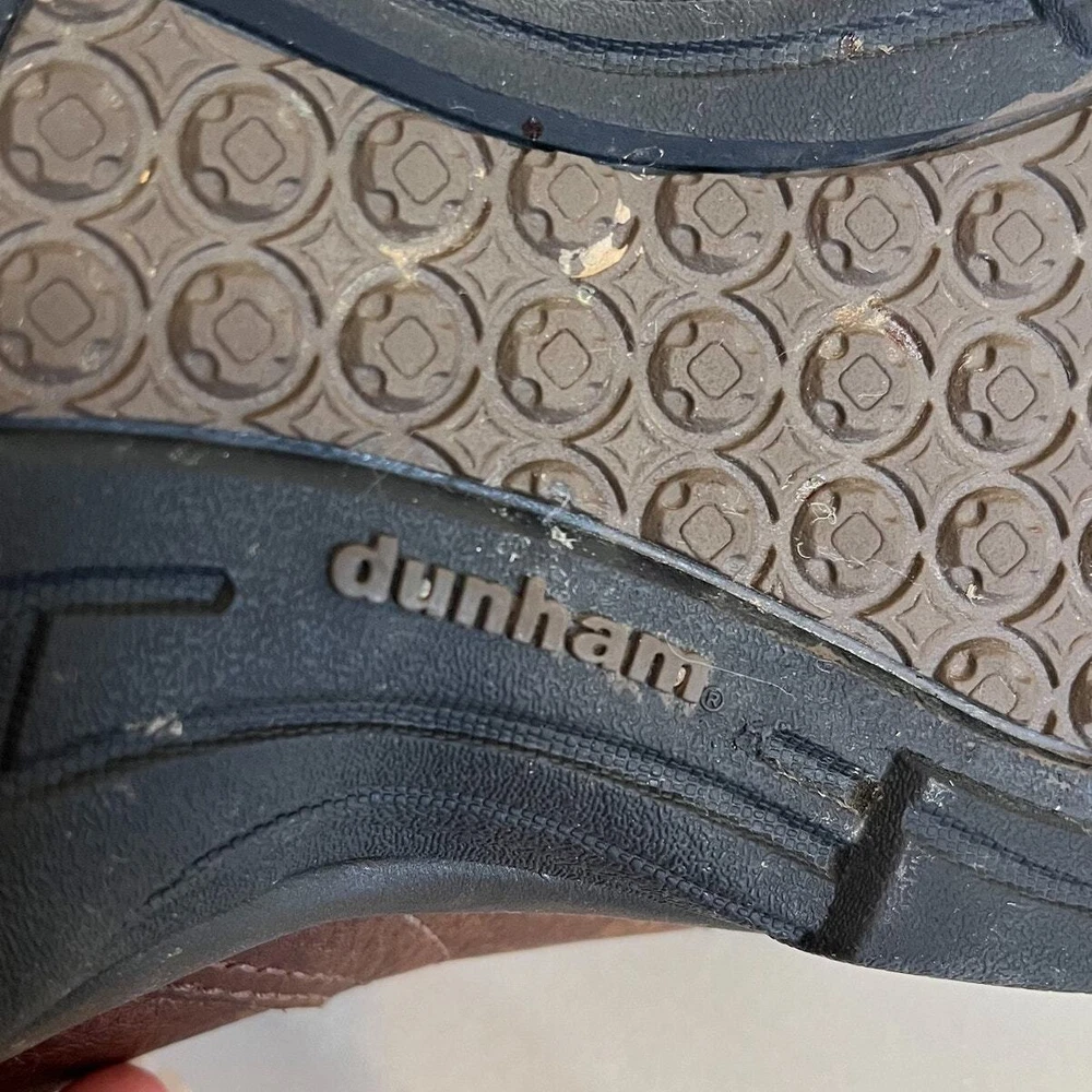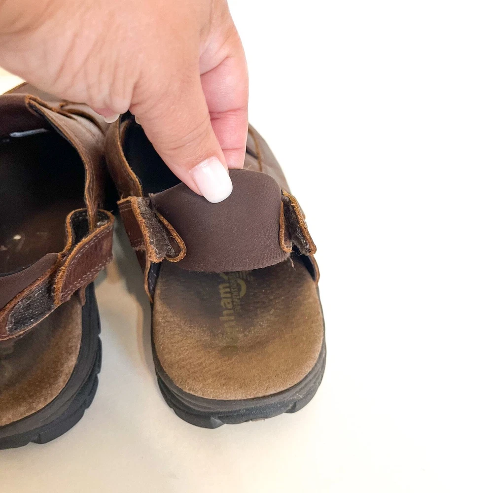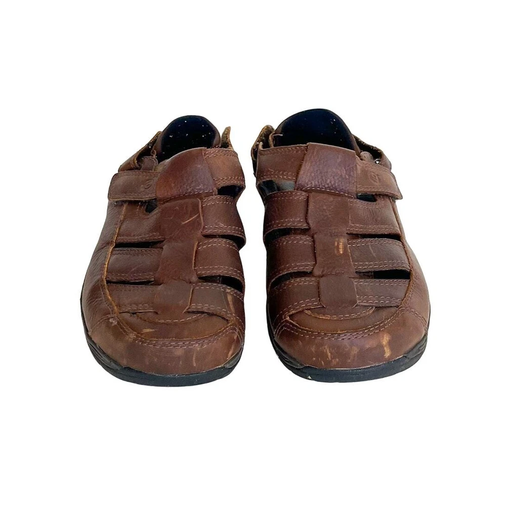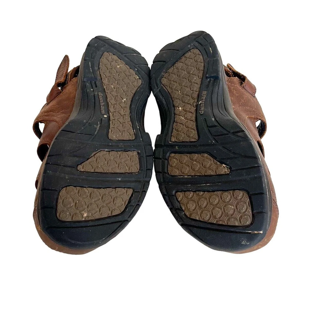 Brown Leather Closed Toe Chunky New Balance X Dunham Fisherman Sling Back Walking Hiking Camping Sandals Shoes Style #MCR456SB Adjustable removable back strap Rubber traction soles Leather upper Adjustable removable back ankle strap Hook and loop side closure Sz 10 platform 1" Good condition light distressing on leather see pics casual walking hiking camping