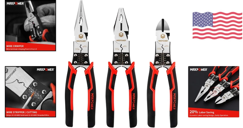 Durable 8-Inch Pliers Set for Wire Stripping and Crimping - Ergonomic Grip ‹ › ‹ › ‹ › ‹ › ‹ › ‹ › ‹ › ‹ › ‹ › Durable 8-Inch Pliers Set -For Wire Stripping and Crimping -Ergonomic Grip Features: 20% Labor Saving - Eccentric Labor-saving Design with Premium forged 60CR-V steel for strength and durability 5 in 1 Multifunctional - Pliers tool set provides Wire Stripping, Crimping, Cutting, Twisting, and Gripping functions Wire Stripper and Crimper Capacity - Strips 10-18 AWG solid and 12-20 AWG stranded wire; Wire terminal crimping from 0.5 to 2.5, wider than standard pliers set Crosscut Teeth - Help multiple wires stay in position while twisting. Hardened teeth can also be used as smoothing and shaping files Comfortable Grip - Environmental PP+TPR Handle, more cutting power over other cutting pliers Benefits: 20% labor saving design for easier use 5 functions in 1 tool for versatility Wide wire stripping and crimping capacity Crosscut teeth for secure wire twisting Comfortable grip for extended use Why choose our Durable 8-Inch Pliers Set? Upgrade your toolbox with our Durable 8-Inch Pliers Set, designed for wire stripping and crimping with ease. With a 20% labor-saving design and 5 functions in 1 tool, this set is perfect for all your wire work needs. The wide wire stripping and crimping capacity, along with the crosscut teeth for secure wire twisting, make this set stand out from the rest. Plus, the comfortable grip ensures you can work for longer periods without discomfort. Don't settle for subpar tools - choose our Durable 8-Inch Pliers Set for all your wire work projects! Shipping Free & Fast Shipping - We offer free shipping to most of the USA with a normal delivery time of 3-7 days. However, due to the current situation, additional delivery time (up to 3 weeks) may be required for some items. Alternative Carriers - We may use alternative carriers (e.g. USPS, FedEx, UPS, etc.) to ensure your package arrives safely and on time. Due to the use of multiple carriers, we are unable to provide a tracking number automatically. Handling Time - Orders are processed and shipped within 1-2 business days of receiving cleared payment. Shipping Restrictions - Shipping to Alaska, Hawaii, Puerto Rico, Guam, and other US territories may incur shipping charges or delivery restrictions. Please contact us before ordering, or your order can be refunded/cancelled. State Restrictions - There may be restrictions based on your state of purchase. For example, certain items may not be shipped to California due to state regulations. Contact for Tracking Updates - If you require tracking updates or have any concerns about the delivery of your order, please feel free to contact us, and we will be happy to assist you. Return 30-Day Hassle-Free Returns - We want you to be completely satisfied with your purchase. If you are not, you can return the item within 30 days of receiving it for a full refund or exchange. Easy Return Process - To start a return, simply contact us and we will provide you with a prepaid return shipping label and detailed instructions. Restocking Fee - There are no restocking fees for returns. However, the buyer is responsible for return shipping costs if the return is not due to a seller's error. Refund Processing Time - Refunds will be processed within 5 business days of receiving the returned item in its original condition. Payment We accept all major credit cards, PayPal, and Apple Pay for your convenience. Your payment information is secure and encrypted to ensure a safe and seamless transaction. Please complete your payment within 3 days of purchase to avoid any delays in shipping. Feedback Your feedback is extremely important to us. We strive to provide the best products and customer service possible. If you are satisfied with your purchase, please take a moment to leave us a positive review. If you have any concerns or issues with your order, please contact us before leaving negative feedback. We are committed to resolving any problems and ensuring your satisfaction. Contact Us If you have any questions or concerns, please feel free to reach out to our customer support team. You can contact us through the eBay messaging system. We are available Monday to Friday, 9:00 am to 5:00 pm EST, and we will do our best to respond to your inquiry within 24 hours. Thank you for supporting our small family business!