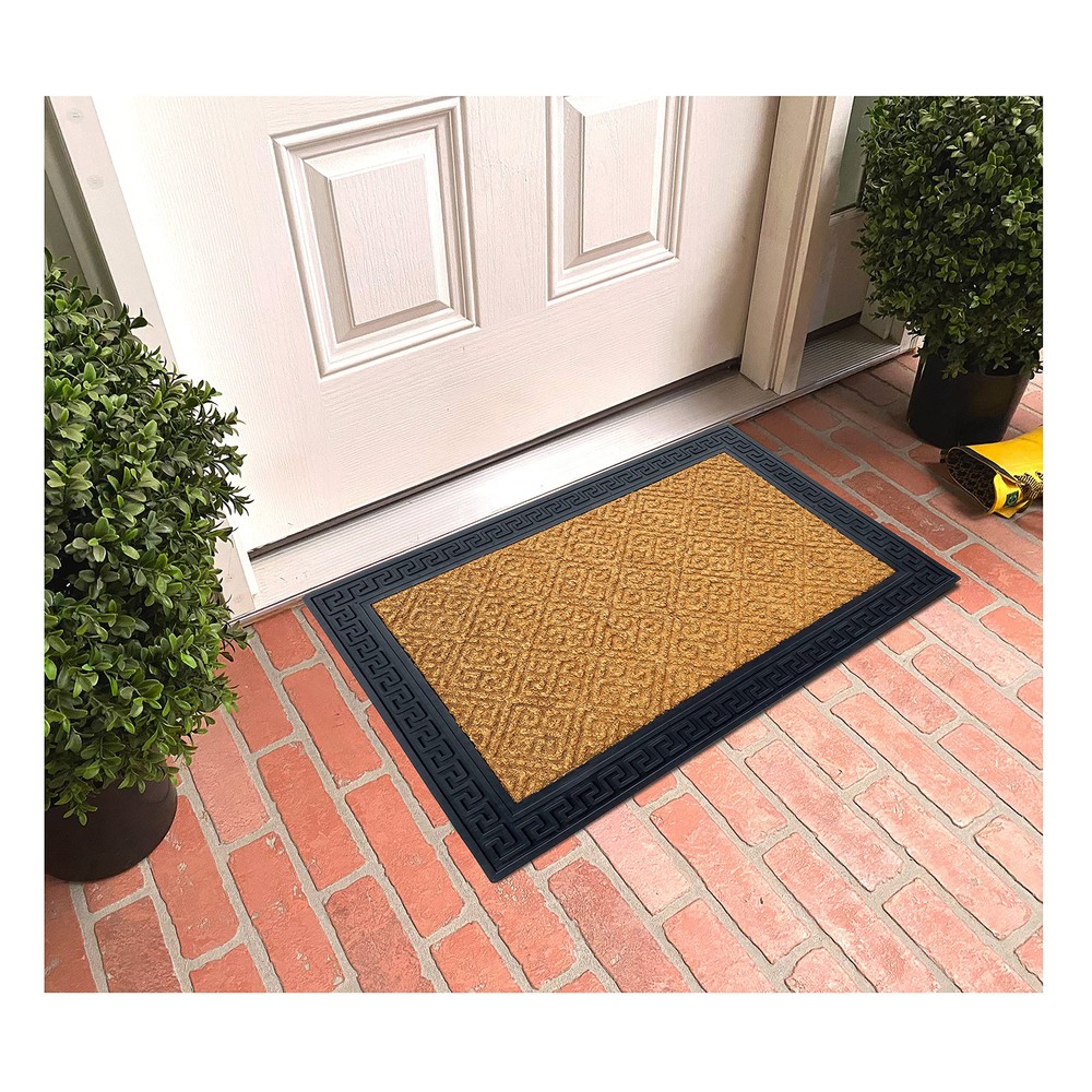The beautiful combination of coir and rubber in this doormat make a stylish reception for your guests. While the heavy-duty rubber adds weight and elegance, the coir acts as a scraper on shoes to keep debris from entering your home. The low-profile height makes this mat an excellent choice for mud rooms, basements and garages as well as porches. Sweep or hose clean. All-season Heavy-duty, 100% rubber that won’t crack or buckle Coir center that scrapes shoes clean Low-profile for mud rooms, garages and porches Makes a great gift!
