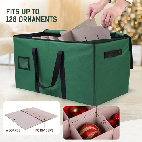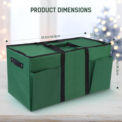 Lambada Christmas Ornament Storage Box, Durable Christmas Storage Container with Adjustable Dividers, Xmas Decorations Organizer – Fits 128 Holiday Ornaments 3 inch – Tear-Proof Fabric (Green) LuxeFusion Product Description Features 🎄【Extra Large Capacity】The ornament organizer storage box is spacious enough to accommodate up to 128 Christmas ornaments, each measuring 3 inches. The container consists of 6 boards and 48 dividers, providing you with the flexibility to store and organize holiday ornaments. Dimensions: 25.5" x 12.7" x 13.5". 🎅【Durable & Sturdy】This ornament organizer is constructed from 600D oxford nonwoven fabric, offering breathability and waterproof properties that provide superior protection for your Christmas decorations. The fabric is 100% tear-proof, ensuring that the storage box can be used for many years without breaking. ❄️【Thoughtful Features】This Christmas container features premium dual zipper closures with double stitching, providing exceptional durability. Additionally, there are two extra-large pockets for storing Irregular shape ornaments. Furthermore, a transparent card slot is designed for easy labeling. 🏵️【Easy to Transport and Storage】Sturdy handles on both sides of the Christmas ornament storage make it easy to transport from one room to another, while longer handles on the top of the box allow you to lift and move it with ease. It can also be folded to save space for convenient storage. 🎁【Beautiful Design】The dividers are made from sturdy cardboard, and the adjustable design enables you to store ornaments of various shapes. You can easily add or reduce dividers to accommodate the specific shape of ornaments you intend to store. Product Details Brand: Lambada Color: Green Material: Polycotton Special Feature: Transparent Recommended Uses For Product: For Christmas Ornaments Product Dimensions: 13.58"L x 13.78"W x 2.76"H Capacity: 3 Cubic Inches Closure Type: Zipper Water Resistance Level: Waterproof Item Weight: 6.28 Pounds Opening Mechanism: Zipper Number of Items: 1 Number of Compartments: 6 Unit Count: 1.0 Count Item Package Quantity: 1 Occasion: Christmas Item Weight: 6.28 pounds Manufacturer: Lambada 🚚 Free Shipping All orders ship free and fast to your doorstep. 🔁 Easy Returns Satisfaction guaranteed. 30-day returns, no questions asked. 💬 24/7 Support Contact us anytime; we’re here to help, day or night. Brought to you by LuxeFusion – Quality you can trust.