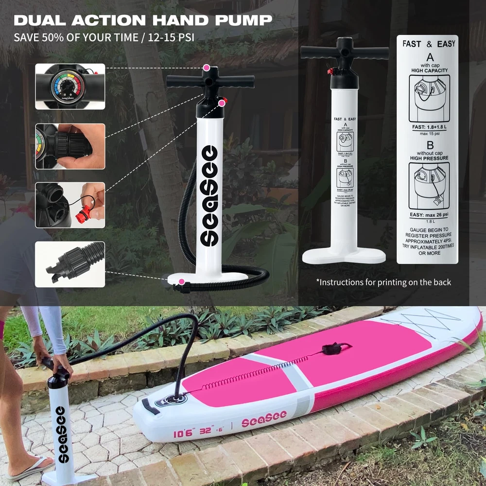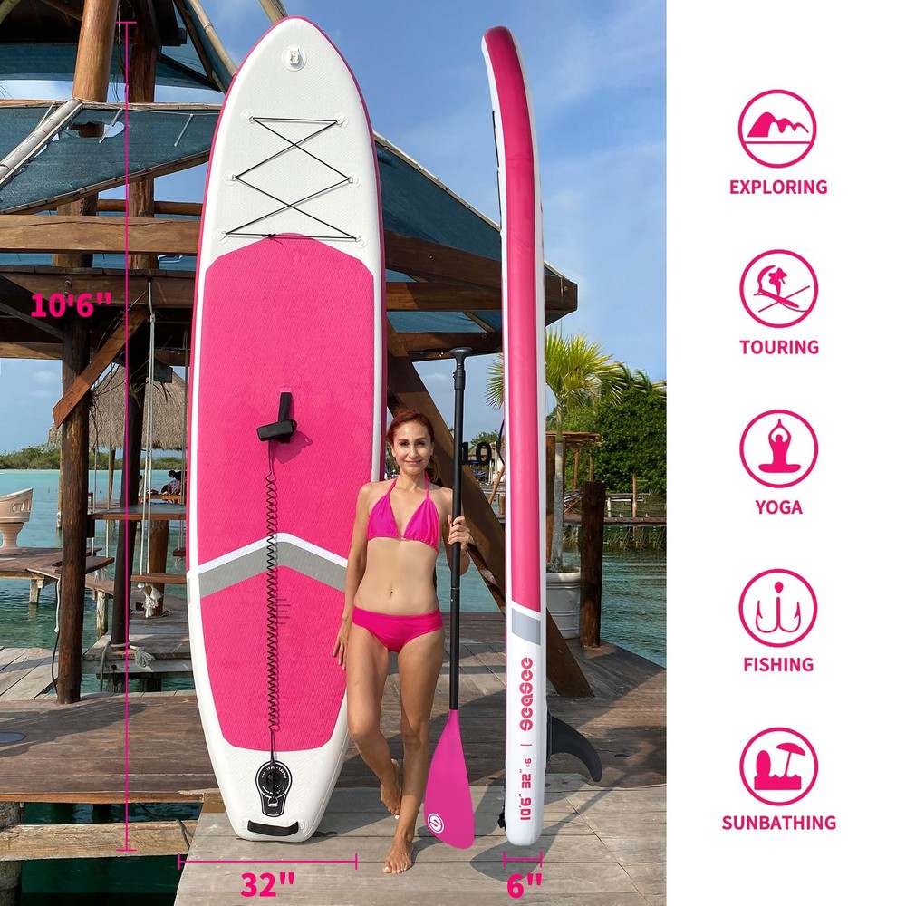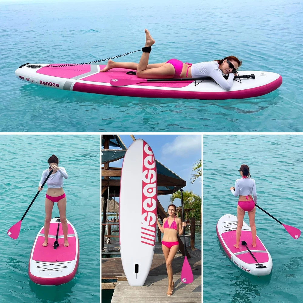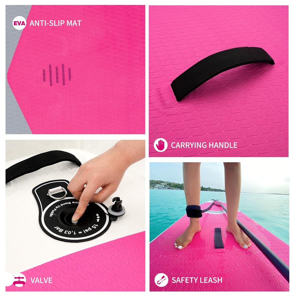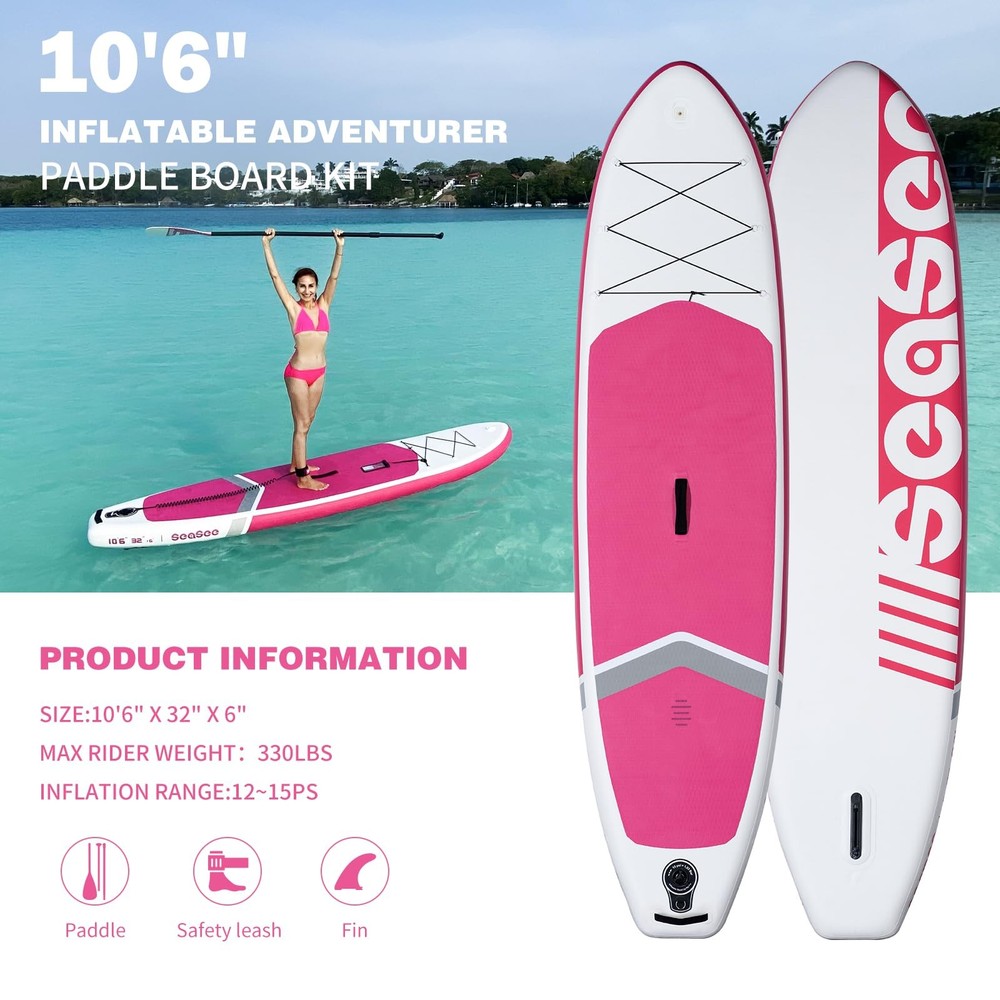 Premium Paddle Board, designed for ultimate stability and functionality. Our paddle board features a widening design that provides exceptional stability, making it perfect for individuals with heavier body weights. Whether you are into fishing, water yoga, brief water travel, or meditation, this paddle board is versatile enough to suit all your needs. We have incorporated thoughtful design elements into our paddle board, including a multitude of D-rings for securing your gear, a convenient camera holder for capturing your adventures, and a sturdy rear handle for easy transport. The inflatable nature of our paddle board ensures that it is easily foldable and doesn't take up much space in storage. Please ensure to rinse it thoroughly after use to maintain its longevity. Included with the paddle board are high-quality accessories such as a bidirectional pump for quick and easy inflation, a 3-section propeller for smooth gliding through water, and a double swivel foot rope for added safety. Perfect for adults looking for an inflatable paddle board that excels in stand up paddle activities, our Paddle Board is a top choice for water enthusiasts. Premium Material: The paddle board is made of high-density polyethylene material, which is sturdy, durable, and not easy to damage. The surface is wear-resistant and has a good anti-slip effect. Stable Structure: The stand up paddle board has a stable and wide design, with a maximum load capacity of 330lbs. The thickness of the board is 6in, which provides good buoyancy and stability. Easy to Carry: The paddle board is lightweight and foldable, with a carrying bag included, which is convenient for you to carry and store. The package size is 35.4. Exclusive Camera Mount: Want to share your life? Want to record your happy time with your friends on water? We specially add a Sport camera bracket mount on inflatable stand up paddle board, install your sport camera on the paddle board directly,start to record your fun time on water! SUP Accessories: Floating paddle , double action hand pump with psi gauge, 1 removable fin, safety leash, SUP manual, repair kit and a backpack. Just put all in your backpack and you've got everything you need to hit the water
