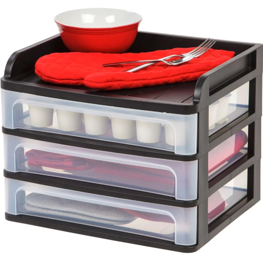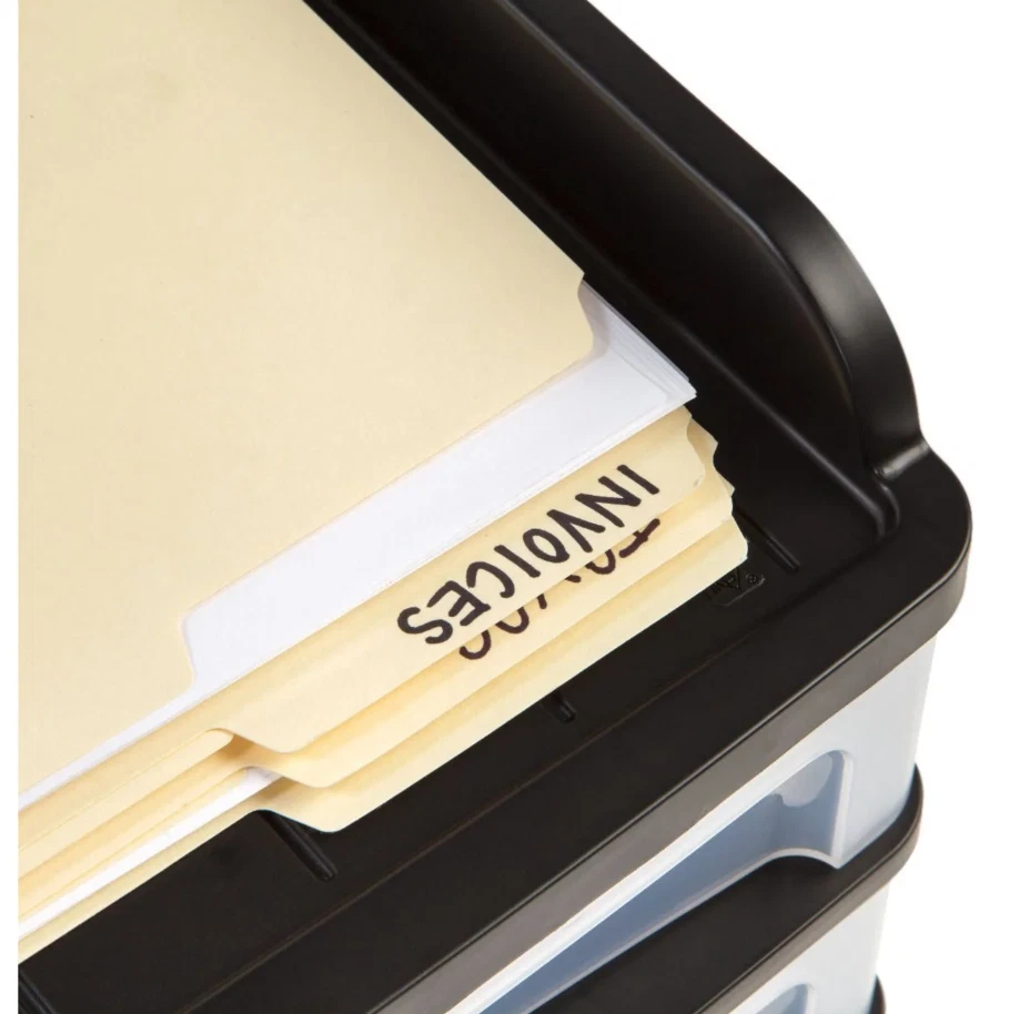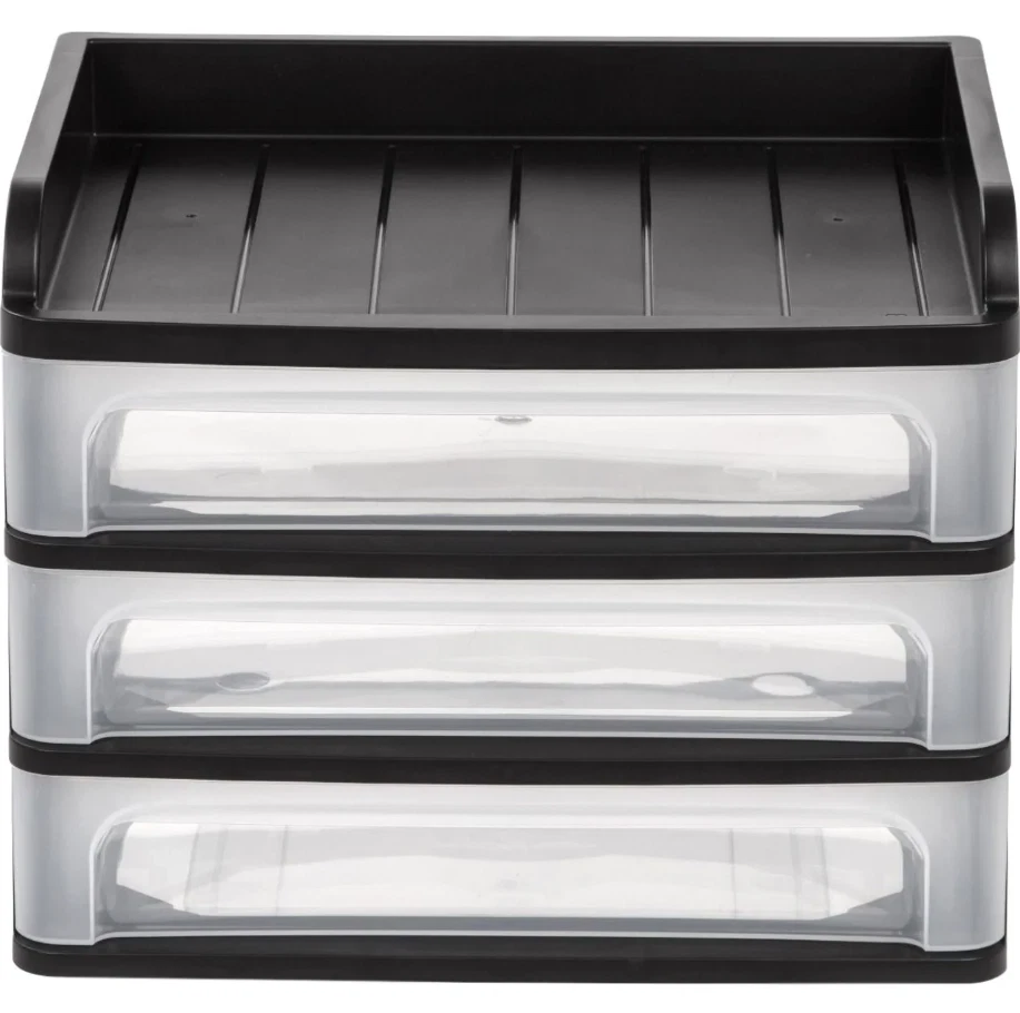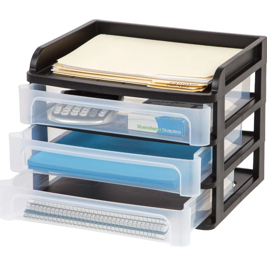 Keep office supplies, notepads, and paperwork close at hand with this desktop drawer system. Three pullout drawers with clear fronts make it easy to organize receipts, 8.5" x 11" paper and notebooks, and small office essentials, while the open-top tray provides a handy place to stash frequently referenced file folders. Durable plastic construction stands up to everyday wear and tear. Number of Compartments: 3; For File Size: Letter; Load Orientation: Front; Color(s): Black/Clear. Number of Compartments: 3 Global Product Type: Horizontal & Stacking Desktop Document Racks & Sorters For File Size: Letter Load Orientation: Front Color(s): Black/Clear Color Family: Black Material(s): Plastic Width: 14.25" Depth: 11.88" Height: 11.25" Product Biodegradability in Days: 0 Pre-Consumer Recycled Content Percent: 0% Post-Consumer Recycled Content Percent: 0% Total Recycled Content Percent: 0% Compact, space-saving design ideal for any workspace Maximize desk space with a sleek, functional unit Perfect for individual use or lining up multiple units for expanded storage Made with premium materials for long-lasting durability Smooth glide drawers for easy, hassle-free access to stored items Walled open top provides extra storage for supplies or display options Versatile organizer, suitable for accessories, tools, or small bathroom supplies Ideal for keeping your desk clutter-free and organized Stylish and practical addition to any home, office, or craft space Enhances productivity by keeping essentials neatly within reach