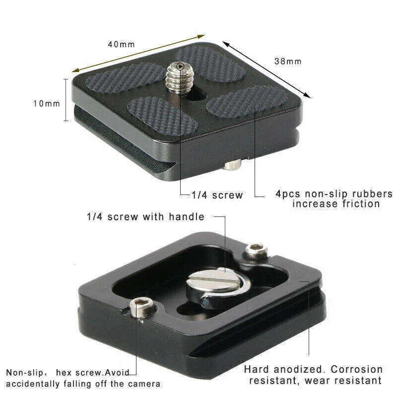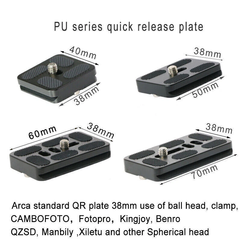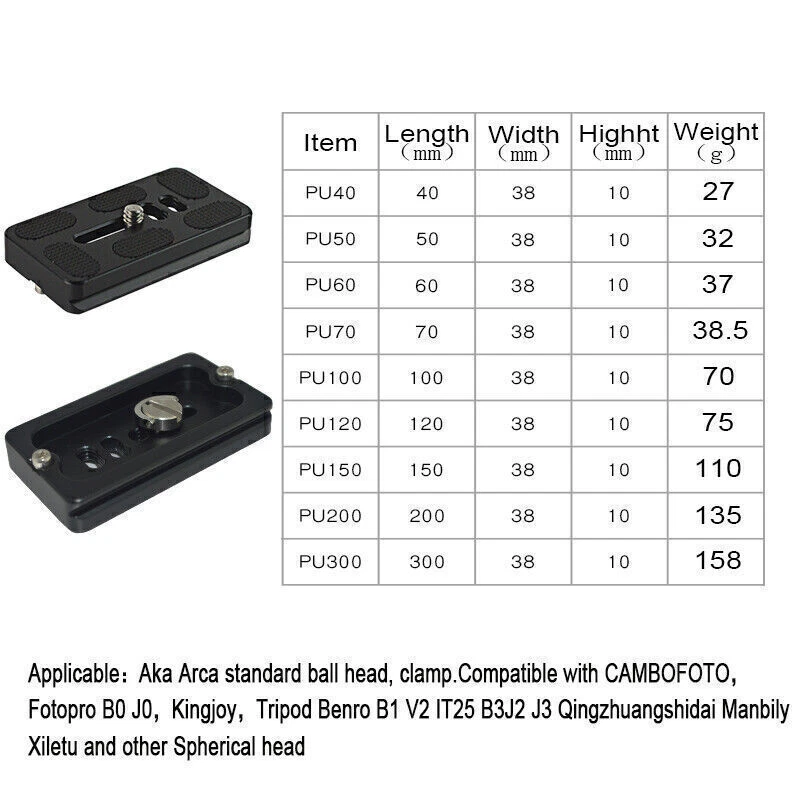 Product Description If you have any questions, please contact customer service first, do not open disputes easily, thank you! Feature: High quality,100% brand new Camera quick release plate for digital camera. Different size is available. Made of aluminum alloy material, the surface features anode anti-oxidation treatment. Use 1/4" screw wrench for easy installation. Specifications: Model: PU-25/40/50/60/70/100/120/150/200/300 Material: Aluminum Standard: Arca Swiss Color: Matt Black Technology: Anodic oxidation Camera screw: UNC1/4 ring screw Compatible With: Arca-Swiss standard quick release plates, including for Benro / Arca Swiss / Acratech / Kirk / Wimberley / Gitzo / Manfrotto, etc. Package included: 1 x Quick Release Plate 1 x Screw Payment We accept paypal payments and all payments authorized by eBay. Shipping 1.We ship to your eBay or Paypal address. Please make sure your eBay and Paypal address is correct before you pay. 2.Items will be shipped within 1-3 business day when we received payment. 3.Delivery time depends on destination and other factors; 4.International buyers please note: a.Import duties, taxes and charges are not included in the item price or shipping charges. These charges are buyer’s responsibility. We will try our best to reduce the risk of the custom duties. b.Please check with your country's customs office to determine what these additional costs will be prior to buying. Contact Us If there is any questions, just contact us via ebay message, we will answer within 24 hours and will definitely solve your problems. powered by On May 11, 2023 at 06:04:50 PDT, seller added the following information:
