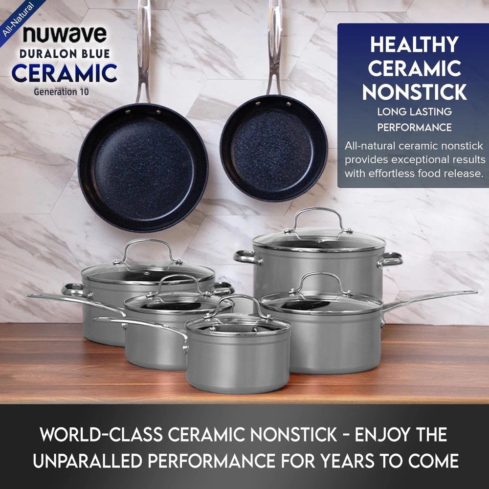 PREMIUM FORGED CONSTRUCTION – Forging makes the cookware strong and durable yet lightweight and easy to handle. It is a work-of-art where form meets function. It is constructed to perform well under any situation at any skill level. HEALTHY DURALON BLUE COATING – The eco-friendly, ultra-non-stick Gen10 Duralon Blue is all-natural ceramic coating free of harmful chemicals like PFAS*, PTFE, PFOA, lead, and cadmium. It also does not emit toxic gases at higher temperatures. *Tested by TÜV Rheinland for 106 known PFAS elements and none were detected. GENERATION 10 (G10) CERAMIC – For more than a decade, we have continuously perfected our Duralon Ceramic Coating. G10 Duralon Blue is exceptional in every category. It heats fast and evenly; releases food effortlessly; and is extraordinarily durable. The ceramic coating is not *chemically* nonstick but gets pretty darn close. DURALON BLUE HARDNESS – Hardness is rated at 9H. Since diamond is rated at 10H, it is extremely strong. It has HIGH resistances to abrasion, corrosion, and acid meaning. It won’t chip or discolor and will retain its non-stick properties longer. INDUCTION READY & EVEN HEAT DISTRIBUTION – Every cookware is bonded and reinforced with anti-warp SS plate on the bottom to make it induction ready. This bonding delivers fast, even heat distribution, and superior heat retention at any temperature.