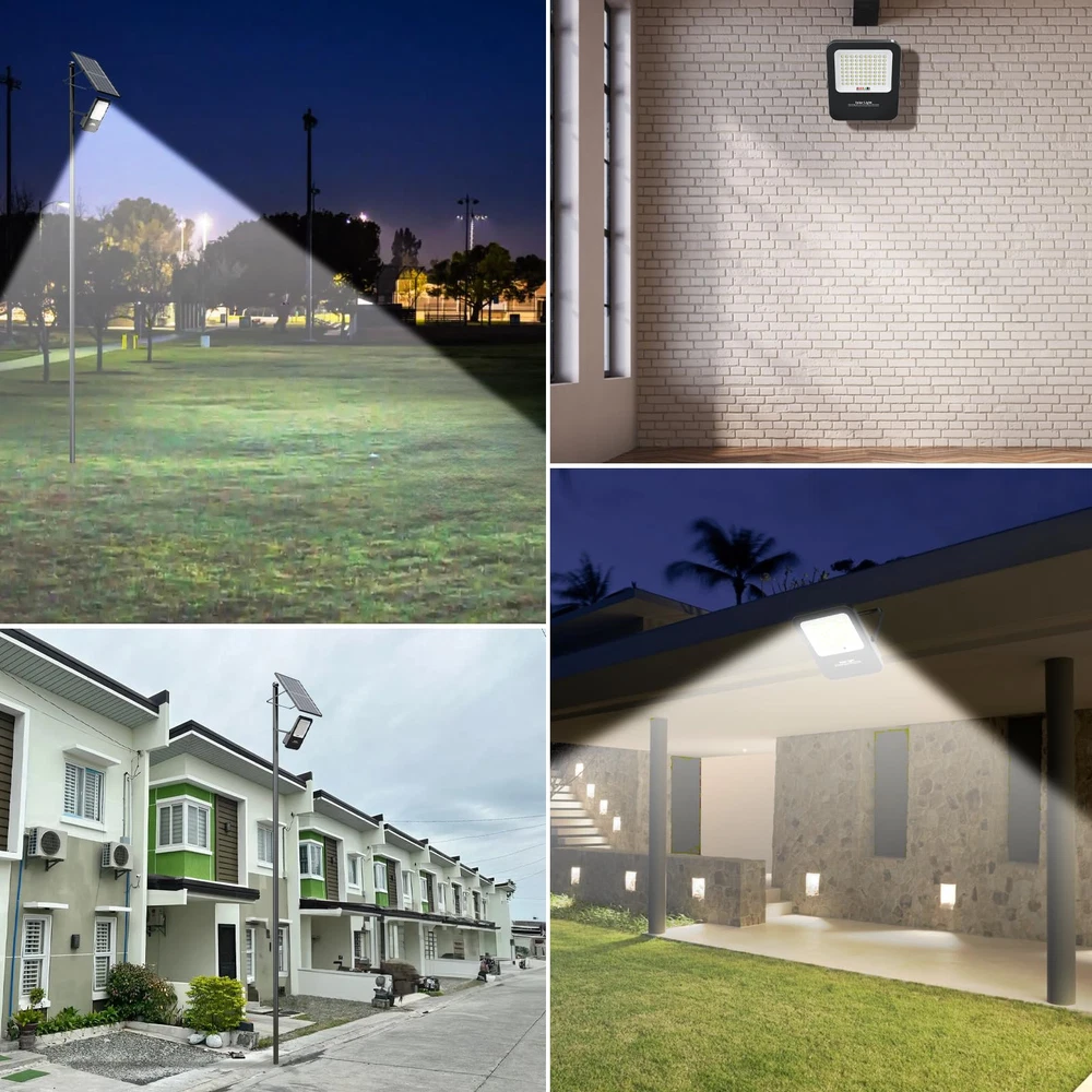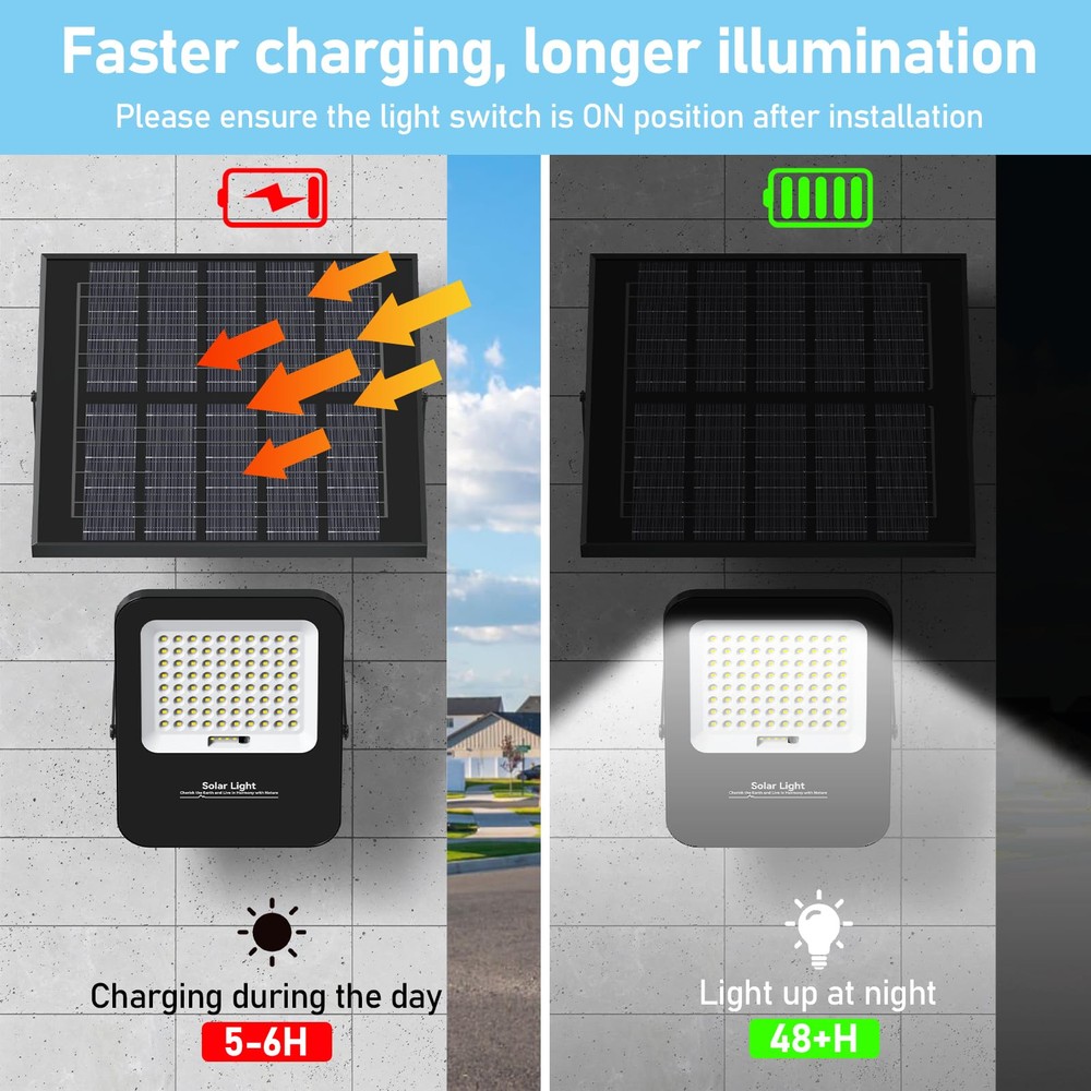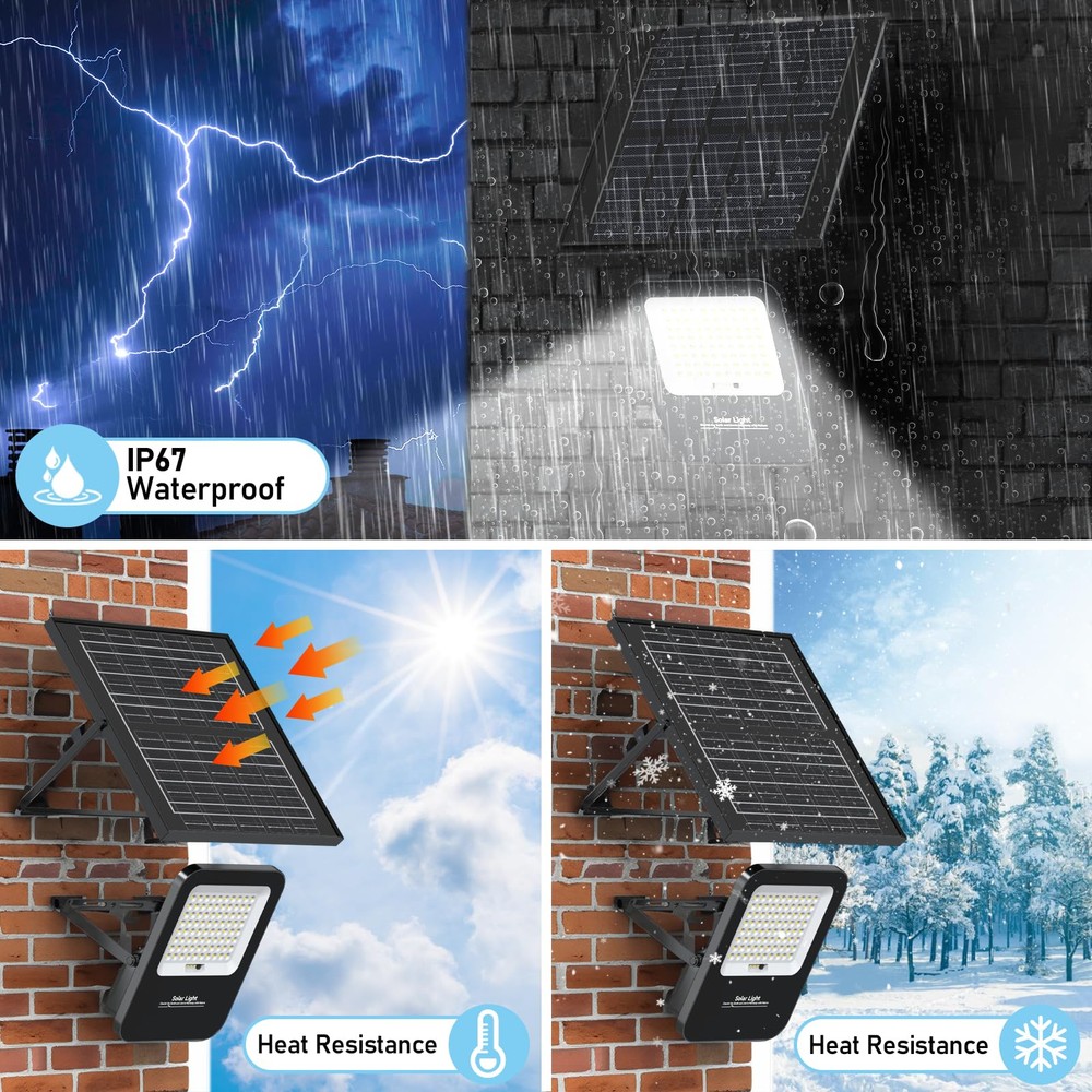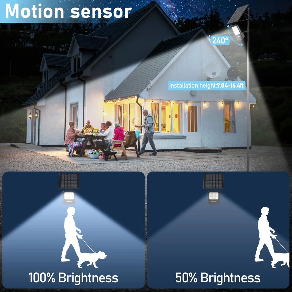 180° Adjustable Angle: The lighting angle of the hanging street light can be adjusted up and down 180°, you can easily adjust to different lighting angles according to your needs. Indoor lighting can be achieved through a 16.4 feet cable between the floodlight and the solar panel, and can be used for both indoor and outdoor lighting IP67 Waterproof Level: Our solar flood lights outdoor are designed to be waterproof and weatherproof to withstand rain, snow and other harsh weather. Ensure optimal performance and reliability of solar street lights in different weather conditions Motion Sensor: Solar-powered security lights equipped with motion sensors offer added safety and security by illuminating outdoor spaces when motion is detected. This deters intruders and improves visibility during nighttime.100% brightness when the object is in motion, 50% energy-saving brightness when the object is out of the way 0 Electricity Bill: Solar lights typically have fewer components compared to traditional lighting systems, resulting in lower maintenance requirements. With no wiring or cables to manage, maintenance costs and efforts are significantly reduced.Especially in remote or off-grid areas where access to electricity may be limited or costly. They offer a reliable lighting source without the need for grid connection Easy Installation: Solar lights are easy to install since they don't require complex wiring or trenching. This makes them suitable for various applications, including outdoor lighting for gardens, pathways, parks, fence,yard and streets