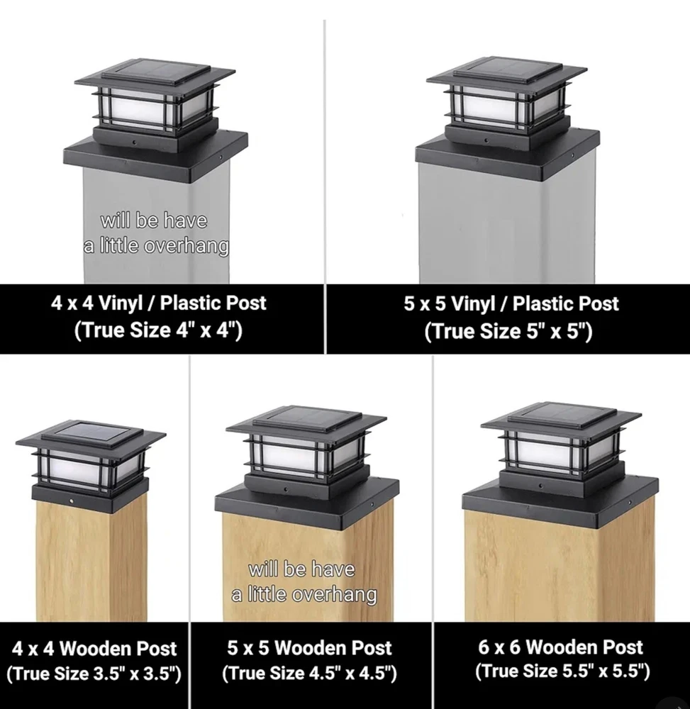 PLASTIC DANCING FLAME SOLAR POST LIGHTS: 8 pack modern post cap lights powered by solar, each with 72 pcs yellow SMD LED, they are the perfect decorative outdoor lighting and no electricity required. Solar LED flickering flameless candles lights, add a 360 degree viewing angle illuminate charming to your garden, decorate your fence, deck, porch or yard. Measurement: 5.8 x 5.8 x 3.54 inches DANCING FLAMES LIGHTS: A safe alternative to the real flame effect - 72 pcs high brightness SMD LEDs cast a safe, soft and gentle glow, produces a very calm and impressive atmosphere. When night comes, it lights up and the LED flame light leaping, which will bring you a beautiful scenery. There are 2 LIGHTING MODE - FLAME and ON, if you want flame effect, please turn to FLAME. Please note that they are designed for outdoor decoration, maybe not bright enough, but the light is soft and gentle SOLAR POWERED: This beautiful solar light is NOT electricity needed. Powered by solar, charged in full and direct sunlight for 6-8 hours. There is a tab at the back of the solar panel, please remove it before charging, so that this solar LED lights will automatically turn on at night and turn off at dawn. For your convenience, each include 1000MAH NI-MH AA rechargeable battery EASY TO ASSEMBLE: Complete with detailed instructions. Our fence post solar lights come with different sizes of bases, which are compatible with any standard true size 3.5"x3.5", 4"x4", 4.5"x4.5", 5"x5", 5.5"x5.5" wood / vinyl / plastic post cap. These solar garden lights can be done in a few minutes, comes with mounting kit, simply screw the solar cap lights into highest point on the railing OUTDOOR DECORATIVE LIGHTS: These 8 pack garden flickering flame post lights can work normally under kinds of weather with the waterproof rating of IP44, no worries about little rain, snow, frost, or sleet. They can be placed in the front, backyard, along driveway, walkway, sidewalk, around your patio or porch, adds a modern look for your outdoor lighting. In stormy weather, keep the solar lights indoors to avoid damaging the solar panels
