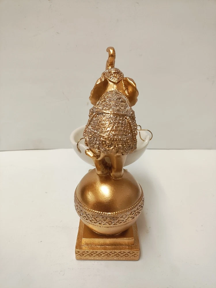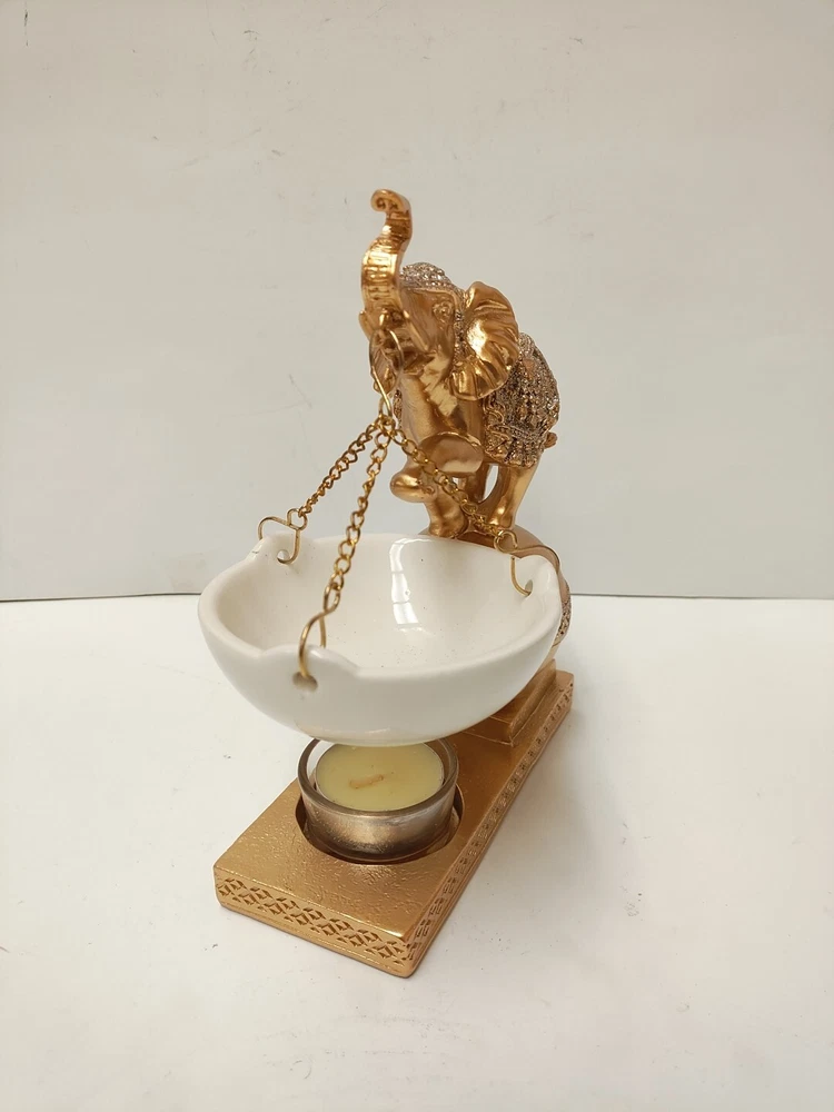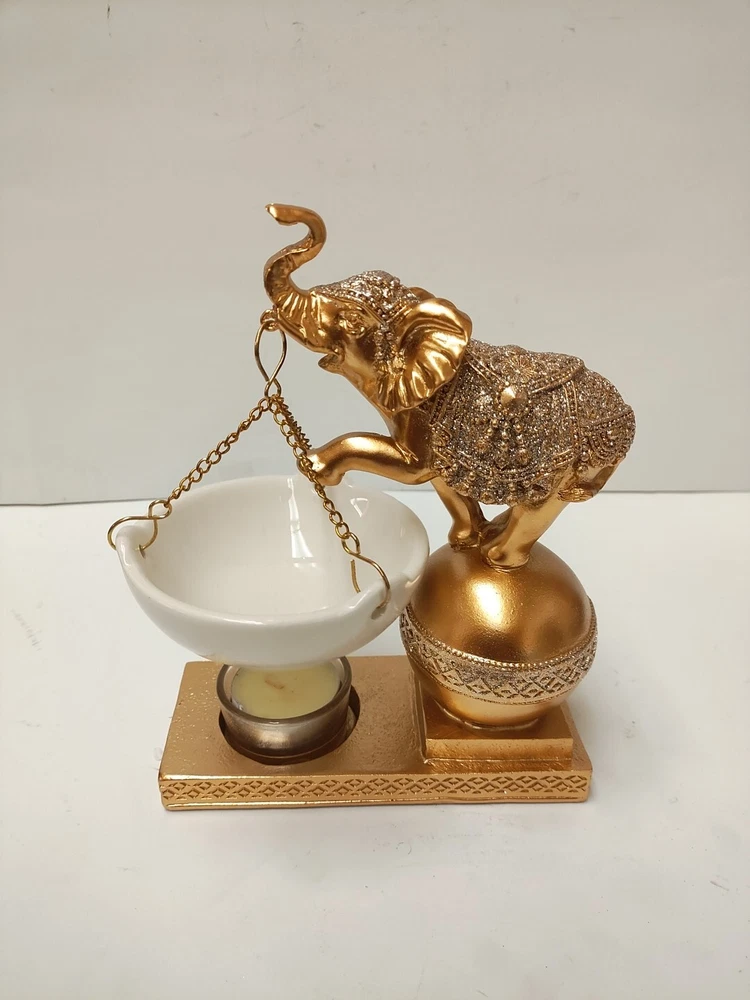 Dynasty Gift Inc Gold Elephant Incense Burner Figurine QMH15778-48 Elevate your home decor and aromatherapy experience with the captivating Gold Elephant Incense Burner Figurine. This stunning resin piece commands attention with its regal, gilded design. • Elegant, eye-catching elephant figurine • Made from high-quality, durable resin • Holds standard incense sticks or cones • Adds a touch of tranquility and sophistication to any space Bring the majestic beauty of the elephant into your home with this exquisite incense burner. The intricate, golden details create an air of opulence, while the incense-holding compartment allows you to fill your space with soothing, aromatic scents. Whether displayed on an end table, bookshelf, or mantel, this figurine is a sophisticated addition that will elevate your decor.