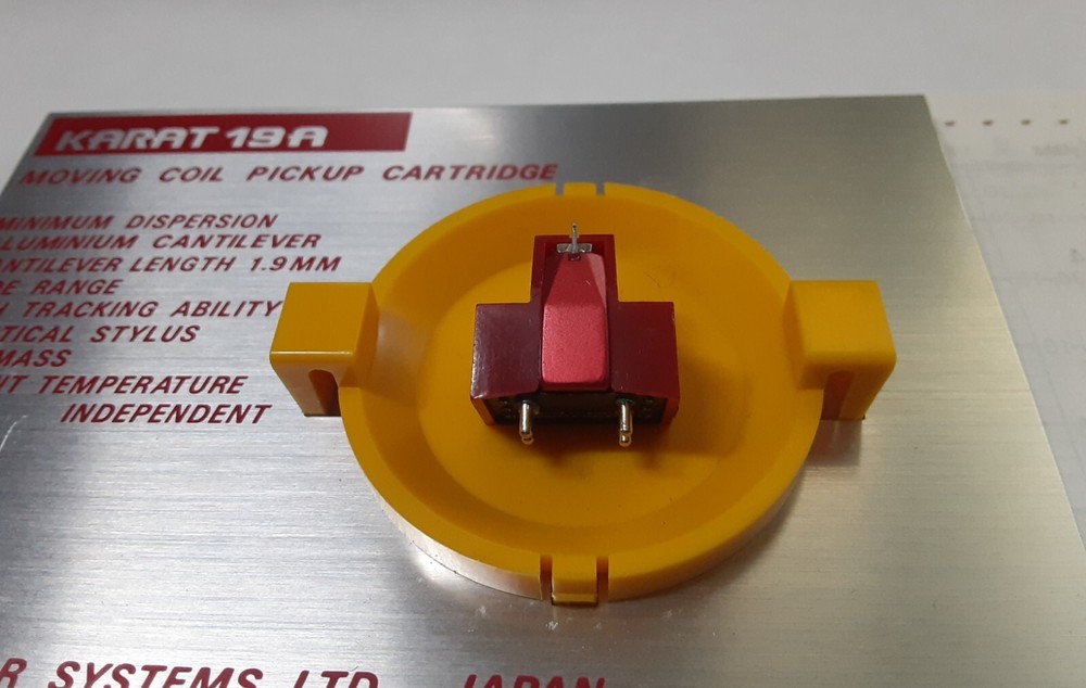 Dynavector Karat 19A rare phono cartridge for sale. This is low output moving coils type. The cartridge has tapered cantilever with super elliptical stylus. The cartridge is in very good operational and cosmetic condition. It has 250 hours and could be played for another 2000 with no issues. Specifications: Output:0.25 mV Tracks:1.5-2.0 g Loads:> 100 Ohm Unloads:32 Ohm Compliance:14 Sell: $525 Shipping inside USA is $6 Worldwide shipping is $23