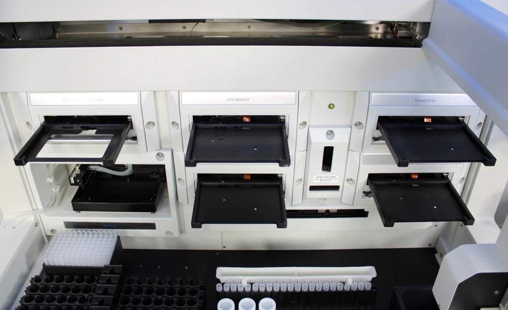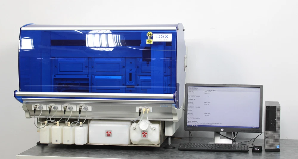 ebay template Index 24827 You Will Receive: - Dynex DSX 4-Plate Automated ELISA Processor - Computer with Revelation DSX v6.24 Installed - Monitor, Keyboard, and Mouse - x2 Communication Cables - x3 Power Cables - 90-Day Warranty Included with ELISA Processor: - x4 Incubator Modules - 4-Position Drawer with Carriers - Plate Reader Module - Plate Washer Module - Vertical and Horizontal Barcode Scanners - x7 Scannable Sample Racks (holds 14 samples each) - Reagent Tip Rack with Integrated Reagent Tube Rack - Tip Waste Chute - Control Rack - Dilution Strip Well Rack - Deep Well Plate Rise for Dilution - x4 Wash Reservoir Bottles - Tip Wash Container - Liquid Wash Bottle - Door Lock Bypass Key - Carton of tips (5 box, 105 tips per box) Not Included: - Reagents - Calibration Tools - Battery Backup Fully Tested and Working Without Issue: After its initial disinfection and inspection, our technicians tested the Dynex DSX 4-Plate Automated ELISA Processor with the following results: - Powers on, initializes, and passes all self-tests: PASSED - Ran dozens of checks on every module: PASSED - Moved plates to all valid locations: PASSED Specifications: Manufacturer DYNEX Technologies Model Dynex DSX Serial No. 1DXC-1582 Sample Capacity 96 samples (98 positions are available) Reagents Capacity 24 Controls and/or Standards 33 Sample Pipetting Tips 432 Reagent Pipetting Tips 41 Wash Buffer Bottles 4 bottles, 2 liters each Waste Container 8 liters Ambient Drawer Module Incubation Temperatures Ambient plus 5°C Incubator Module Incubation Temperatures Ambient plus 7°C to 50°C Blanking Air Individual, paired or average wells Whole plate or last plate Row or column Each well on the plate Wavelength Modes Single, dual or multiple Standard Curves Linear, quadratic, cubic, quartic, spline, polygon, sigmoid or Akima Additional Data Analysis Threshold, ratio, spreadsheet and QC equations Flexible Template Up to eight different well types. Software Revelation DSX v6.24 Power rating 100-120V, 50/60Hz 200-240V, 50/60Hz Power consumption 800VA Dimensions (W x D x H) 40.5 x 35 x 32.5 in Weight 300 lb (136 kg) 90 DAY WARRANTY This instrument is backed with a 90-day warranty, protecting you against breakdowns and damage. Fast Response Reach out to us by sending a message and you'll get a response from us fast. Quality Inspection Our instruments are inspected, tested, repaired, serviced and supported by our technicians. Save 30-80% off retail Save 30% or more when you buy professionally inspected, preowned equipment. DOESN'T FIT YOUR BUDGET? LOOKING FOR SOMETHING ELSE? FOR POTENTIAL DISCOUNTS OR ALTERNATIVE PRODUCTS, Contact Us WE SHIP WORLDWIDE You will receive your instrument undamaged or we cover the damage SOME TRUSTED CUSTOMERS INCLUDING WHAT OUR CUSTOMERS SAY We're a start-up, so there are time pressures to produce as soon as possible. Because we placed an order through New Life Scientific for a used Lyophilizer, we were able to get that super fast, so we could move forward. We also placed an order around the same time for a new, larger one that we would use to scale-up; we're still waiting for that one. We've been able to do a ton of work with the one we bought from New Life Scientific because we were able to get it so fast. - John Green We're a start-up and growing very fast. We recently moved to a new facility and had to purchase our own equipment, as we were sharing before. I looked at a few local refurbishing companies. I wouldn't say I had bad experiences, BUT I had only good experiences with New Life Scientific. They are very responsive, especially Micah. Not only were we able to get the equipment we needed quickly, most of our questions are answered within 24 hours... - Reetu Singh We are very fortunate to have found New Life Scientific.We were able to acquire the equipment that we needed at a very reasonable price. I could not be happier with the piece of equipment that I was able to get through New Life. I feel very lucky. The entire experience from ordering, shipping, and the support we've received after the sale has been great! They really make me feel like an important customer. Since we're a new company, it allows us to... - Yogendra Shrestha Sell Smarter with Kyozou. Inventory and Ecommerce Management