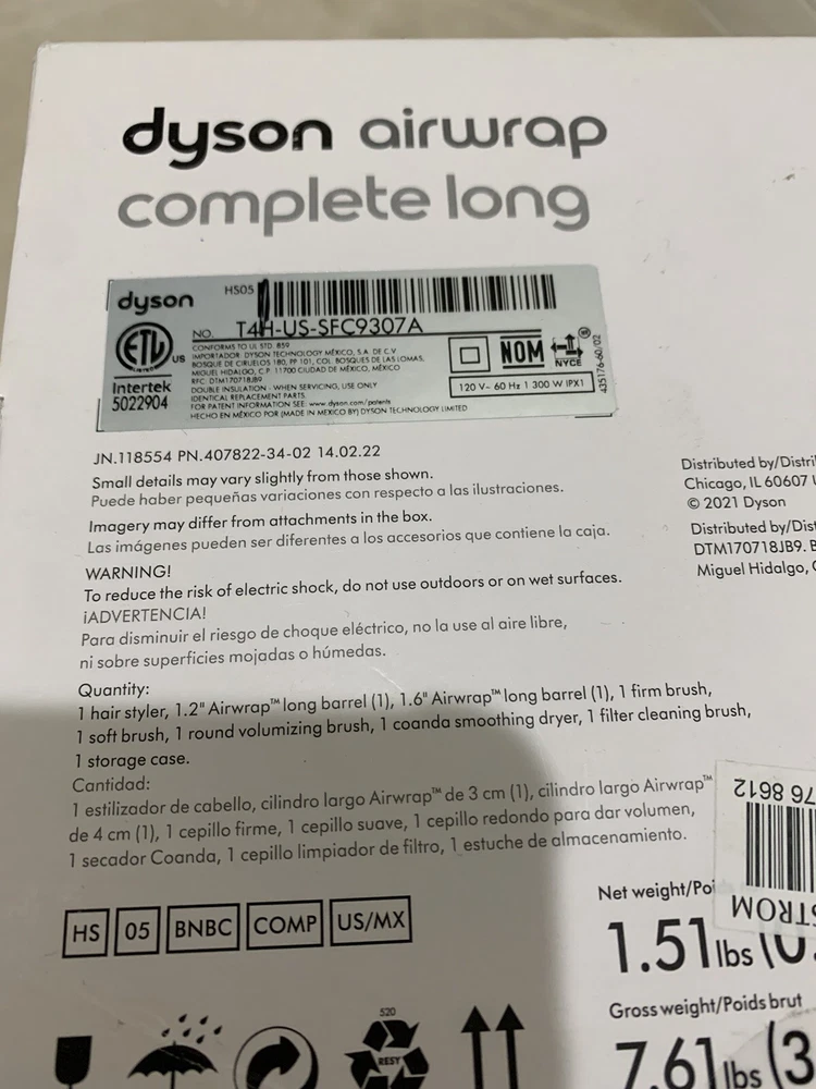 Dyson Airwrap Multi-styler Complete Long (Silver | NIckel). Dyson Airwrap Complete Styler Set Includes Airwrap styler 1.2" Airwrap barrels 1.6" Airwrap barrels Firm smoothing brush Soft smoothing brush Round volumizing brush Pre-styling dryer Storage case Non-slip mat Filter cleaning brush