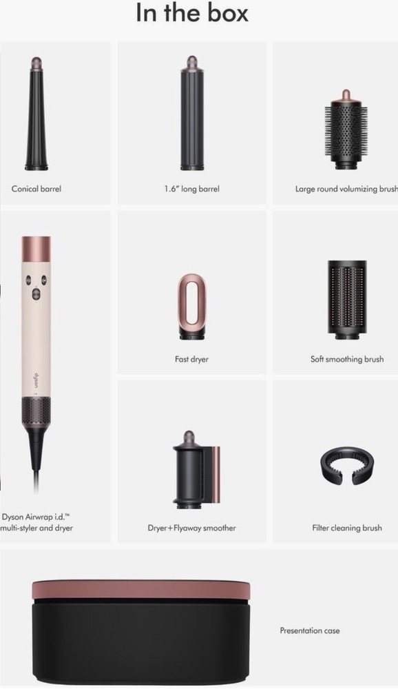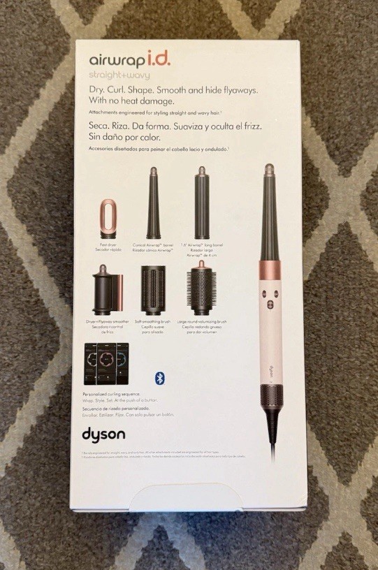 Sealed, brand new in box. Ships ASAP for free. What it is: The Dyson Airwrap™ now with a Bluetooth enabled curling feature through the MyDyson app for one touch, personalized styling. A faster, easier way to achieve more consistent curls with no heat damage.^ Includes barrels to curl or wave, dryers to prepare and finish and brushes to shape, smooth and volumize. What it does: The only connected multi-styler to recommend a personalized curling routine according to your hair and styling profile. Dries and styles simultaneously using the Coanda effect, no heat damage. Six versatile attachments engineered to dry, curl, shape, smooth, and hide flyaways for straight and wavy hair. i.d. curl™ helps to create perfect curls, every time. Features and benefits: - Bluetooth® wireless technology enabled to create a personalized curling routine according to your hair profile in the MyDyson™ app -Coanda styling pioneered by Dyson: The Dyson Airwrap™ multi-styler harnesses an aerodynamic phenomenon called the Coanda effect. It uses air to attract and wrap hair to the barrel or surface of the brush - Powered by the Dyson digital motor V9: The 13-blade impeller spins at up to 110,000rpm, generating 3.2kPa. Powerful enough to produce the air pressure that creates the Coanda effect - Intelligent heat control: Measures airflow temperature over 40 times a second, intelligently controlling the heating element to prevent heat damage - Negative ions: Charged particles in the airflow help reduce static in the hair Key controls: - i.d. curl (compatible with barrel attachments) - once set up in the app, simply slide the machine on to activate your personalized curling routine - Airflow speed - Three precise airflow speeds to suit your styling preference - Temperature control - Three precise heat settings - Cold shot - Immediately deactivates the heating element for cooler air to set your style Includes: -Airwrap i.d.™ Multi-styler and Dryer Straight+Wavy - Conical barrel to style close to the root, for defined curls in all hair types - 2-in-1 Dryer+Flyaway smoother to dry damp hair and smooth finished styles with the Coanda effect - Large round volumizing brush to add body and shape longer hair as it dries - Soft smoothing brush to gently align and smooth fine hair with increased control for straighter styles - 1.6" Airwrap™ long barrel to create voluminous curls and waves in both directions - Fast dryer to take hair from wet to damp so it's ready for stylings - Filter cleaning brush to quickly clean your Dyson Airwrap™ filter - Presentation case to protect and neatly store your Dyson Airwrap™ multi-styler and attachments with a removable lid that is also a non-slip mat for your Airwrap™ How to connect: - Download the MyDyson™ app and create your account. - Plug in and power on your Dyson Airwrap i.d.™ multi-styler and dryer and add machine to the app. Bluetooth® wireless technology must be enabled on your mobile device. - Follow the steps in the MyDyson™ app to pair your Airwrap i.d.™. Airflow will be active as you pair. - Once paired, power off your Airwrap i.d.™. Continue set-up in the app to enable features such as the i.d. curl™ personalized curling sequence. - Take the simple quiz on the app to set up your personalized hair profile. Your Airwrap i.d.™ will automatically tailor its settings to match your styling preferences. - Now, you’re ready to wrap, style, and set your curls with the touch of a button. Power on your Dyson Airwrap i.d.™ and slide thumb up on power button to begin i.d. curl sequence. ^vs. original Dyson Airwrap™ multi-styler and dryer • Item # 10671263