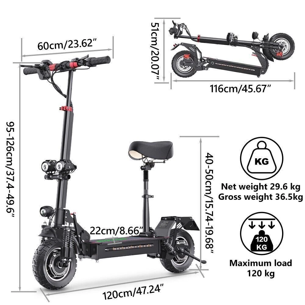 MPN: Does not apply Suitable For: Adults UPC: Does not apply Brand: iENYRD Max Range: 30 - 38 miles Max Load: 280 lb Country/Region of Manufacture: China Max Speed: 28 - 31 mph Color: Black Type: off road electric scooter Wattage: 2000 Watts Features: Brake taillights, Dual suspension, Portable, 2000W High Speed Dual motors, 48V 20AH Long Range Battery, Folding, LED Front Light item Weight: 65 lb Model: ES10 gtin13: Does not apply