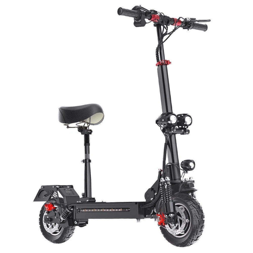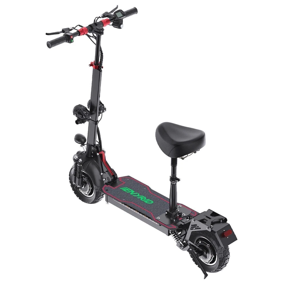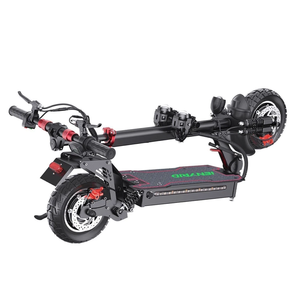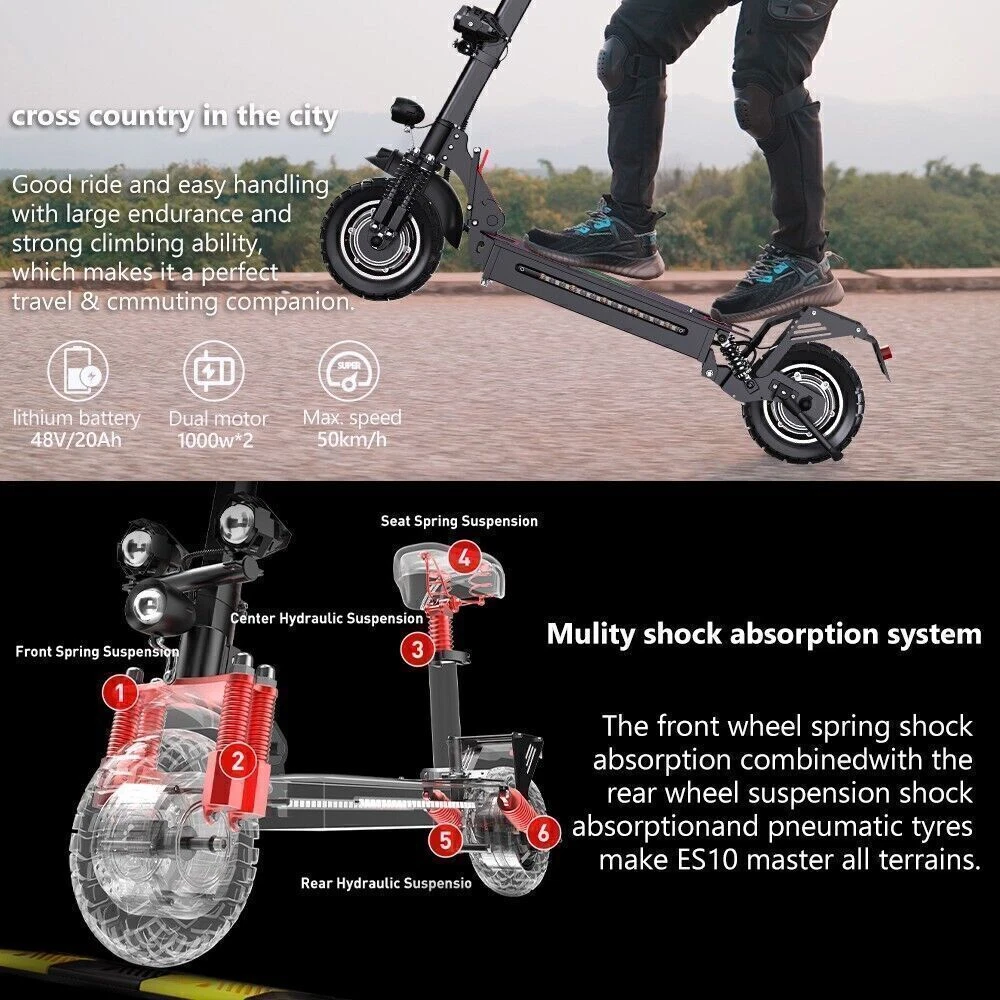 2000W Adults Electric Scooters Dual Motors Drive 48V Commute Off Road E-Scooter 2023 Upgraded iENYRID Electric Scooter ES10 Foldable Electric Scooter comes with a 960Wh (48V 20Ah) battery assisting 25-38 miles cruising range. ES10 becomes an excellent choice for high-quality and comfortable riding. It is suitable for commuting to work, shopping in supermarkets, mountain cross-country and traveling. Powerful Motor & Long Lasting Battery ES10 electric scooters f With powerful Dual 1000W Motors, detailed parts, detachable seat and foldable design,, brings faster acceleration and climbing ability to this electric scooter, which can reach 35 mph max and max 30°climbing angle. Comfortable Commuting IENYRID ES10 adult off road electric scooter comes with upgraded 10-inch off-road tires and front and rear dual suspension to ensure max comfort even on bumpy roads. Also, the aviation-grade aluminum frame is stronger and lighter, which makes the scooter much more elegant to look at and handle as well. And it has a max load of 280 lbs. Foldable Electric Scooter Easy to fold and carry, carry it on public transportation or store it in your car to get to wherever you want. Dynamic, Easy storage in car trunks and other compact spaces, occupying little space and suitable for travel and transportation commute. IPX5 Super Waterproof & LED Intelligent Lighting System The waterproof frame and deck are tightly sealed against water, accredited with an IPX5 ingress protection rating painting. The head of the e scooter is equipped with three LED lights with different functions to ensure safe and worry-free riding at night. Specification: Type: Electric Scooter for Adults Model: IE - ES10 Motor: 2000W Battery specification: 48V 20AH Charger specification: Input AC100-240V, output 54.6V 2A Max aviation plug Controller specification: DC48V/36A Charging time: 4-8 hours Drive mode: front and rear wheel dual drive Max Speed: 31MPH Max Range: 38 Miles Max Load: 280 lbs Maximum climbing ability: ≤ 30 ° Tires: 10 in off-road pneumatic tires Frame Material: aluminum alloy Braking method (front/rear): mechanical braking Front shock absorber: Yes Rear shock absorber: Yes Front headlights: integrated with horn Tail lights: Yes Edge light: Yes Brake lights: Yes Net Weight: 66 lb Front and rear tire pressure: 50 ± 10psi Product Size (L x H x W): 47.24 x 49.6 x 23.62 in (unfolded), 45.67 x 20 x 23.62 inch (folded) Package Contents: 1 x Charger 1 x User Manual 1 x Electric scooter Warning: It is illegal to ride electric scooters on public roads (except under very specific circumstances), pavements or cycle paths. They are intended only for use on private land with the owner’s permission