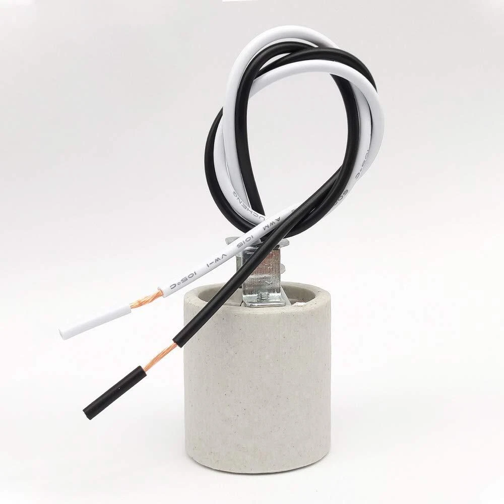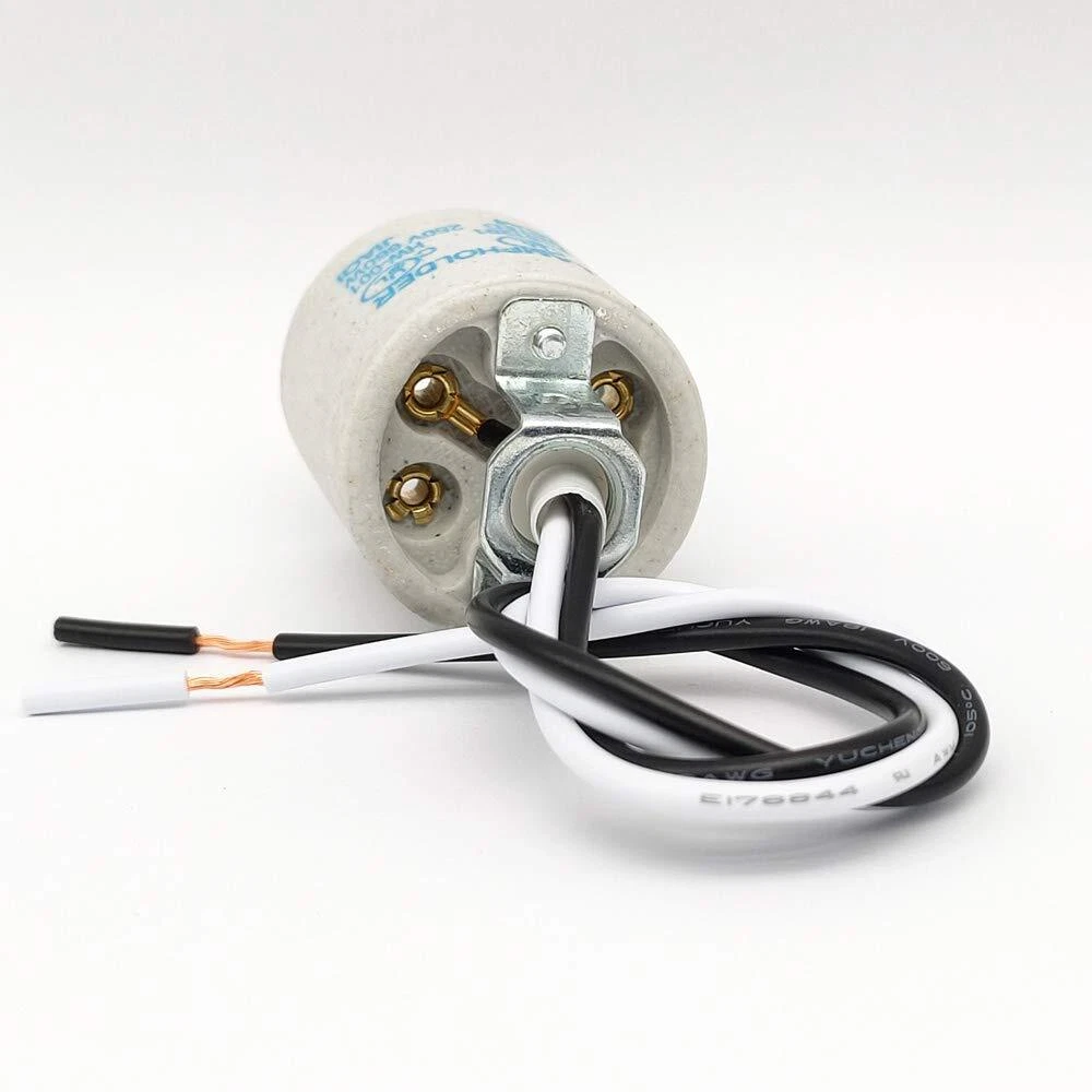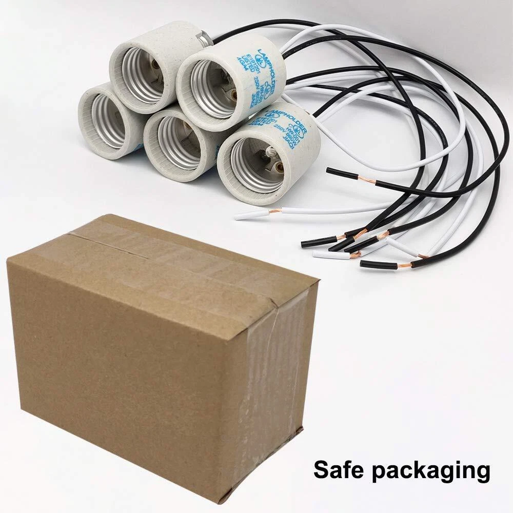Specification: Max Voltage/Wattage: AC250V / 660W Material:Ceramic base, copper connector and iron bracket. E26 porcelain light socket with wire length: 300mm/ 12 inch Diameter of female thread: 5.7mm/ 9/40" Socket Dimension(ceramic part): Dia35mm X H38mm/ Dia7/5" X H3/2" Package Included: 5 Pack x Ceramic Candelabra E26 Socket UL Listed. 5 Pack E26 medium base light sockets suitable for all E26 E27 incandescent, halogen, CFL and LED light bulbs. Made of highly-resistant insulating ceramic, can handle high heat light bulb. Durable fireproof materials, No Fire Hazard & Erosion-resistant. High temperature resistant, isulated wire could stand termperature 200 degree. Use safety. Fitted with female threaded iron brackets.The porcelain socket could be fixed by a male threaded tube. Any issue about our E26 light socket, please feel free to contact us for help, we will reply you within 24 hours.
