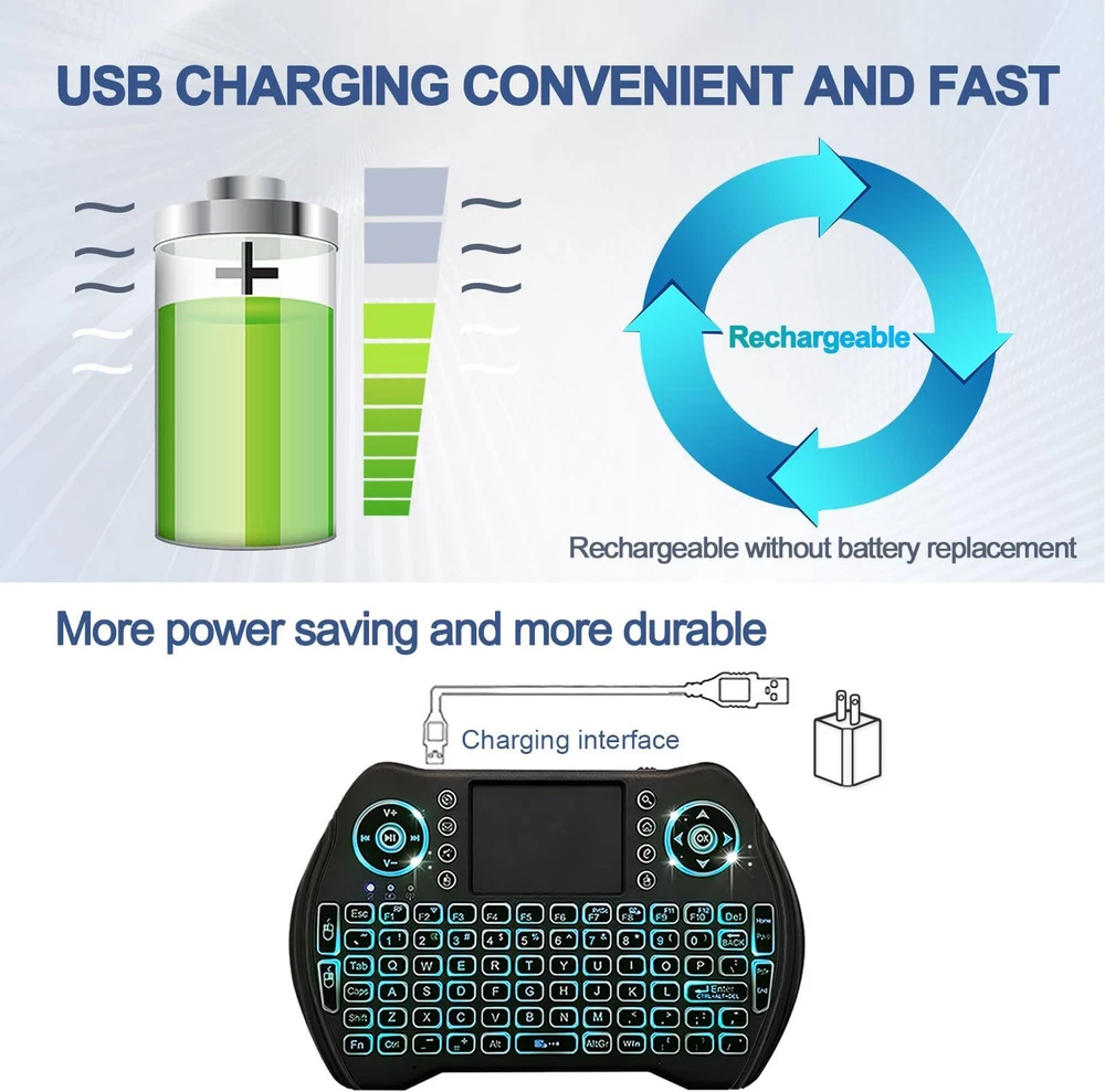 EASYTONE Backlit Mini Wireless Keyboard with Touchpad Mouse Combo Black Product Details Brand: EASYTONE Item model number: E-I8B Operating System: Linux, Android Item Weight: 3.84 ounces Product Dimensions: 5.78 x 0.75 x 3.84 inches Item Dimensions LxWxH: 5.78 x 0.75 x 3.84 inches Color: Black Power Source: Battery Powered Batteries: 1 Lithium Ion batteries required. (included) Manufacturer: EASYTONE Is Discontinued By Manufacturer: No Brand: EASYTONE Color: Black Connectivity Technology: Usb Special Feature: Rechargeable Compatible Devices: Laptop, Gaming Console, Television, Personal Computer 【Easy to Connect & Use】The mini wireles keyboard remote is connected via USB receiver(included) and the work distance up to 10 meters. Just plug and play. very easy to connect and use. Powerful function (keyboard + touchpad + mouse) very perfect for browsing the web, playing games or watching TV. 【Widely Compatibility】The mini keyboard with touchpad can be used for Android TV box, smart TV, PC, Pad, Raspberry PI, PS3, x-box, desktop, laptop, smart phone,HTPC/IPTV, etc. If there is not a USB port, you need to prepare a OTG cable. 【Mutil-Colors Backlit and Rechargeable Battery】The USB mini keyboard has mutil-colors of backlit mode which can clear operate the keys when work at night, don't need to turn on the light which disturbing your families. With auto sleep and wake-up function, and comes with a rechargeable Li-ion battery, it can work for a long time. 【Portable Keyboard】 This small keyboard is designed Small and handheld design, has a innovative shape and petite size, takes up very minimal space in you bag and just makes you say goodbye to chunky keyboard to horizon a new experience of office entertainment anywhere, anytime. 【Sensitive Touchpad & Hotkeys】Wireless mini keyboard with multi-finger touchpad and combo with 8 hotkeys can easy and accurate manipulation. Easy to type and copy / paste, making it faster and more convenient for you browse the page.