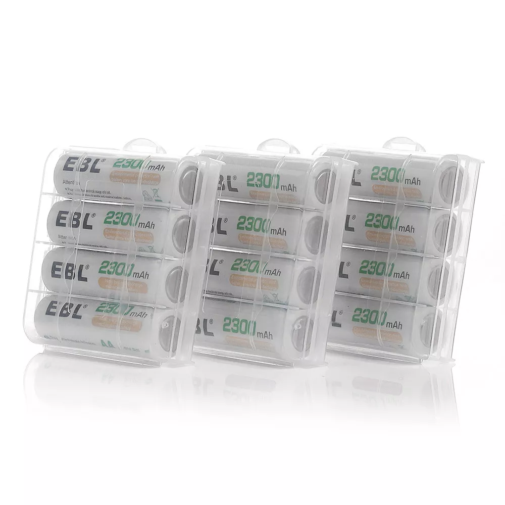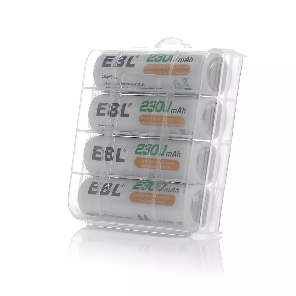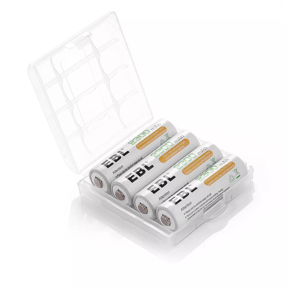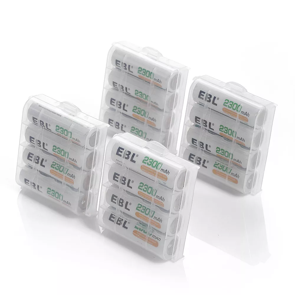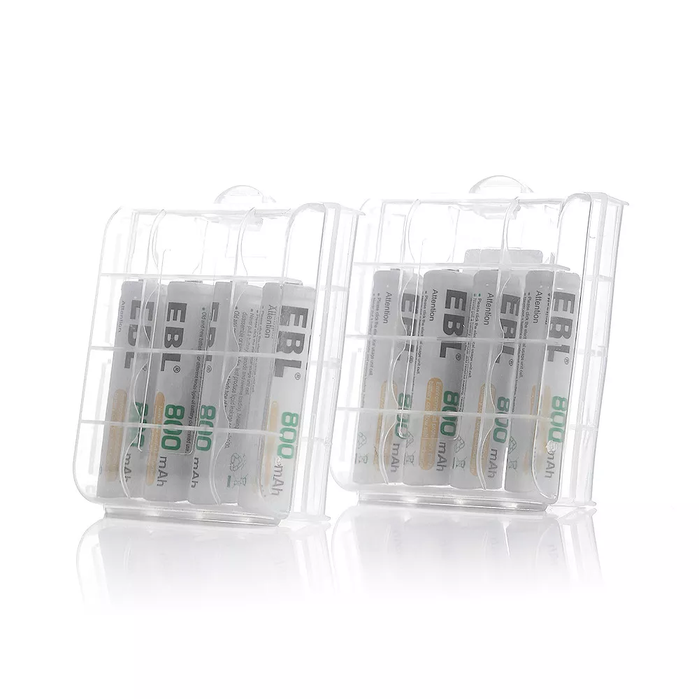 Features For AA & AAA Ni-MH Rechargeable Batteries: Features 1. EBL Branded ,Pro-environment. 2. NO memory effect NIMH chemistry. 3. Recharged up to 1000 times. 4. Relatively long service life. 5. 100% New and high quality. 6. Superior performance under low temperature condition. The Details 1. Battery Voltage: 1.2V 2. Capacity: (800mAh AAA)/(1100mAh AAA )/(2300mAh AA )/(2800mAh AA) 3. Battery Size: AAA/AA 4. Rechargeable type: Ni-MH/ NIMH High capacity NO memory 5. Storage Case : Yes (for 4PCS Battery/per case) 6. Brand: EBL 7. Model: R03/ R06 8. Case : included(4pcs battery /case) For 500mAh AAA 1000mah AA Ni-CD Rechargeable Batteries: 1. Battery Type: AAA/ AA 2. Capacity: 400mAh/1000mAh 3. Voltage: 1.2V 4. Chemistry: Ni-CD 5. Weight: 7.8 ounce (220 g) 6. Pro-environment, 7. EBL batteries can be recharged up to 1200 times when fully or partially drained. 8. Batteries are great for use in household devices such as digital cameras, toys, remote controls, hand held games Compatible with Flash Light,LED Torch ,Camera, Remote control, Garden solar light, ,Detector ,toys etc , multifunction battery Package 4~20pcs AA / AAA Rechargeable Batteries (see dropdown menu droplist) with Clear Storage Box( 4pcs batteries /Case)