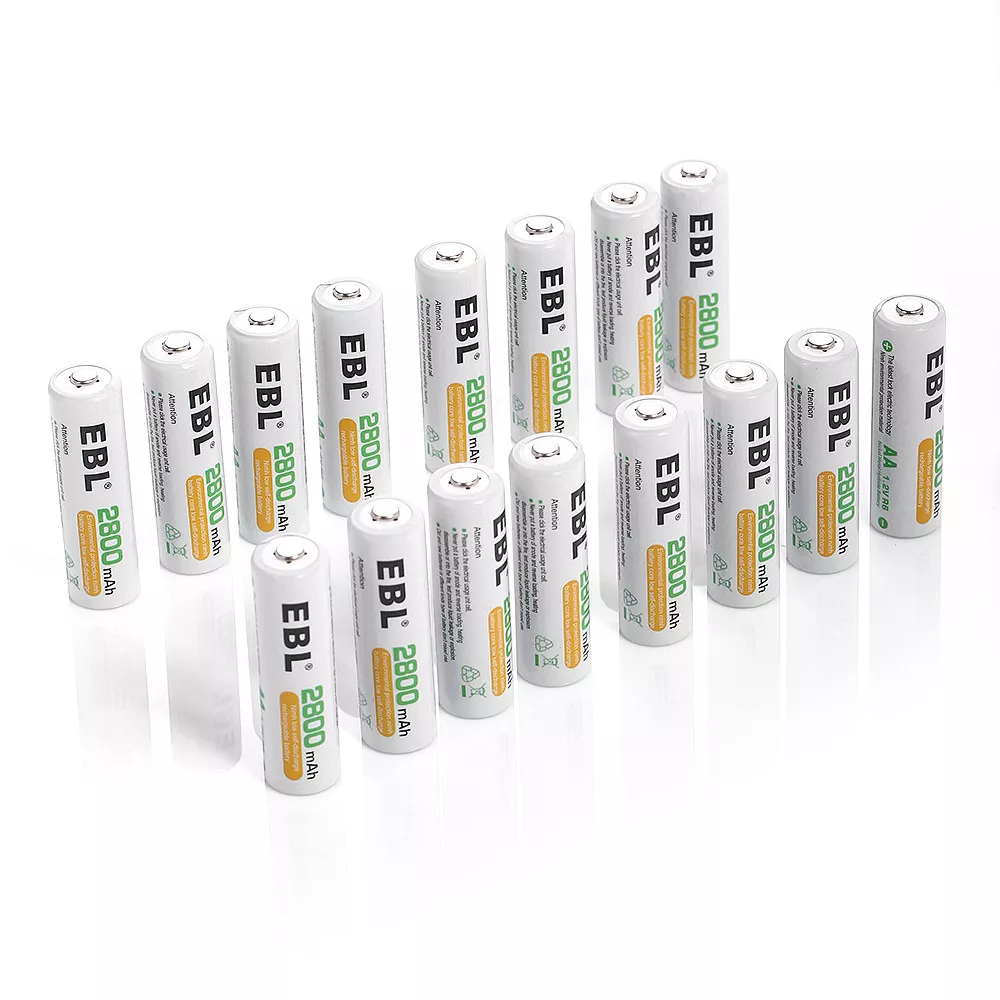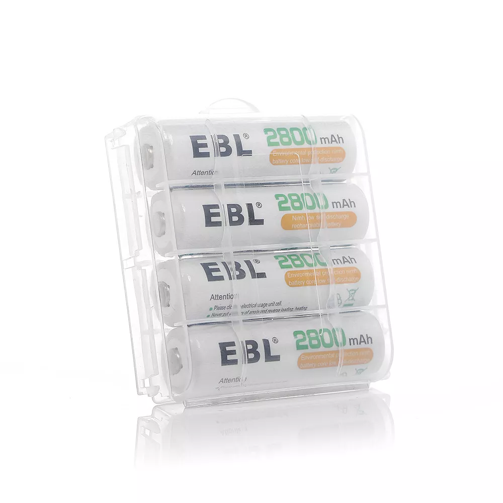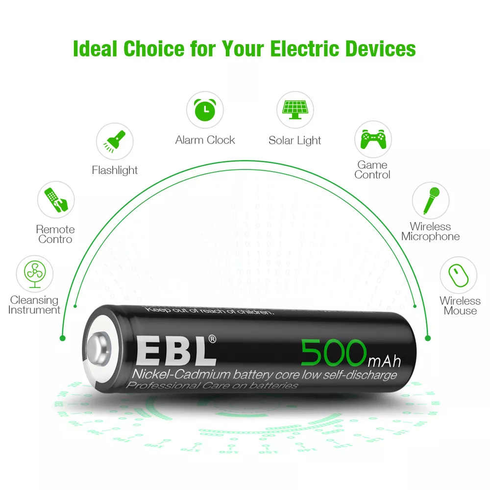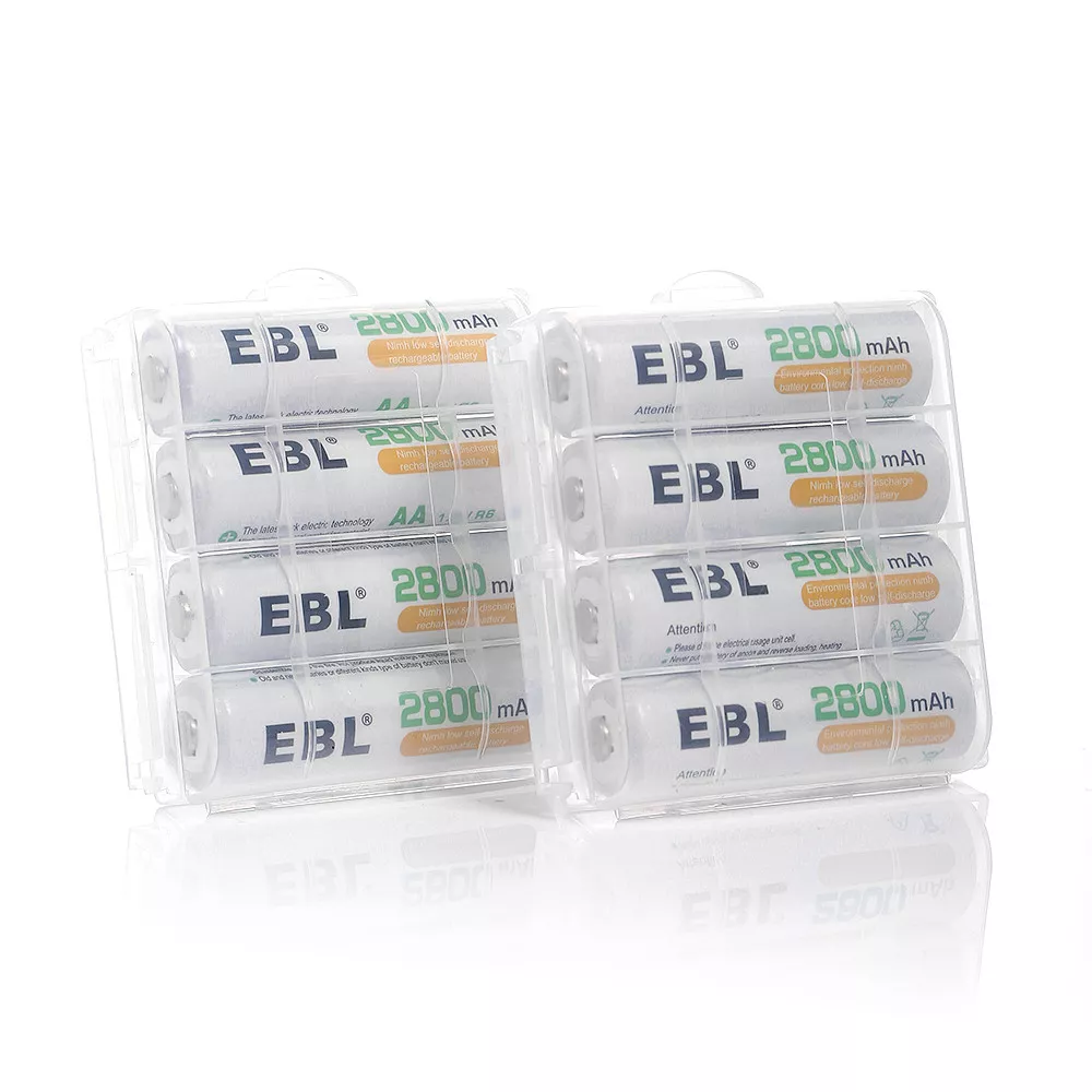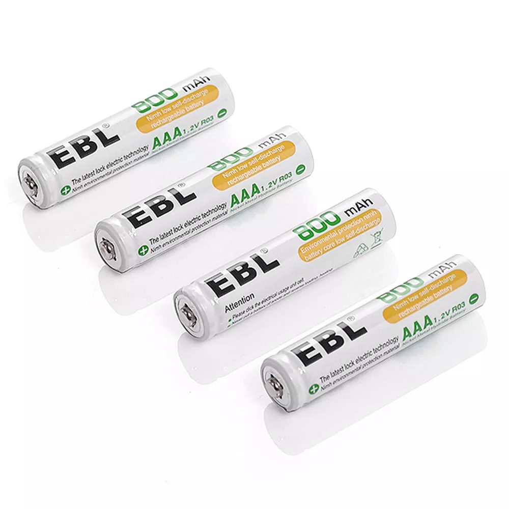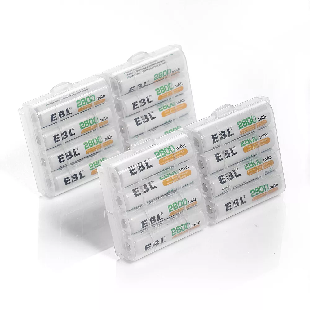 Features For AA & AAA Ni-MH Rechargeable Batteries: Features 1. EBL Branded ,Pro-environment. 2. NO memory effect NIMH chemistry. 3. Recharged up to 1000 times. 4. Relatively long service life. 5. 100% New and high quality. 6. Superior performance under low temperature condition. The Details 1. Battery Voltage: 1.2V 2. Capacity: (800mAh AAA)/(1100mAh AAA )/(2300mAh AA )/(2800mAh AA) 3. Battery Size: AAA/AA 4. Rechargeable type: Ni-MH/ NIMH High capacity NO memory 5. Storage Case : Yes (for 4PCS Battery/per case) 6. Brand: EBL 7. Model: R03/ R06 8. Case : included(4pcs battery /case) For 500mAh AAA 1000mah AA Ni-CD Rechargeable Batteries: 1. Battery Type: AAA/ AA 2. Capacity: 400mAh/1000mAh 3. Voltage: 1.2V 4. Chemistry: Ni-CD 5. Weight: 7.8 ounce (220 g) 6. Pro-environment, 7. EBL batteries can be recharged up to 1200 times when fully or partially drained. 8. Batteries are great for use in household devices such as digital cameras, toys, remote controls, hand held games Compatible with Flash Light,LED Torch ,Camera, Remote control, Garden solar light, ,Detector ,toys etc , multifunction battery Package 4~20pcs AA / AAA Rechargeable Batteries (see dropdown menu droplist) with Clear Storage Box( 4pcs batteries /Case)