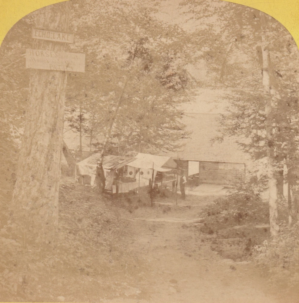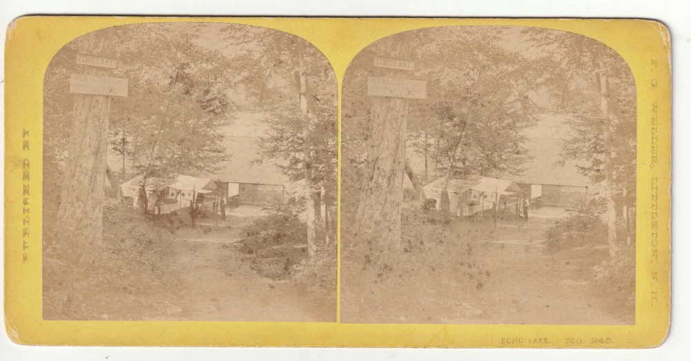 IMPORTANT: We are always happy to combine shipping. In order for us to do so, please do not pay until we send you an invoice for multiple auctions won, or if using "Buy it Now", please add the items to your cart and click on "request total". For your consideration is a nice stereoview titled "Echo Lake". This is a great view of a camp? with a man standing in front of a tent. It looks like the boat house and lake are in the background. Note the two signs on the tree in the foreground. The top sign reads "Echo Lake" and the lower reads in part "Horses are not allowed ? ? Path". It was published by F. G. Weller, Littleton, N. H.(#245). The images are a bit light with some mottling. There is corner wear to the mount , and overall soiling. Please view the enlargeable scans carefully and contact me with any questions. Over the coming months we will be thinning out our collection focused on the mountains of the Northeast. This collection includes the White Mountains (New Hampshire), Green Mountains (Vermont), Adirondacks (New York), Mt. Katahdin, Mt. Monadnock, and other miscellaneous mountains in the region. Also items concerning the Appalachian Trail. We will be listing hundreds of White Mountain stereoviews depicting towns, hotels, Mount Washington, the Cog railway, etc.. If you are looking for a particular view by Kilburn, Soule, Weller, Franklin White, or any of the period photographers feel free to inquire whether we have one to offer. We will also be listing many books (including guides and early histories), maps, photos, Appalachian Mountain Club items, etc.. Please check our auctions regularly and if you are seeking a particular item for your collection contact us and we will let you know if we will be selling one.