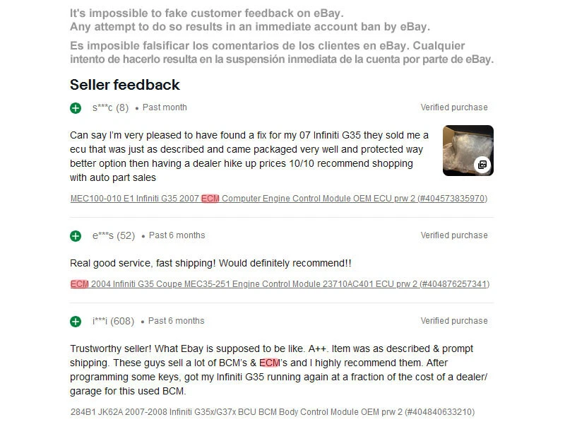 Fast seller ★ ★ ★ ★ ★ Engine Control Module MEC33-111 for 2003 Infiniti FX35 👉 Donor vehicle: 2003 Infiniti FX35 Sedan, 3.5L V6, A/T, RWD; VIN: JNRAS08U13X103008 Reprogramming: Reprogramming may NOT be REQUIRED , but only if your vehicle is identical to the donor vehicle, which could allow you to SAVE money on reprogramming. However, this rule does not apply to all vehicles — please confirm this information with your dealership. If your vehicle is not fully identical to the donor vehicle (e.g., production year, transmission type, body style, or whether it has all-wheel drive), reprogramming will DEFINITELY be necessary. Manufacturer Part Number: MEC33-111, L3 MEC33-111 A1, 23710-CG061, 23710-CG060 🚀 Super fast delivery We ship the vast majority of orders placed during business hours within 6 hours after payment. Enviamos la gran mayoría de los pedidos realizados durante el horario comercial dentro de las 6 horas posteriores al pago. 👌 Buyer Protection 30 day warranty & free returns! ** The part in the pictures are the actual part you will be receiving. After purchase, you are allowed to install and test the module in your vehicle. The warranty remains valid after installation. Not all sellers offer this option. ¡Garantía de 30 días y devoluciones gratuitas! ** La pieza que aparece en las imágenes es la pieza real que recibirás. Después de la compra, se le permite instalar y probar el módulo en su vehículo. La garantía sigue siendo válida después de la instalación. No todos los vendedores ofrecen esta opción. ** Return Policy: The item has security seals. If the item is opened and the security seal is broken, the 30-day warranty and free return are not valid. If the security seals have not been broken, you are guaranteed to receive a 100% refund, regardless of the reason for the return . We do not charge any additional return fees. ** Política de devoluciones: El artículo dispone de precintos de seguridad. Si se abre el artículo y se rompe el precinto de seguridad, no son válidas la garantía de 30 días y la devolución gratuita. Si el artículo no está dañado, tiene la garantía de recibir un reembolso del 100%, independientemente del motivo de la devolución . No cobramos ninguna tarifa de devolución adicional. ECM ECU Nissan for Infiniti FX35 2003 Genuine Original Factory OEM Unit. Hitachi, ltd JAPAN