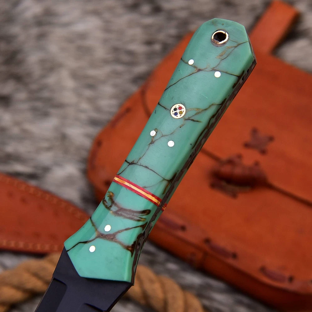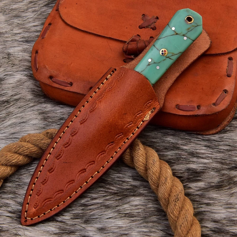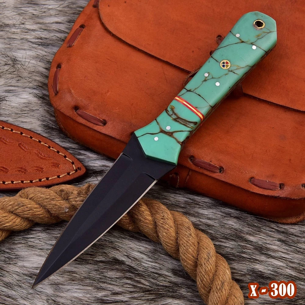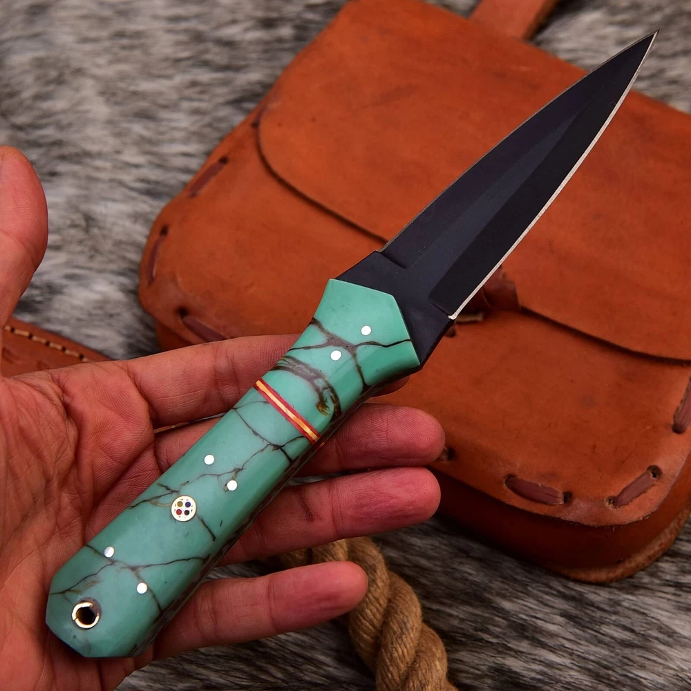 This handmade carbon steel double edged dagger boot knife with a Resin handle is perfect for collectors and enthusiasts alike. The blade is made of high-quality carbon steel, while its double cutting edge ensures precision and accuracy when in use. The knife also features a full tang for added durability, and its ambidextrous design allows for easy handling by both left- and right-handed users. Overall length: 9” inch Blade : 4.5” inch Handle : 4.5” inch With leather sheath The knife's brown color and original design make it a unique addition to any collection. This dagger is perfect for display or for everyday carry. With its impressive quality and craftsmanship, it is sure to impress any knife enthusiast.