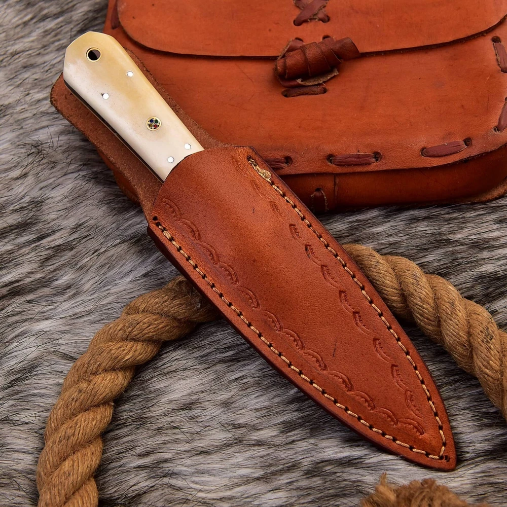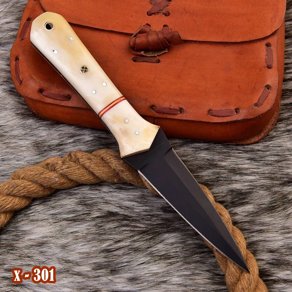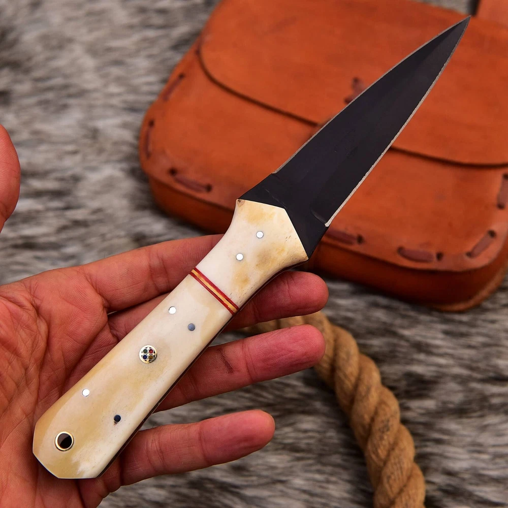 This handmade carbon steel double edged dagger boot knife with camel bone handle is perfect for collectors and enthusiasts alike. The blade is made of high-quality carbon steel, while its double cutting edge ensures precision and accuracy when in use. The knife also features a full tang for added durability, and its ambidextrous design allows for easy handling by both left- and right-handed users. Overall length: 9” inch Blade : 4.5” inch Handle : 4.5” inch With leather sheath The knife's brown color and original design make it a unique addition to any collection. This dagger is perfect for display or for everyday carry. With its impressive quality and craftsmanship, it is sure to impress any knife enthusiast.