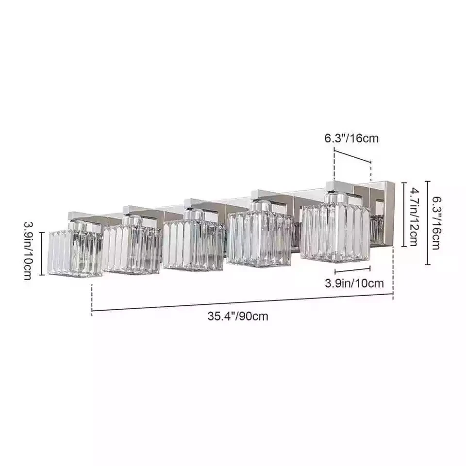 EDISLIVE Orillia 35.4 in. 5-Light Chrome Bathroom Vanity Light with Crystal Shades About This Product This crystal vanity light for the bathroom combines a unique Square Lampshade with modern crystal and looks elegant and exquisite. It is perfect for your bathroom, living room, bedroom bedside and entryway. Not only a simple vanity lighting but also a good decoration for your home. Highlights Primary material: metal, crystal Finish: chrome Bulb base: 5 x E26 (not included) Recommended bulb type: G40 bulb (1.57 in. * 2.36 in. ) or G16.5 bulb (1.96 in. * 3.07 in. ) Wattage per bulb: 60-Watt maximum Dimmable: yes (dimmer bulb and switch not included) Voltage: 120-Volt Light direction: up/down light