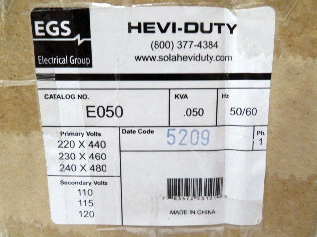EGS Hevi-Duty E050 Industrial Control Transformer 50/60Hz KVA 0.050 NEW IN BOX New Excess Inventory, Original Box, Box Shop Worn. Instruction Manual Included. Terms and Conditions: 1.) All items, new or used, are sold AS-IS. We are surplus material dealers and do not have the ability or knowledge to test items for functionality. 2.) All statements regarding items are made to the best of our ability and with the assumption that the buyer is knowledgeable and proficient in the use of these items. 3.) We have no knowledge of the history of these items. Due to the nature of surplus and or used items, no guarantees or warranties are either expressed or implied. 4.) Maine Industrial Supply Company, LLC is NOT liable for any and all issues regarding this item's functionality and/or structural integrity and is not liable for any and all issues resulting from installation, improper manufacturing, or misuse. 5.) Maine Industrial Supply Company, LLC is NOT liable for any and all issues that may occur with this item during initial testing, installation, and after installation. 6.) It is the Buyer's responsibility to inspect and test this item for functionality and confirm that it is suitable and safe for installation. 7.) Maine Industrial Supply Company, LLC is not a distributor or the manufacturer of this item and does not warrant this item's suitability for any application. 8.) By purchasing this item, the Buyer acknowledges and accepts the terms and conditions of the sale and releases Maine Industrial Supply Company, LLC from any and all liability. 9.) It is the Buyer's responsibility to understand the terms and conditions of this sale and the nature of the items offered and bid accordingly. Please see pictures for further description. Return Policy: 1.) Buyer has 30 days from the date of delivery to submit a return. 2.) A return can only be authorized if the item is in the same new condition as sent, OR if the item fails an initial test conducted within 30 days and prior to final installation. 3.) DOMESTIC RETURNS: Returning a new item as sent - The buyer is responsible for all shipping charges outgoing, and all return shipping charges. 3A.)Returning an item that fails initial testing within 30 days (Dead On Arrival) and prior to final installation- Seller will pay for outgoing and return shipping. 4.) INTERNATIONAL RETURNS: Buyer pays for shipping/customs charges outgoing and returning in both cases (See Statement 2). Refund- 1.)If a return is authorized, a full refund for the total purchase price and applicable shipping will be issued pending an inspection by the seller to confirm condition of the item. 2.) A refund will not be issued if a returned item (returned as a new item), shows signs of installation or modification. 3.) Dead On Arrival (Domestic) returns will receive a full refund including outgoing and returning shipping charges. 4.) Dead On Arrival (International) returns will receive a refund for the purchase price (less outgoing shipping/customs charges). PB-NE-6