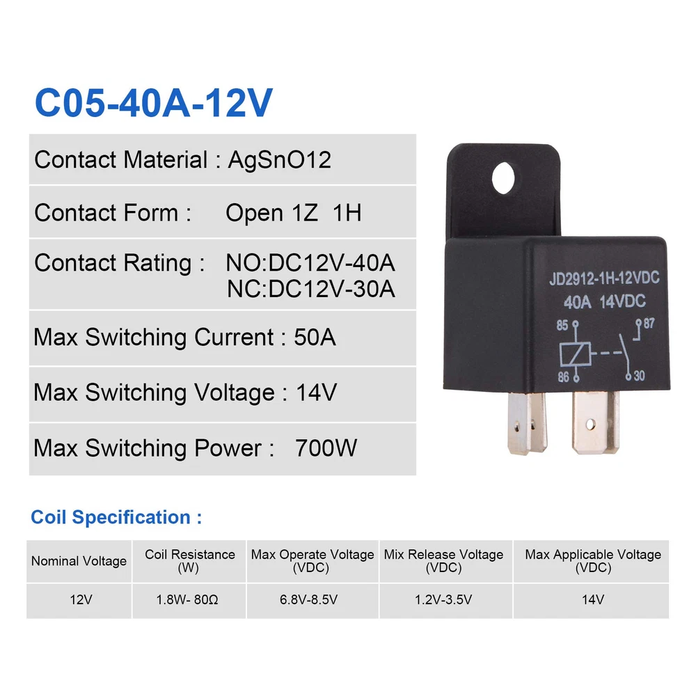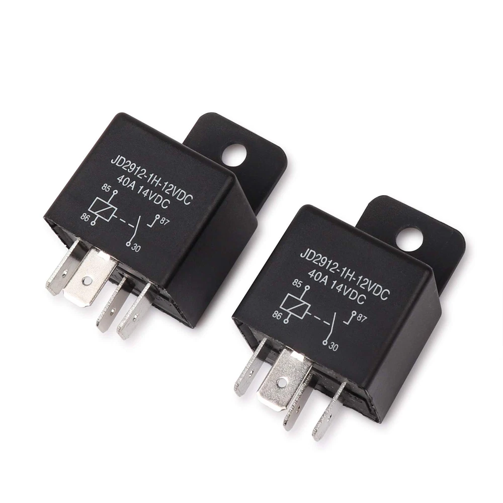 Heavy duty 4-prongs SPST relays, jd1912 12v 40a relay Use optional Relay Harness, or female Crimp Connectors High 40A coil capacity- able to handle those high current applications with ease Package Include: 2 x 40A 4-Pin 12V Vehicle Relays The Automotive relay is suitable for normal automobile use and simple to operate, you just need to connect the relay with the wire, no other tools needed, convenient for your use and replace, allowing your components to work properly