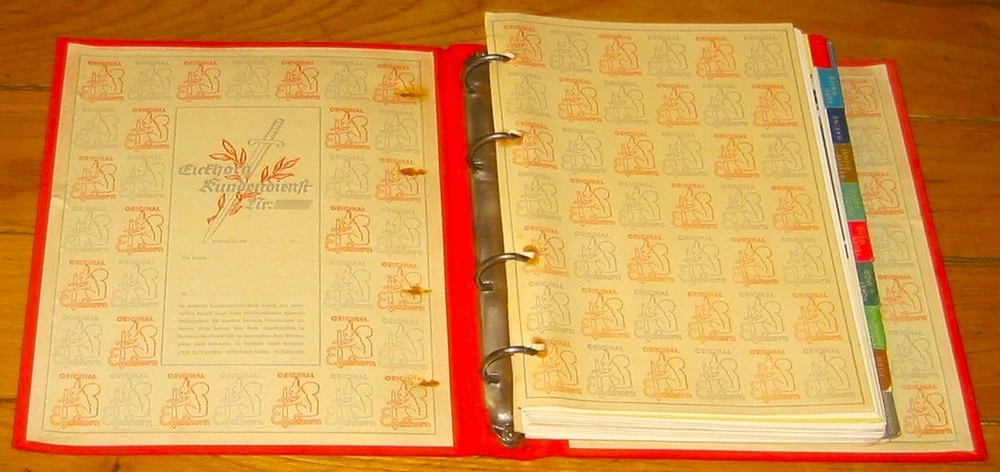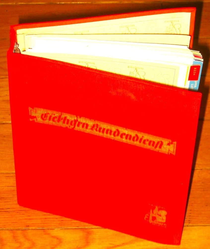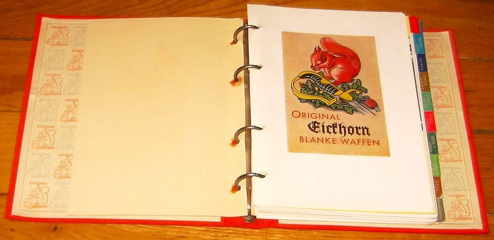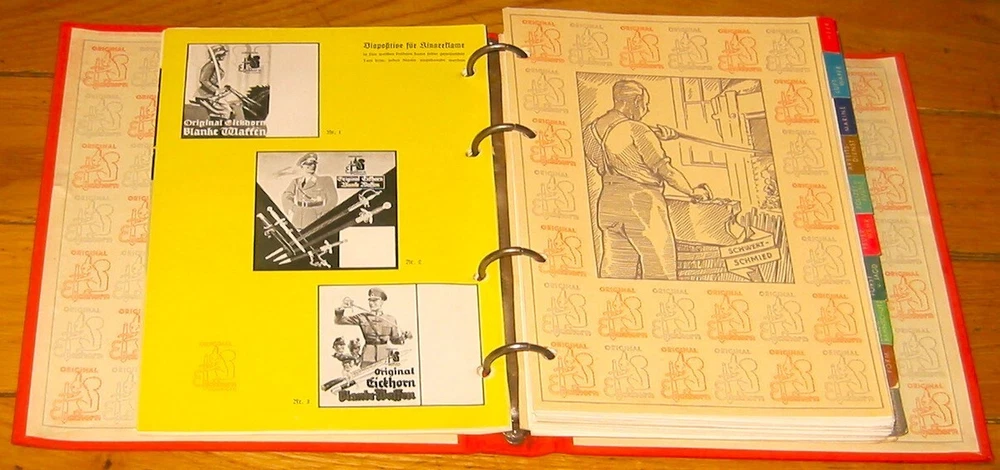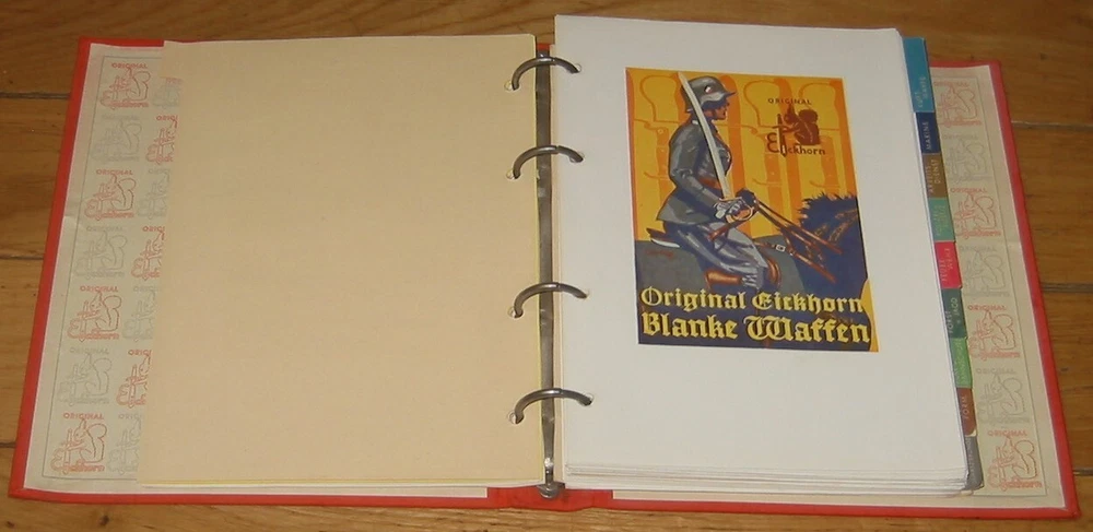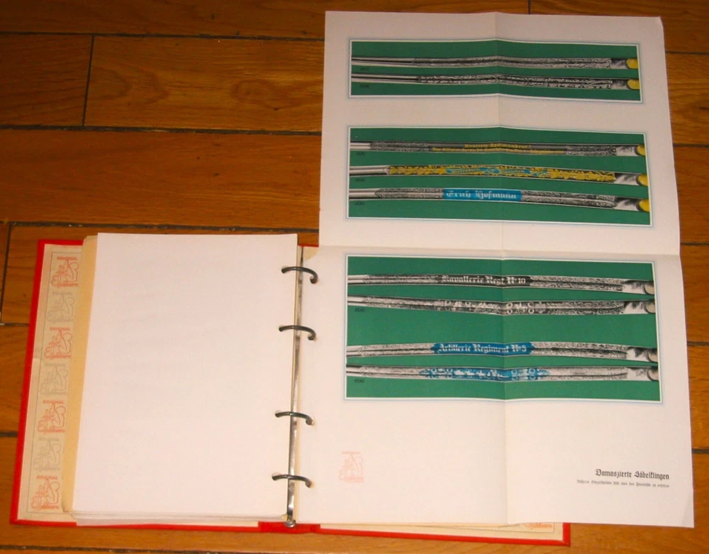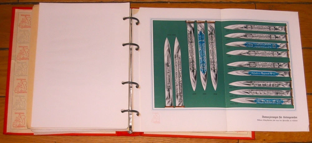 Eickhorn Kundendienst 1938 Edition Sales Catalog: From the famous Knife and Sword maker, Carl Eickhorn , the 1938 catalog, which includes beautiful photos and color illustrations of nearly all the WWII German swords and daggers available in 1938. The catalog is divided into German services ( Heer, Luftwaffe, Marine, Arbeits-Dienst, Polizei u. Justiz, Feuer Wehr, Forst u. Jagd, Zoll u. Bahnschutz, Partie-Form, Verschiedenes Damaszierungen ). Also included is a price list, pictures of blade etchings etc. The Reprints or Reproductions that you see for sale in various platforms do not include the last section with bayonet etches and the price lists that are in this original. I RECENTLY DID A SEARCH OF THE INTERNET AND COULDN'T FIND ANY ORIGINALS OF THIS CATALOG FOR SALE ANYWHERE. ANY THAT WERE LISTED WERE ALREADY SOLD. THIS IS THE BEST CONDITION ONE THAT I EVER SAW OR HAD, AND THE ONLY ONE FOR SALE NOW.