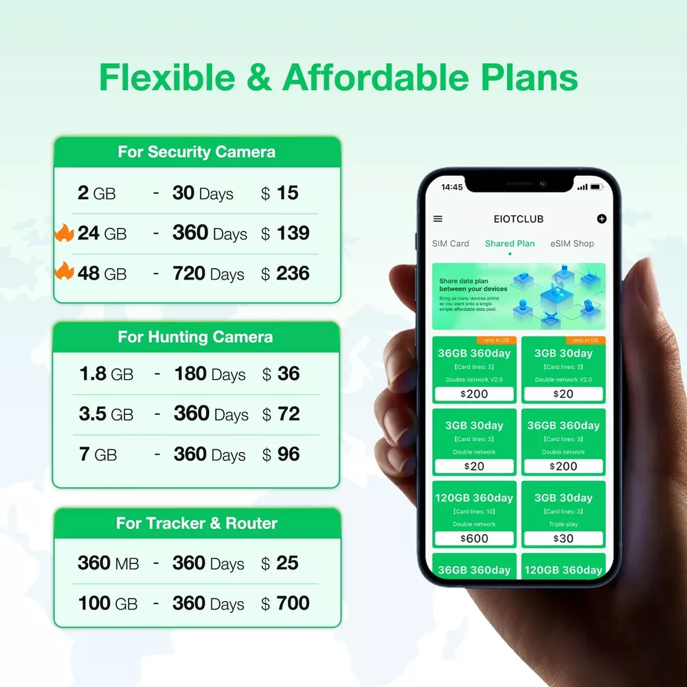 EIOTCLUB Data SIM Card Triple Play- USA Coverage No Contract 4G LTE Excellent Data Service Solution - Our SIM card offers testing traffic plans. Join now to experience this service. Enjoy 4G high-speed data service on the largest and most dependable networks in the United States. How It Works - Simply insert the SIM card into your device without activation, and you're all set. Our service operates within the USA via 3 major nationwide cellular towers (Verizon/ATT/Tmobile). Safe and Dependable - No contracts. No additional fees. No hidden charges. No activation fees.This SIM kit comes pre-cut in three sizes to fit any device: Standard, Micro, and Nano sizes. Compatible and Convenient Data Service - Our SIM cards have undergone testing and are ideal for a variety of IoT devices, such as security cameras, trail and game cameras for hunting, 4G routers, 4G security cameras, 4G PoC radios, and more. Online Support Available - We offer professional online ordering and customer support to assist you with any issues you may encounter. Your satisfaction is our priority! Please reach out to us via message if you have any questions and provide your SIM card number (keep it safe) so we can better assist you. This version is recommended for most 4G cellular security cameras and hunting cameras. For some routers, portable Wi-Fi, and hotspot devices, please check if the network band frequency matches: B2.B4.B5.B12.B13.B14.B17.B25.B26.B30.B66.B71 Shipping We offer FREE shipping on all orders! We ship within Three business days of payment, usually sooner. We use a selection of shipping services such as UPS, FedEx, USPS etc. We only ship to the lower 48 states, no APO/FPO addresses or PO Boxes allowed. Local pickups and combined shipping options are not provided at this time. Return You can return a product for up to 30 days from the date you purchased it. Any product you return must be in the same condition you received it and in the original packaging. Please keep the receipt. Payment We accept payment by any of the following methods: PayPal Please pay as soon as possible after winning an auction, as that will allow us to post your item to you sooner! Feedback Customer satisfaction is very important to us. If you have any problem with your order, please contact us and we will do our best to make you satisfied. Contact Us If you have any queries, please contact us via ebay. We usually respond within 24 hours on weekdays. Please visit our eBay store to check out other items for sale! Thank you for shopping at our store.