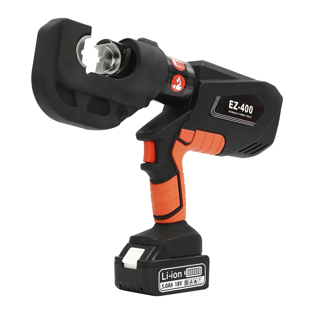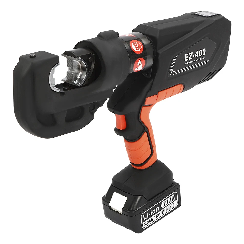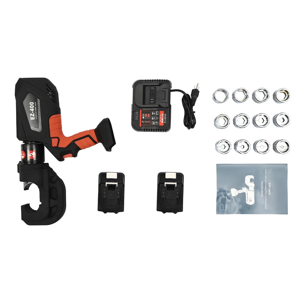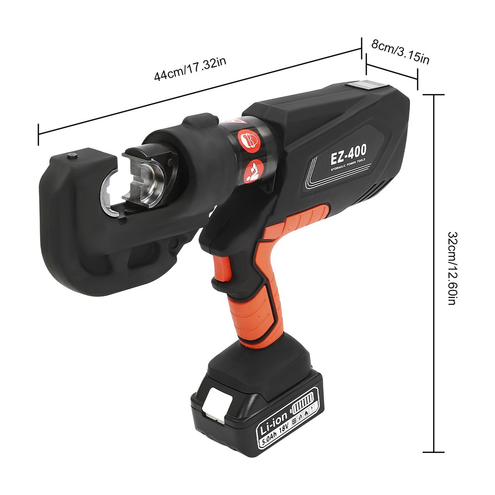 EK-400 Battery Powered Electric Hydraulic Plier Crimping Tool Crimper +2 Battery Description Our electric hydraulic plier is made of high-quality materials and is sturdy and durable. Its 360° rotatable head can be adapted to different working environments, the OLED display allows you to easily observe the number of crimps, remaining power, and temperature, and the 12 different die sizes allow for a wider range of crimps. In addition, the ergonomic handle is comfortable to grip and easy to operate with one hand. Our product is sure to be the ideal choice for your crimping job! Key Features Good Material: This product is made of 40Cr steel, Q235 steel, and engineering plastic, with the forging, finishing, and injection molding processes, which makes the product strong and durable, high hardness, anti-impact, anti-corrosion, and anti-rust. Humanized Design: The ergonomic handle is easy to grip without slipping and can effectively reduce hand fatigue caused by long hours of work. The 360° swivel design and LED light make your operation more flexible and can help you work well in different situations. OLED Screen: It can display the number of crimps, remaining power, and real-time temperature, which is convenient for you to operate, and also prevents the machine from burning out due to high temperature. Save Time and Effort: Compared with manual hydraulic pliers, our electric one can be controlled by only one button, and it can be automatically reset when crimping is completed, which saves both time and effort. Continuous Work: The two 4.0Ah lithium-ion batteries can provide longer battery life without frequent charging and worrying about insufficient electricity that affects your work. The equipped charger can help recharge the two batteries to save money and energy. Good Compatibility: The provided 12 different sizes of crimping dies(16, 25, 35, 50, 70, 95, 120, 150, 185, 240, 300, and 400mm²) can help you process different sizes of metal materials, making the product more widely used. Convenient to Carry: Equipped with a toolbox that can hold this product and its accessories, it is convenient for you to carry it to different work sites. Easy Assembly: You just need to install the suitable die on it and then install the battery and you can start using it, which is very easy. Details Pure Copper Motor: It provides strong power for the product, accelerates crimping speed, improves efficiency, and prolongs service life. Battery Lock: It secures the battery to the bottom of the product, preventing it from falling off during use and making it easy to remove the battery. Heat Dissipation Holes: They can ensure that the product can dissipate heat quickly and timely, avoiding the motor burning out due to the high temperature when working. Application It is suitable for electric power repair, construction work, copper terminal crimping, and aluminum terminal crimping. Specification Model: EZ-400 Material: 40Cr Steel, Q235 Steel, Plastic Process: Forging, Finishing, Injection Molding Color: Black, Red Style: Modern Motor Type: Pure Copper Motor Plug Type: US Standard Assembly Required: Yes Number of Batteries: 2 Output Power: 400W Voltage: 110V Each Battery Capacity: 4.0Ah 18V Charger: 21.5V 2A Charging Time: 1.5-2h Continuous Use Time: 1.5h Maximum Output Force: 150KN Working Stroke: 42mm/ 1.65in Crimping Range: 400mm² (Copper Terminal), 300mm²(Aluminum Terminal) Die Size: 16, 25, 35, 50, 70, 95, 120, 150, 185, 240, 300, 400mm² Gross Weight: 15kg/ 33.07 lbs Package Size: 60*50*14 cm/ 23.62*19.69*5.51in Product Size: 44*8*32 cm/ 17.32*3.15*12.6 in Package Included 1* Electric Hydraulic Pliers 2* Lithium Batteries 1* Battery Charger 12* Dies 1* Toolbox 1* English Manual Notes Please read the operating manual completely before use. And pay particular attention to the safety instructions included. The fully charged time is approximately 1.5-2H, and it is recommended not to charge for too long to avoid battery capacity loss. It is strictly prohibited to crimp without a crimping die to avoid damage to the clamp head. Please allow the slight color difference caused by the shooting light and the 1-3 cm error due to manual measurement, and make sure you do not mind before ordering. Payment Delivery details Terms of sales About us Contact us Payment We accept ebay payment 。 Fees such as import duties, taxes are not included in the item price or shipping costs. These charges are the buyer's responsibility. Delivery details Shipping: 2-9 working days to: USA Terms of sales We maintain high standards of excellence and strive for hundred percent customer satisfaction. Feedback is very important to us. We hope that you contact us immediately before you give neutral or negative feedback, so that we can address your concerns. It is impossible to address issues if we do not know about them! About us Your satis faction is our ultimate goal. We work hard to earn your trust and future business. Our certified technicians have tested each item before shipping. The unit comes with 1 year limited warranty on all manufacturing defects. a) If you receive a defective item, you may return it or ask for a discount. Please contact us within 14 days after you receive the package. b) What you returned must be intact and in its original packaging as re? u. Customer is responsible for shipping costs of the returned item. c) We will cover the cost of shipping back t with the shipping rate indicated in the registration page. We will send you a new unit or refund the full payment you paid. Thank you. Contact us Business Hour Business Hour: Monday To Friday: 8:30 AM to 5:00 PM (Beijing China time) Due to time zones, our reply to your questions may not be immediately. But within above working time, we will reply your email within 24 hours. If it's non-workdays, please kindly be patient and wait till Monday. Please contact us with ebay message. Please feel free to contact us if you have any questions. Monday To Friday: 8:30 AM to 5