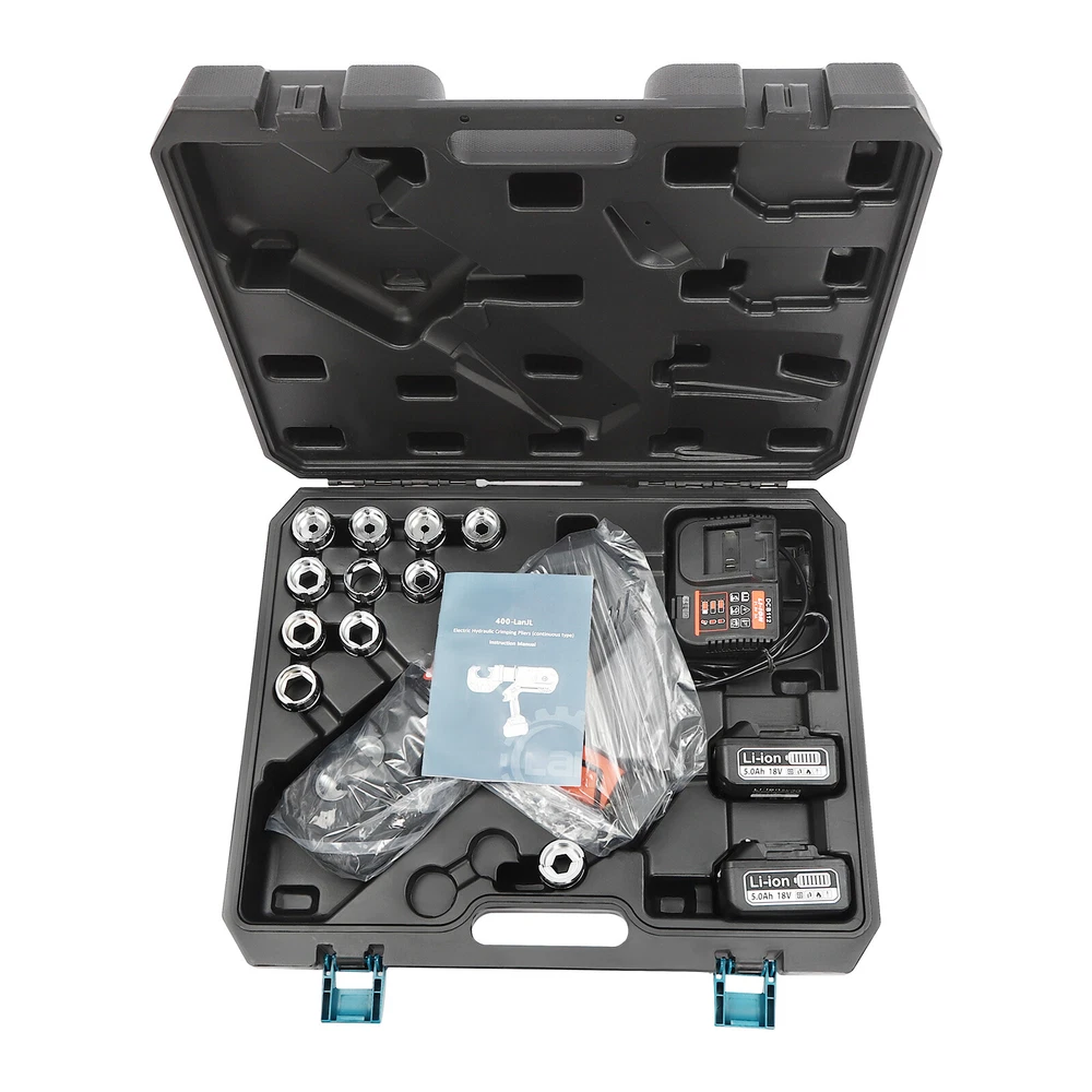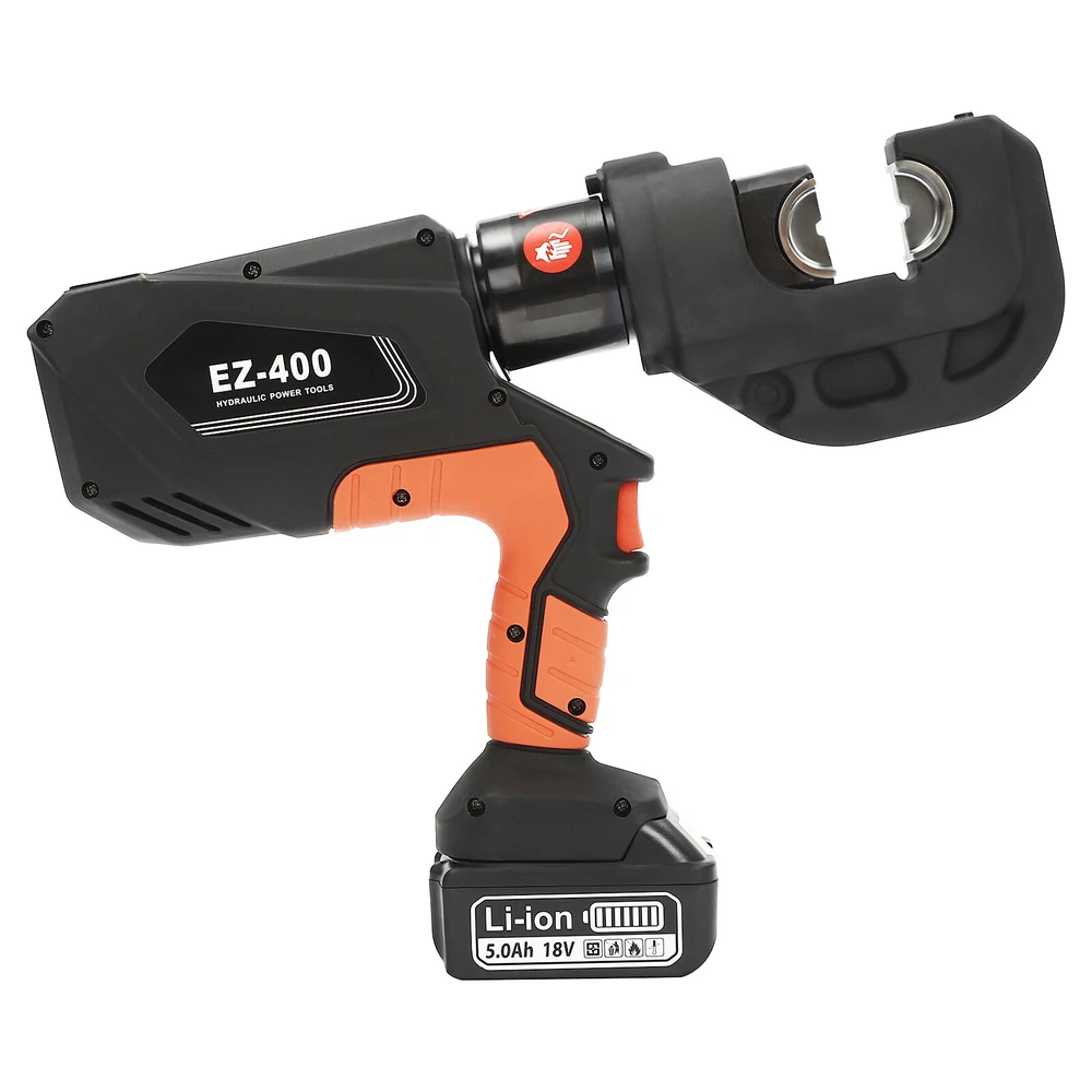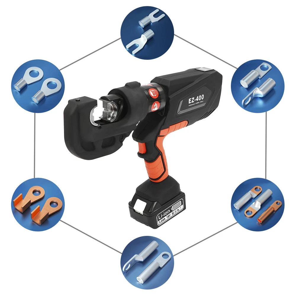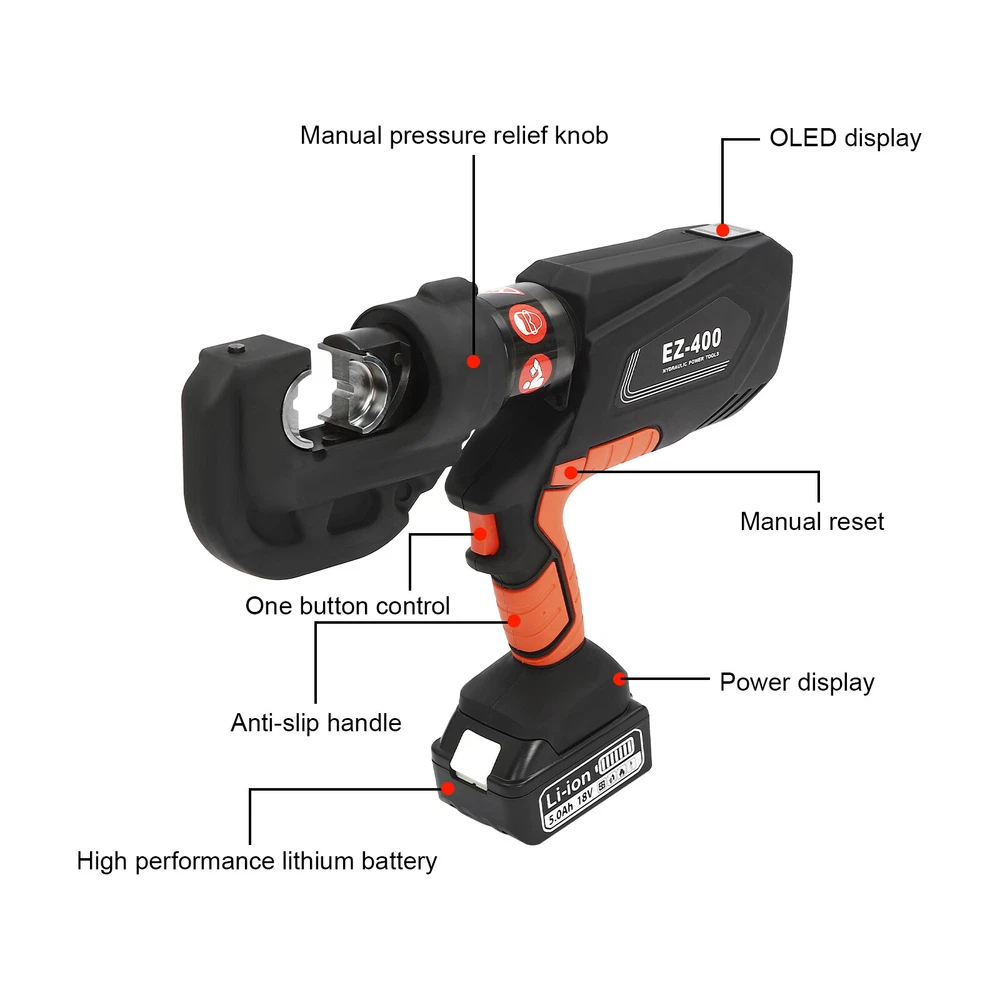 EK-400 Battery Powered Electric Hydraulic Plier Crimping Tool Crimper +2 Battery Description Our electric hydraulic plier is made of high-quality materials and is sturdy and durable. Its 360° rotatable head can be adapted to different working environments, the OLED display allows you to easily observe the number of crimps, remaining power, and temperature, and the 12 different die sizes allow for a wider range of crimps. In addition, the ergonomic handle is comfortable to grip and easy to operate with one hand. Our product is sure to be the ideal choice for your crimping job! Key Features Good Material: This product is made of 40Cr steel, Q235 steel, and engineering plastic, with the forging, finishing, and injection molding processes, which makes the product strong and durable, high hardness, anti-impact, anti-corrosion, and anti-rust. Humanized Design: The ergonomic handle is easy to grip without slipping and can effectively reduce hand fatigue caused by long hours of work. The 360° swivel design and LED light make your operation more flexible and can help you work well in different situations. OLED Screen: It can display the number of crimps, remaining power, and real-time temperature, which is convenient for you to operate, and also prevents the machine from burning out due to high temperature. Save Time and Effort: Compared with manual hydraulic pliers, our electric one can be controlled by only one button, and it can be automatically reset when crimping is completed, which saves both time and effort. Continuous Work: The two 4.0Ah lithium-ion batteries can provide longer battery life without frequent charging and worrying about insufficient electricity that affects your work. The equipped charger can help recharge the two batteries to save money and energy. Good Compatibility: The provided 12 different sizes of crimping dies(16, 25, 35, 50, 70, 95, 120, 150, 185, 240, 300, and 400mm²) can help you process different sizes of metal materials, making the product more widely used. Convenient to Carry: Equipped with a toolbox that can hold this product and its accessories, it is convenient for you to carry it to different work sites. Easy Assembly: You just need to install the suitable die on it and then install the battery and you can start using it, which is very easy. Details Pure Copper Motor: It provides strong power for the product, accelerates crimping speed, improves efficiency, and prolongs service life. Battery Lock: It secures the battery to the bottom of the product, preventing it from falling off during use and making it easy to remove the battery. Heat Dissipation Holes: They can ensure that the product can dissipate heat quickly and timely, avoiding the motor burning out due to the high temperature when working. Application It is suitable for electric power repair, construction work, copper terminal crimping, and aluminum terminal crimping. Specification Model: EZ-400 Material: 40Cr Steel, Q235 Steel, Plastic Process: Forging, Finishing, Injection Molding Color: Black, Red Style: Modern Motor Type: Pure Copper Motor Plug Type: US Standard Assembly Required: Yes Number of Batteries: 2 Output Power: 400W Voltage: 110V Each Battery Capacity: 4.0Ah 18V Charger: 21.5V 2A Charging Time: 1.5-2h Continuous Use Time: 1.5h Maximum Output Force: 150KN Working Stroke: 42mm/ 1.65in Crimping Range: 400mm² (Copper Terminal), 300mm²(Aluminum Terminal) Die Size: 16, 25, 35, 50, 70, 95, 120, 150, 185, 240, 300, 400mm² Gross Weight: 15kg/ 33.07 lbs Package Size: 60*50*14 cm/ 23.62*19.69*5.51in Product Size: 44*8*32 cm/ 17.32*3.15*12.6 in Package Included 1* Electric Hydraulic Pliers 2* Lithium Batteries 1* Battery Charger 12* Dies 1* Toolbox 1* English Manual Notes Please read the operating manual completely before use. And pay particular attention to the safety instructions included. The fully charged time is approximately 1.5-2H, and it is recommended not to charge for too long to avoid battery capacity loss. It is strictly prohibited to crimp without a crimping die to avoid damage to the clamp head. Please allow the slight color difference caused by the shooting light and the 1-3 cm error due to manual measurement, and make sure you do not mind before ordering. Payment Delivery details Terms of sales About us Contact us Payment We accept ebay payment 。 Fees such as import duties, taxes are not included in the item price or shipping costs. These charges are the buyer's responsibility. Delivery details Shipping: 2-9 working days to: USA Terms of sales We maintain high standards of excellence and strive for hundred percent customer satisfaction. Feedback is very important to us. We hope that you contact us immediately before you give neutral or negative feedback, so that we can address your concerns. It is impossible to address issues if we do not know about them! About us Your satis faction is our ultimate goal. We work hard to earn your trust and future business. Our certified technicians have tested each item before shipping. The unit comes with 1 year limited warranty on all manufacturing defects. a) If you receive a defective item, you may return it or ask for a discount. Please contact us within 14 days after you receive the package. b) What you returned must be intact and in its original packaging as re? u. Customer is responsible for shipping costs of the returned item. c) We will cover the cost of shipping back t with the shipping rate indicated in the registration page. We will send you a new unit or refund the full payment you paid. Thank you. Contact us Business Hour Business Hour: Monday To Friday: 8:30 AM to 5:00 PM (Beijing China time) Due to time zones, our reply to your questions may not be immediately. But within above working time, we will reply your email within 24 hours. If it's non-workdays, please kindly be patient and wait till Monday. Please contact us with ebay message. Please feel free to contact us if you have any questions. Monday To Friday: 8:30 AM to 5
