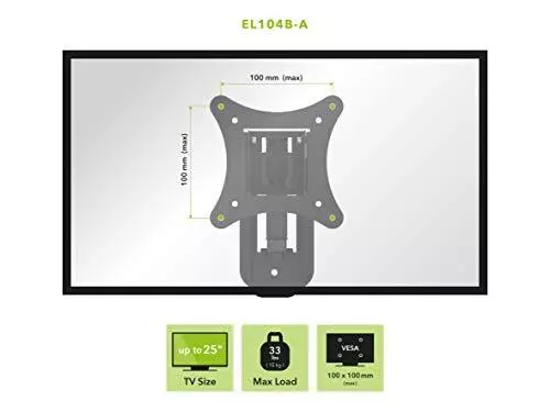 Return Policy Fast Delivery Trusted seller EL104B-A Multi Position, Full Motion, Long Extension TV Wall Mount for 12 Inch to 25 Inch TV or Monitor, Black, Universal Wall Mounting Bracket, VESA 50x50 to 100x100, Easy to Install Product Description Fits TVs up to 25 Inches and 33 lbs Pan, Swivel, Tilt, and extend TV Wall Mount with 2.05" Mounting Profile & 10.83" Extension Supports TVs up to 33 lbs 50x50 - 100x100mm VESA Mounting Patterns East Installation. Instructions and all hardware included Shipping Returns Payment Shipping Shipping is FREE to all addresses other than APO/PO boxes in the lower 48 states. All our stock ships from US-based warehouses. Shipped via USPS or UPS (depending on location and package weight) Unless stated otherwise, all orders will ship within 24-72 hours of your payment being processed. Check our feedback to see the great reviews of FAST shipping we offer. Returns Seller does not accept returns Payment We currently accept payment via eBay managed payments only. Once payment is cleared, we will dispatch your shipment within 1-3 business days. Please refer to the "Shipping" tab for more information regarding shipping speed to your destination.