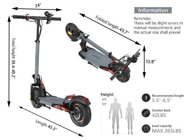 New Way to Across the City Freely The AOKDA electric scooter for adults which is powered by 48V/10Ah battery, makes it easier for you to complete daily travel. One charge is enough for you to ride for 20 miles under specific conditions. Max load 265 lbs. Let You Ride As You Want, Easy to Drive Our e-scooter has three different riding modes (Eco: 15Mph, D: 22Mph, S: 28Mph), you can choose the most suitable mode for you according to your needs, and the strong 800W brushless motor allows you ride speed up to 28Mph. Comfortable Riding Experiences, Enjoy Every Trip Our electric scooter for adult adopts front and rear wheel suspension system and 10-inch pneumatic tires, which means you can enjoy a smoother and more comfortable riding experience, even on rough roads. Make Riding More Safety Our e-scooter for adult is not only equipped with super bright headlight & taillight, but also has a side ambient light, which improves the safety of night riding and allows you to travel with peace of mind at any time. The perfect front & rear dual brakes and electronic braking system allow you to stop whenever you want. Easy to Fold & Carry You can fold the electric scooter for adults with two-steps only in a few seconds for carrying and storage. The unfolded size: 45.28"L x 23.62"W x 47.24"H. The folded size is 45.28"L x 8.66"W x 17.72"H, easy to put in your garage or office. Buy with Confidence We have always focused on the quality and technical improvement of electric scooters. Our adult electric scooter is designed to be the most sturdy and powerful electric scooter which will quickly become your favorite commuting or outdoor travel companion. We offer 180-days warranty for different parts, contact us to get fast and professional service. Important Note The max speed and max range per full charged vary based on several factors, including: rider weight, riding surface, incline, ambient temperature, battery level, riding style (stop/start vs cruising), etc. Q&A: How fast can the electric scooter go? Top Speed: 28MPH / 45KMPH (the speed greatly depends on the rider weight, road condition, riding mode...etc) How long do the electric scooter last? Well, with proper care and maintenance, this e-scooter can last anywhere more than 5 years or even longer. What are the benefits of this off road electric scooter? This off road electric scooters with high power motor, fast, portable, and with detachable seat. Not only good for off road riding, but also good for urban commuting. It also save you money on gas because they can be charged quickly. Do this electric scooter work in the rain? Well, it support IP6 waterproof. It's OK to work in small rain, but not recommend in heavy rain. And the pedal of the e scooter cannot be submerged in water. Or the battery and controller will be damaged.