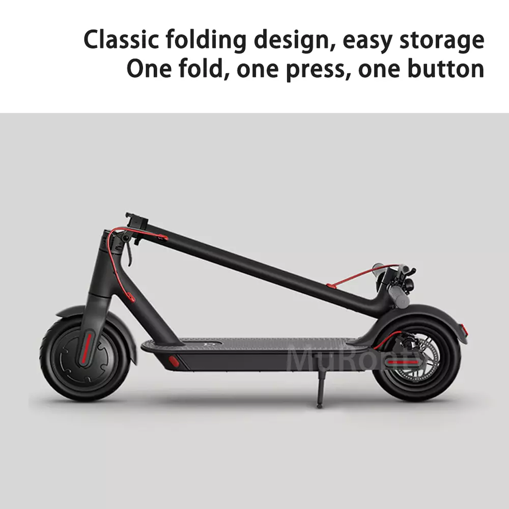 Note:The scooter is UL2272 certified. Description Introducing this electric scooter – a synergy of sleek design and advanced technology, and the highest quality components. This lightweight aluminium scooter has serious torsional strength for optimal performance.At the heart of the electric scooter is its quality 12.4Ah battery array in the stalk you can enjoy a serious range of up to 30km.The frame size makes it suitable for both adults and teens and the long deck contributes better handling.Speed, mode and charge level can all be monitored on the integrated backlit LED display. Furthermore, you can ride into the night thanks to the LED headlight. And when you’re done, the electric scooter can be folded in seconds. Features 600W motor provides stable and strong power allowing it to climb steep roads angled at 15°. 36V, 12.4Ah high-capacity lithium battery allows for a longer range and higher speed. 3 adjustable speed models to your own needs, 30km range on a full charge. 8.5inch solid honeycomb tires absorb shocks and provide comfort when riding on rough surfaces. Made of superior aluminum alloy frame, strong and sturdy, long-lasting durability, max load: 120kg. Extra wide and heavy duty panel with anti-slip design for added stabilization, more reliable and safer. Ergonomic handlebar design is suitable for most people, more convenient and comfortable. Comes with electronic brake and disc brake, you can use either your hand or foot for suspend and stop. Equipped with intelligent car locking system, you can connect with your mobile phone to lock or unlock. Headlight and taillight with brake flash light warning, making it safer to ride at night. Included kickstand provides strong support for the scooter, easy to park on the side of the road. Compact size and lightweight, portable and foldable design is great for travel and storage. Specifications Brand: MuRonty Tire Size:8.5inches Tyre:Explosion-proof tires Motor Power: 600W Battery Capacity:36V-7.8/12.4Ah Maximum Load:120KG Max Speed: 35KM/H Road Haul: 30KM Drive Mode:Front-wheel Drive Break Method:Rear Wheel Disc Brake Waterproof Level:IPX5 Net Weight:12.5KG Vehicle Weigh:14.8KG Climbing ability: 15° Color: Black Packing dimension: 1100*150*520mm Product dimension: 1080*430*1140mm
