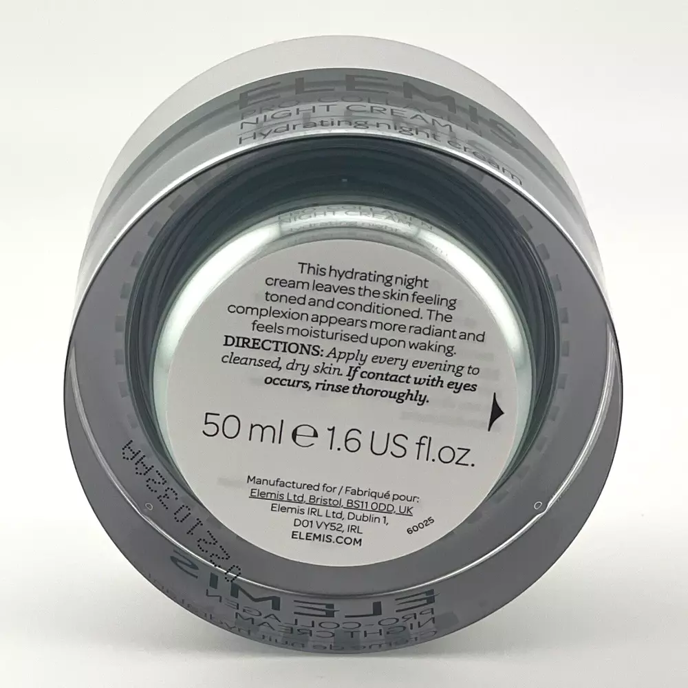 ELEMIS Pro-Collagen Night Cream - 1.6 fl oz / 50 ml | New Unlock the secret to youthful, rejuvenated skin with ELEMIS Pro-Collagen Night Cream . This luxurious night cream is expertly formulated to work overnight, helping to hydrate, firm, and reduce the appearance of fine lines and wrinkles. Infused with powerful marine and plant extracts, this rich cream nourishes and revitalizes the skin while you sleep, so you wake up with a smoother, more radiant complexion. Features: 1.6 fl oz / 50 ml full-size jar, new and unused Formulated with marine and botanical ingredients for deep hydration Clinically proven to improve skin elasticity and reduce wrinkles Ideal for all skin types, including sensitive skin Lightweight yet rich texture absorbs quickly Benefits: Provides intense moisture and nourishment overnight Helps restore skin elasticity and firmness for a youthful appearance Reduces the appearance of fine lines and improves skin texture Promotes a radiant, refreshed complexion by morning Experience the transformative power of ELEMIS Pro-Collagen Night Cream , your essential nighttime companion for smoother, more youthful-looking skin.