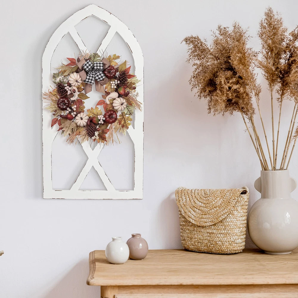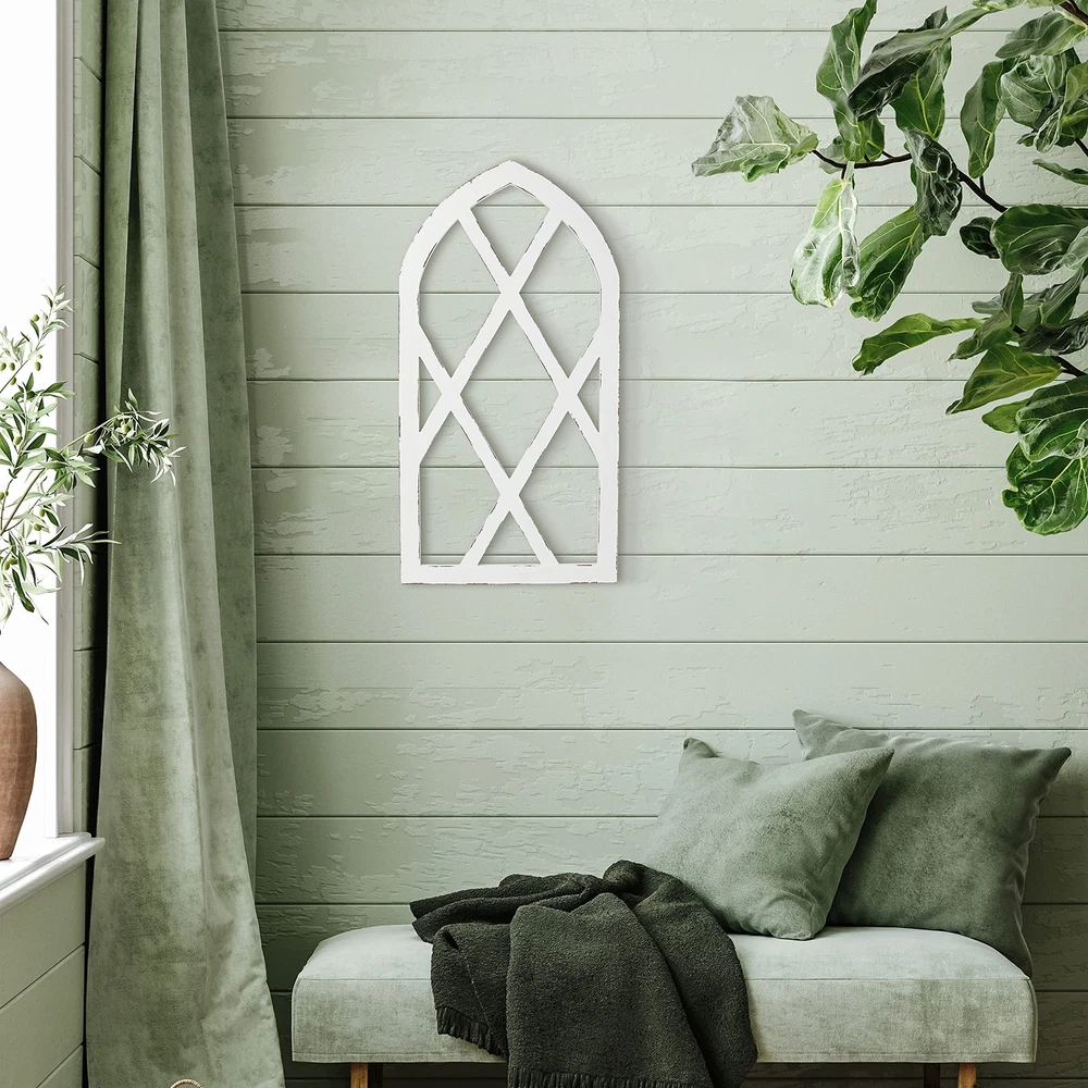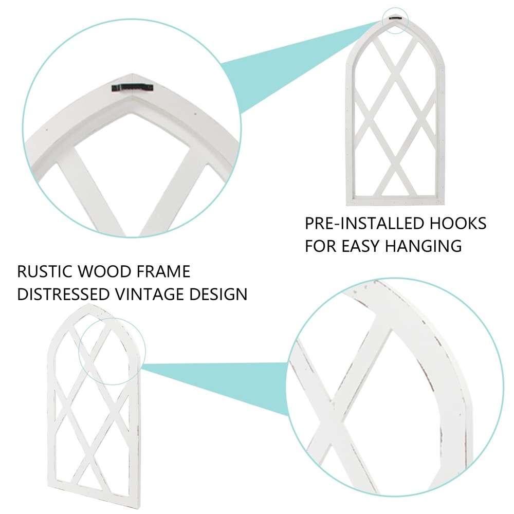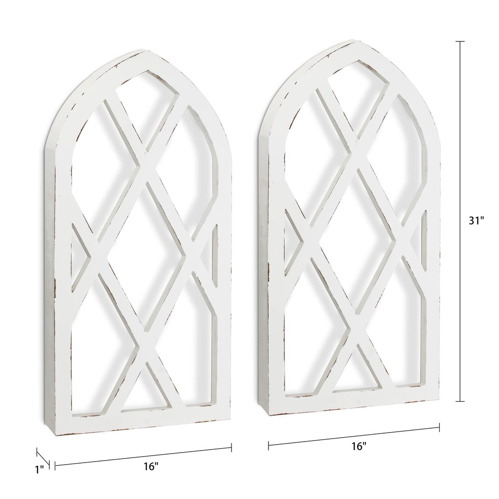 Bring warmth and elegance into your space with this 2-pack of arched window frame wall décor. Inspired by traditional cathedral windows, each piece features a tall, graceful arch and charming crisscross pattern that adds texture and architectural interest to any wall. Measuring 16 x 31 x 1 inches, these MDF wooden panels are lightweight yet durable—perfect for creating a cozy farmhouse vibe in your living room, bedroom, hallway, or entryway. Farmhouse-Inspired Wall Decor – Add timeless charm to your home with this 2-pack of arched window frame wall accents, perfect for rustic, vintage, or farmhouse-style interiors. Large Statement Size – Each window frame measures 16" W x 31" H x 1" D, making it an ideal focal point for living rooms, hallways, entryways, or above fireplaces. Durable Construction – Crafted from high-quality Medium Density Fiberboard (MDF), these decorative panels are lightweight yet sturdy for easy hanging and long-lasting beauty. Cathedral Arch Design – Features a classic arched shape with crisscross diamond lattice patterns reminiscent of traditional cathedral windows—elegant and eye-catching. Ready to Hang – Each piece includes built-in hardware for effortless wall mounting. Hang them side-by-side or separately to suit your decorating needs.
