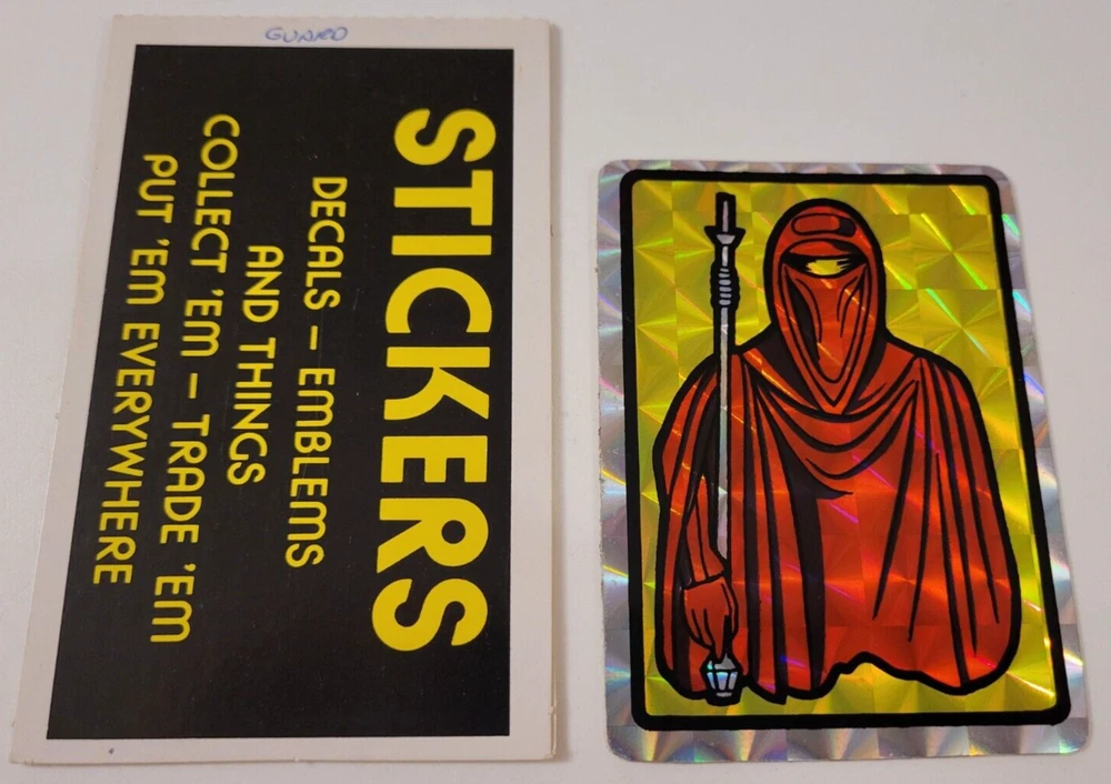 Up for sale from KENYON'S CARDS is a Very Rare Vintage EMPEROR'S ROYAL GUARD Star Wars 1980's PRISMATIC Prism VENDING MACHINE STICKER CARD Vintage RETURN OF THE JEDI in protective card sleeve + Rare ORIGINAL VENDING MACHINE STICKER CARDBOARD SLEEVE (with characters name written in pen at the top on 1 side as seen) *** CHECK OUT MY EBAY STORE IN THE "Vending Stickers" CATEGORIES FOR HUNDREDS MORE VINTAGE 1980's & 90's VENDING MACHING STICKERS AS I RECENTLY AQUIRED OVER 2,000 NM/MT INCLUDING MANY RARE ONES AND WILL BE LISTING THEM FOR THE NEXT COUPLE MONTHS **** CONDITION: Sticker card in NICE NM to NM/MT condition still as pictured (Note: old vending machine stickers were rarely perfect as many were made off center and / or with rounded / imperfect corners that all do not look the same and also give off all different kinds of light reflections when photographed). See close-up pictures for actual item you will receive. Awesome lot for that Star Wars Fan and Rare Vending Machine Sticker Collector! *** SHIPPING in 50 US states tracking and insurance included & please NOTE I usually ship faster than ebays estimated times. Worldwide shipping is available for some countries through eBay's global shipping program. GREAT GIFT !!! YES I COMBINE SHIPPING ON ALL MY ITEMS INCLUDING CARDS, STICKERS, SETS, WAX BOIXES, PACKS, WRAPPERS, PROMOS, AND ACTION FIGURES AND WEAPONS. I WILL REFUND YOU ANY EXTRA SHIPPING MONEY YOU OVERPAID ON MULTIPLE ORDERS PURCHASED ONCE YOUR ORDER IS COMPLETE. Feel free to ask me for a shipping quote on multiple items you want to buy and make sure to include your zip code . I have over 9,700 positive feedbacks so feel SAFE buying. Thank you & Happy ebaying! ****** HUNDREDS MORE VINTAGE 1880's to 2000's NON SPORT CARDS, SETS, AUTOGRAPHS, VENDING MACHINE STICKERS, WAX BOXES, WAX PACKS, WRAPPERS, PROMOS, 1970's & 80's TOYS and more in my ebay store KENYON'S CARDS plus lots more Coming over the next year as I am helping to clear out a big retired non-sport card shop and house packed with tons of vintage cards, sets and boxes ******* * STAR WARS FANS CHECK OUT MY EBAY STORES 2 STAR WARS CATEGORIES FOR MANY MORE STICKERS AND CARDS + ACTION FIGURES AND PLAYSETS AND MORE *