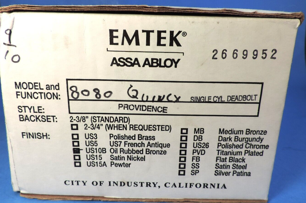 BRAND: EMTEK SERIES: QUINCY MODEL NO: 8080 KNOB STYLE: PROVIDENCE COLOR: OIL RUBBED BRONZE (US10B) ITEM: SINGLE CYLINDER DEADBOLT (KEYS INCLUDED) SHIPPING: WEIGHT WILL BE 6 LBS. NOTE THAT I OFFER OPTIONS UNDER SHIPPING TAB. SELECTION MAY BE MADE UPON CHECKOUT