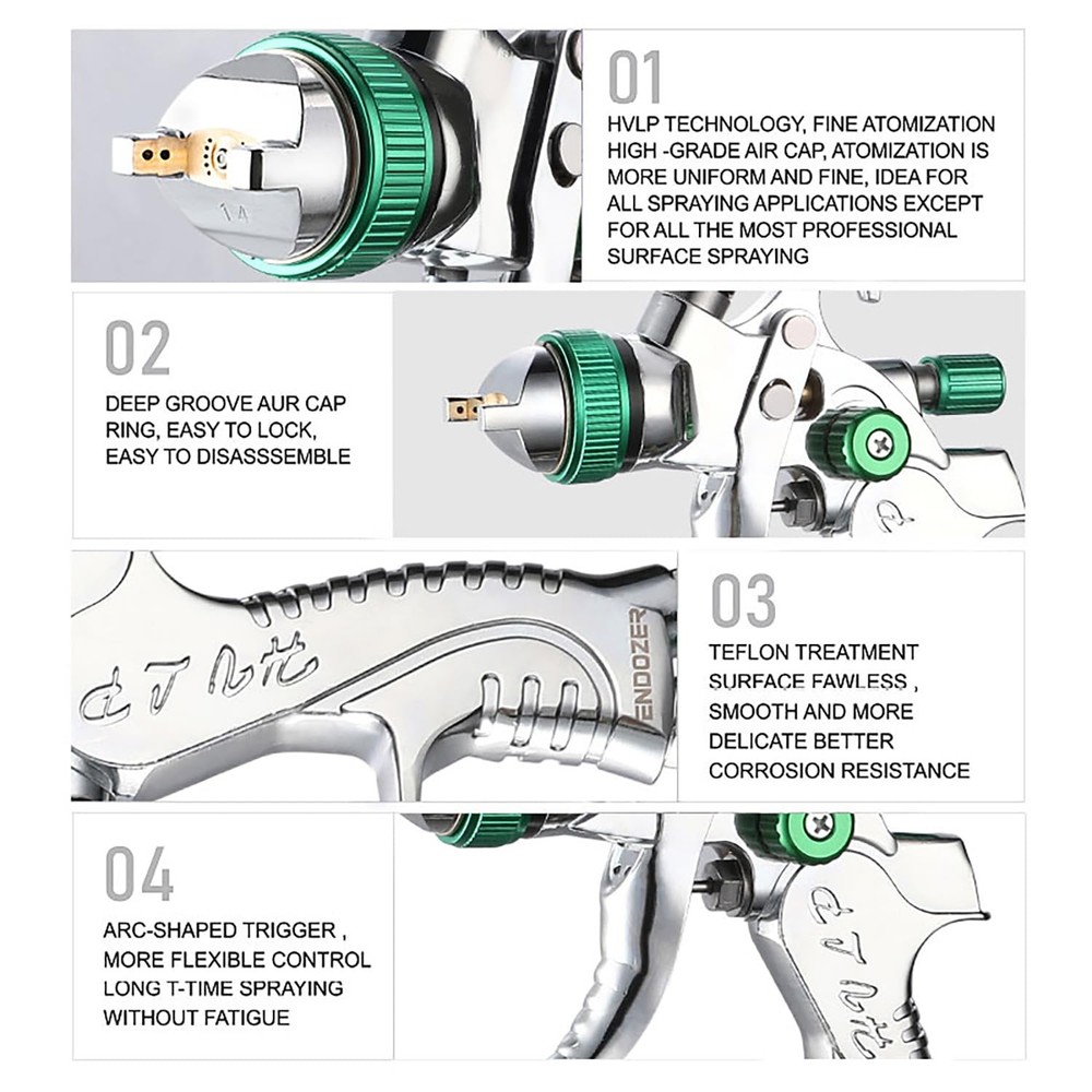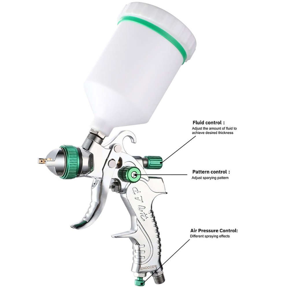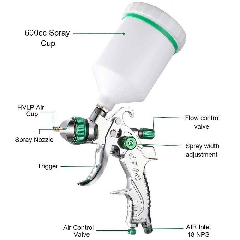 ENDOZER Professional HVLP Spray Gun Set Gravity Feed Air Spray Gun with 1.3, 1.5, 1.8mm Nozzles 20oz 600cc with Gauge for Auto Paint, Primer, Clear/Top Coat & Touch-Up (Not Suitable for Latex Paint) This spray gun is supplied with a 20 oz. (600 ml) gravity feed cup, with 1.3, 1.5, 1.8mm real stainless steel nozzle and needle. The hvlp spray gun hood is made of brass, wear-resistant and corrosion-resistant, 15 holes design, uniform atomization, excellent effect. 1/4 "NPT inlet and quick adapter of the same specification. Fluid control adjusts the amount of spray paint, pattern control adjusts the fan pattern size, and the air conditioning valve provides the ability to adjust the air flow rate. It is designed to provide uniform spraying and particle size for all types of surface coatings. In the painting process effective paint filter(product contains) recommended to reduce any small pieces of dried paint or pollutant in the fluids to ensure a perfect finish. In addition, this air spray gun case also includes accessories such as air pressure gauge, quick adapter set, etc., Compatible with various usage scenarios. Endozer spray paint gun can be used for various purposes such as furniture repair, mural painting, car painting, painting, arts and crafts, paint coating of industrial products, spray paint of factories, and model making. HVLP air spray gun that is easy to use even for beginners ENDOZER Professional HVLP Spray Gun Set Gravity Feed Air Spray Gun with 1.3, 1.5, 1.8mm Nozzles 20oz 600cc with Gauge for Auto Paint, Primer, Clear/Top Coat & Touch-Up (Not Suitable for Latex Paint) Shipping We offer FREE shipping on all orders! We ship within Three business days of payment, usually sooner. We use a selection of shipping services such as UPS, FedEx, USPS etc. We only ship to the lower 48 states, no APO/FPO addresses or PO Boxes allowed. Local pickups and combined shipping options are not provided at this time. Return You can return a product for up to 30 days from the date you purchased it. Any product you return must be in the same condition you received it and in the original packaging. Please keep the receipt. Feedback Customer satisfaction is very important to us. If you have any problem with your order, please contact us and we will do our best to make you satisfied. Contact Us If you have any queries, please contact us via ebay. We usually respond within 24 hours on weekdays. Please visit our eBay store to check out other items for sale! Thank you for shopping at our store.