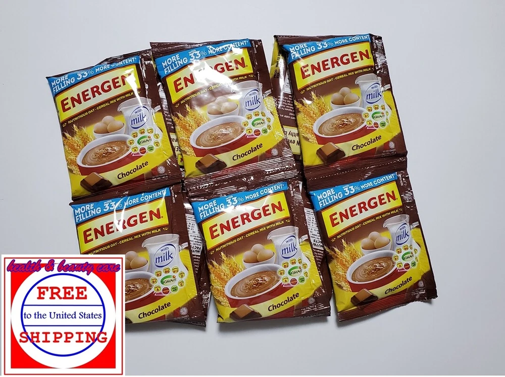 ENERGEN Chocolate Nutritious OAT-CEREAL mix with MILK 40 grams x 10 sachets NOTE: New stocks arrives every month, message me for current expiration date. Energen Chocolate milk and cereal drink is a nutritious Chocolate mix that is easy to prepare with hot water. Complete with cereals and vitamins This drink is an instant to make cereal drink with milk powder through it. Easy to make and o so tasty and healthy. Rich in vitamins, contains many good ingredients to start your day in a healthy way. 1 sachet is sufficient for 1 full cup of hot cereal milk drink. How to prepare Put the contents of this bag in a cup Boil water and pour approximately 150 ml into the cup Stir well and enjoy Ingredients: Sugar, Non-dairy Creamer (Glucose Syrup, Hydrogenated Vegetable Fat (Coconut and/or Palm Kernel Oil), Sodium Caseinate, Stabilizer (Di-potassium Phosphate), Stabilizer (Sodium Polyphosphate), Emulsifier (Sodium Stearoyl Lactate), Anticaking Agent (Silicon Dioxide), Wheat Flour, Oats, Whey Powder, Cocoa Powder, Milk Powder, Corn, Calcium Carbonate, Chocolate Flavor, Salt, Emulsifier (Soy Lecithin), Vvitamin Premix (Vitamin A, B1, B2, B6, Folic Acid, B12, D and E), Egg Powder, Malt Extract. Allergen Information: Contains Wheat, Milkk, Oats, Soya, Egg and Malt Reminder before you buy: We are located in the Northern Mariana Islands (United States Territory) which is outside the US. Domestic shipping time via first class mail or priority mail is between 10-15 days depending on your location. International shipping time via priority mail is between 15-30 days depending on your location. Please take note of this when giving feedback rating on “Shipping Time”. Thank you for your understanding and consideration.