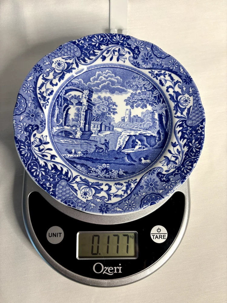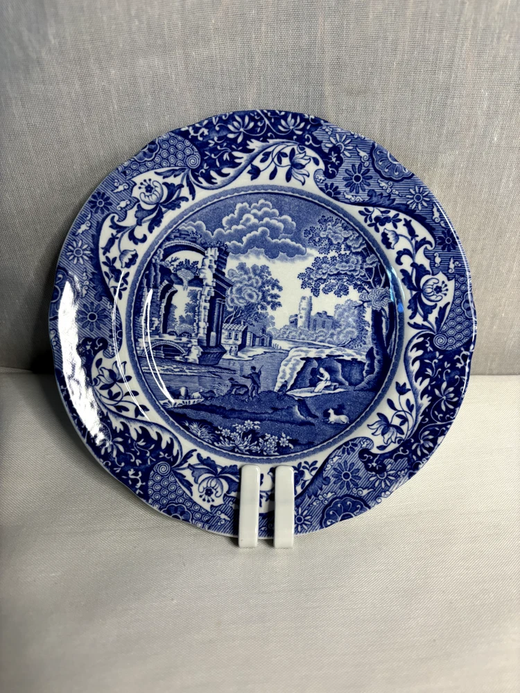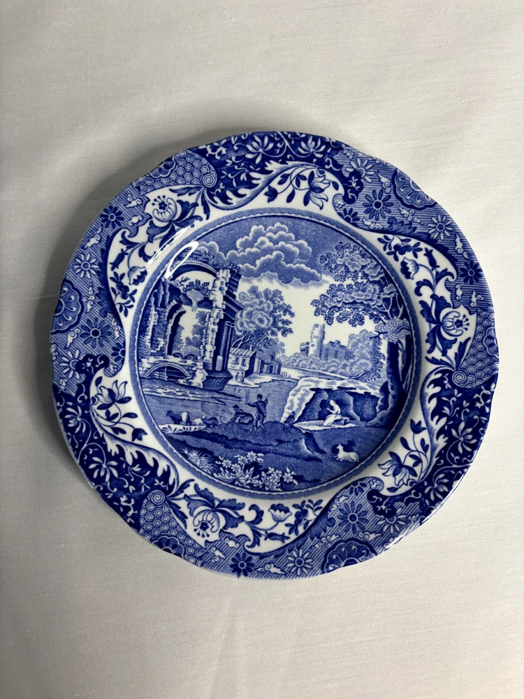 ENGLAND FOUR SCALLOPED SPODE BLUE ITALIAN BREAD PLATES 6 1/2”D UNUSED LOOK This set of four scalloped edge bread plates in the Spode design is a must-have for any collector of mid-20th century English porcelain. The blue and white checkerboard pattern, featuring a landscape theme, is eye-catching and versatile, making these plates suitable for any occasion. Crafted in 1962, these plates are in their original, glossy finish and have never been used. The set includes four round plates with a diameter of 6 1/2 inches. The product line is Blue Italian, and the plates were manufactured in the United Kingdom. Add these classic plates to your collection today!