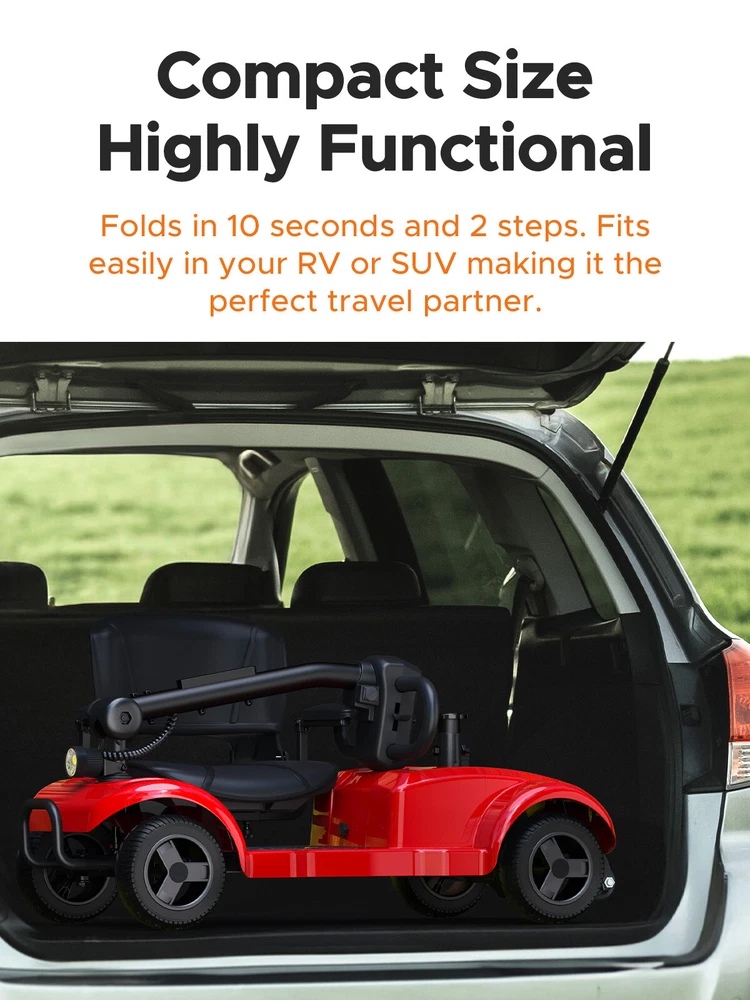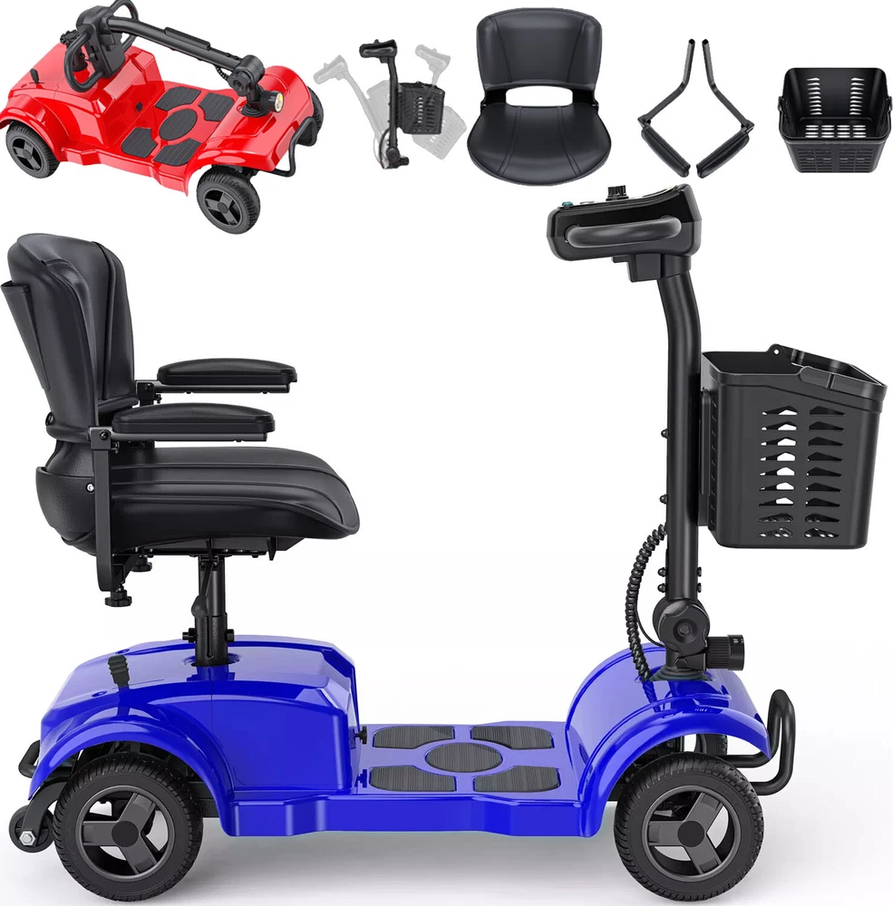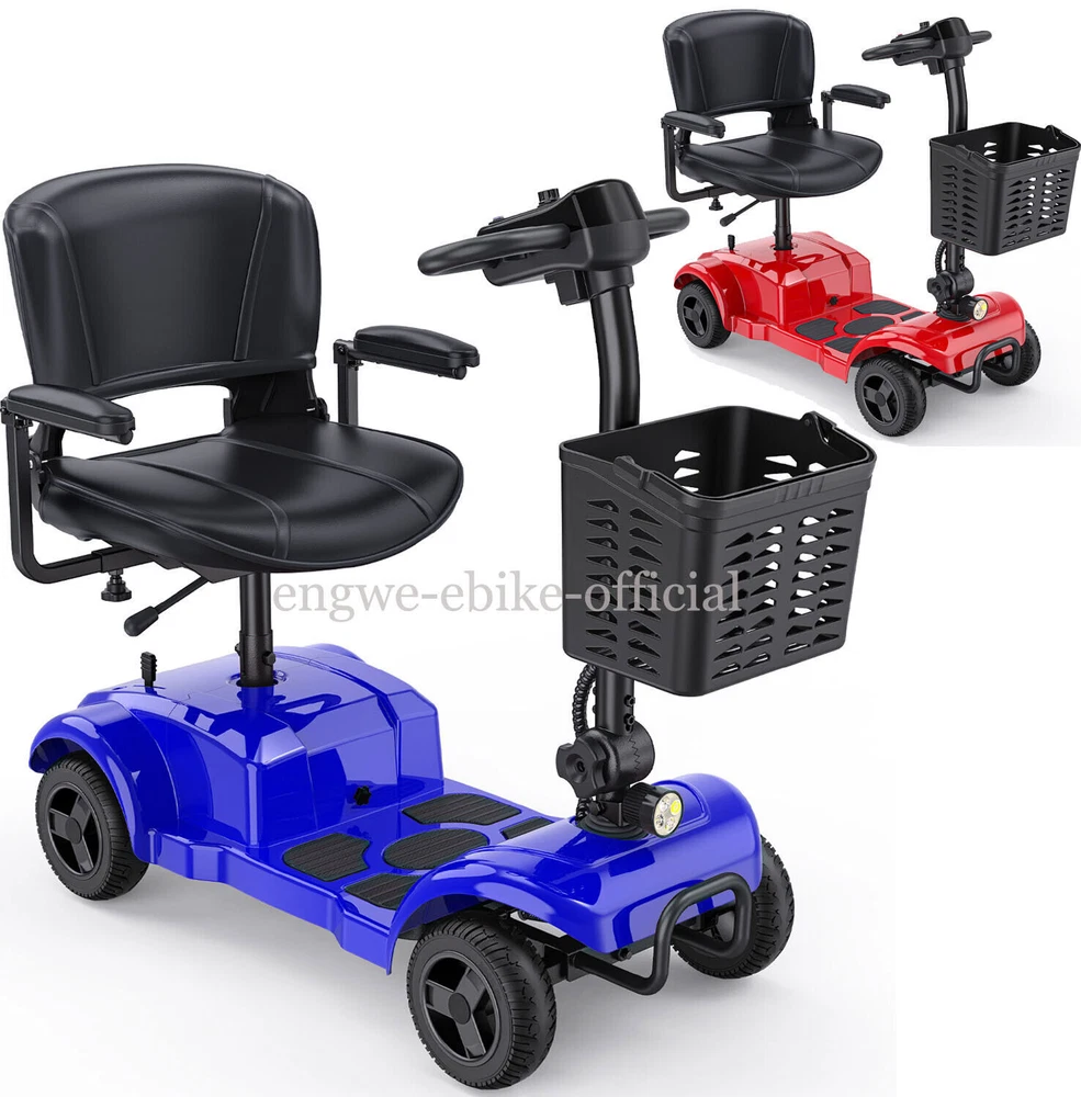 ENGWE 24V 250W Motor 4 Wheel Power Mobility Scooter Heavy Duty Travel with light 🛴 【Main Parameters 】 Max Weight Capacity: 300 lbs / Max Speed: 10 mph / Range: 20 miles per charge / Climbing Slope: 9º / Battery Capacity: 12V/12Ah 🛴【Comfort Adjustable Seating 】 The spacious seat and backrest can provide gentle cushioning and support ; the height-adjustable seat can easily be customized to comfort your legs ; the scooter is also surrounded by two padded armrests that you can adjust them forward or backward for greater convenience when getting on or off the scooter. 🛴【Safety First 】 The mobility scooter is equipped with four pneumatic tires and anti-roll wheels to give you more comfortable and smooth driving experience,even when the vehicle drives on moderately rough roads.And the scooter is designed with the intuitive control panel which is easy to operate. It is designed with electromagnetic brake which is easy to control and much safer. The scooter comes with headlights and brake lights to ensure safe driving. 🛴【 Easy to Transport 】 It is easy to disassemble the mobility scooter into four separate pieces without tools, you can put them in the trunk of standard size vehicles and making your travel much more convenient and comfortable! 🛴【INTUITIVE CONTROL PANEL】 Located on the tiller console, the control panel allows you to set the maximum speed with the variable speed dial, change from a forward to a reverse direction, turn on the headlight as well as produce a warning tone as needed. The display also includes a color-coded battery life indicator for checking the status of the battery at a glance. Minimum steering angle: 10-15° Static stability: ≥9° Dynamic stability: ≥6° Climbing ability: ≤9° Slope holding ability: ≤9° Clear height from ground: 140mm Mileage: ≦25km Maximum horizontal braking distance: ≤1500mm Tires: 8-inch solid tires Wheelbase: 650mm Seat cushion: 360 degree leather seat Headlight: LED Key: Yes Basket: front Intuitive Control Plate,ABS Basket Intuitive Control Plate allows you to control effortlessly, and Meter will show the power directly.The storage basket made of the new ABS material has higher durability than the old iron storage basket and is not easy to deform. Easily load and unload battery Accurate battery slot allows you to easily load and unload battery. Dual Rear Anti-Tipper Prevent rollover and landslide.Dual Rear Anti-Tipper for promoting the security of the slope driving. TECHNICAL SPECIFICATIONS Motor 24V 250W Max. Weight Capacity 265 lbs Driving Distance 25km Braking Electromagnetic Brake Climing Gradeability 9 Degree or more Battery 12V 12AH Seat Size 13.78"x15.75"x20.47" Product Size 103*50*84cm Scooter Weight 40kg Package Wight 46kg Features Dual model can switch quickly. 4 Wheel configuration provides additional stability. Quick and easy disassembly into 4 easy-to-transport pieces. Height-adjustable swivel seat with fold-down backrest. Comfortable, Armrests are padded and adjustable. Comes with large metal carry basket. Solid, non-marking, flat-free tires for worry-free travel. Anti-tip wheels for greater safety. Headlight for enhanced safety. Delta tiller is easy to adjust; Ergonomic throttle control with easy freewheel operation. Seat back folds completely flat, which comes in handy when transporting or storing the scooter. Comes with easy to remove, quick connect battery pack that can be charged separately from the scooter. Warranty: Lifetime on frame, 24 months on electric controller and drive train components, 12 months on batteries. Folded size: 39.37'' X 19.68'' X 14.96'' Specifications Weight Capacity 260 lbs. Top Speed 10km/h Estimated Range 25km Max Climbing Angle 9° Batteries 12V/12AH Battery weight 3kg Color Red、blue Charger 48V 2A Brakes Electromagnetic Freewheel Mode Yes Front Wheels 8" x 2" Rear Wheels 8" x 2" Anti-Tip Wheels Yes Base Weight 46KG . Seat Weight 23bs. Total Weight 46 lbs. Package including: 1x Blue 4 wheels Electric Wheelchair 1x Charger 1x English Manual. On Jul 2, 2024 at 05:42:41 PDT, seller added the following information: