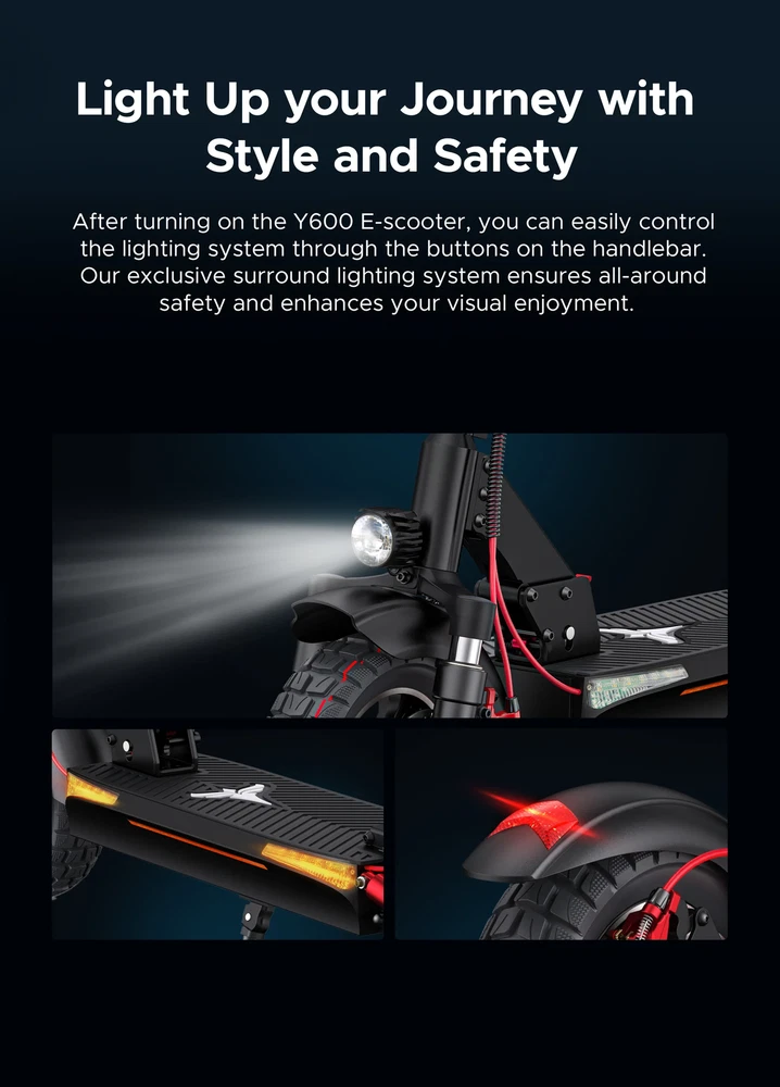 🛴A new option that allows you to freely across the city - Our New Y600 Adult Electric Scooter with Seat which is with powerful battery( 48V 18.2Ah ), makes it easier for you to complete daily travel, and one charge is enough for you to ride for 43.5 miles under specific conditions, max load of 330 lbs. 🛴Let You Ride As You Want, Easy to Drive - Our New Y600 E-scooter has three different riding modes ( Eco: 9Mph, D: 18Mph, S: 28Mph ), you can choose the most suitable mode for you according to your needs, and the 600W Motor/ 830w powerful high brushless motor allows you ride speed up to 28Mph, and handle all kinds of road conditions with ease! 🛴Comfortable Riding Experiences, Let You Enjoy Every Trip - Our New Y600 Electric Scooter for Adult adopts front and rear wheel suspension system and 10-inch pneumatic tires, which means you can enjoy a smoother and more comfortable riding experience, even on rough roads! 🛴Make Your Safety More Secure - Our New Y600 E-scooter for Adult is not only equipped with super bright headlight & taillight, but also has a side ambient light, which improves the safety of night riding and allows you to travel with peace of mind at any time. The perfect front & rear dual brakes and electronic braking system allow you to stop whenever you want. 🛴Your Great Helper for Travel - You can fold this New Y600 Electric Scooter with Seat for Adults with two-steps only in a few seconds for easy carrying and storage. The unfolded size: Package Dimensions (LWH): 48*9.4*18.9 (122x24x48 cm) . The folded size is Folded Size: 46.4*11*18.5 inches (118*28*47 cm) , easy to put in your garage or office. 🛴Buy with Confidence - ENGWE , a brand you can trust. We have always focused on the quality and technical improvement of electric scooters. Our electric scooter is designed to be the most sturdy and powerful electric scooter which will quickly become your favorite commuting or outdoor travel companion. ENGWE offer 180-days warranty for different parts, contact us to get fast and professional service. 🛴【Important Note】- The max speed and max range of per full charged vary based on a lot factors, including: rider's weight, riding surface, incline, ambient temperature, battery level, riding style (stop/start vs cruising), wind direction, wind speed etc. Specification: Model: Y600 Electric Scooter Body: Aluminium alloy Motor torque/N.M:28 NM Battery:48V18.2AH Lithium-Ion Battery*1 Range:43.5 miles Brakes: Mechanical Disc Brake/Power-off Brake Lever Tires: 10" Off-road Tires Max. loading: 330 lbs Max. speed: 28 mph Charging time: 6 Hours Product weight: 50 lb Brake:Mechanical Disc Brake/Power-off Brake Lever Tires:10*4.0 Tires Charging Time:About 10H Waterproof Grade:IPX5 Bike Weight:26.5 KG (58.4 lbs) Gross Weight:30.5 kg (67.2 lbs) Product Description The powerful 830W motor brings Speed up to 28MPH (Release speed),48V 18.2AH Battery brings long range can travel 43 miles for more fun. The enhanced climbing ability and full suspension design are suitable for more terrains. Detailed turn signals, front and rear lights will ensure your safe riding. Package contents: 1 x Electric scooter. 1 x Portable Folding Handle 1 x Tool set. 1 x Main charger. Rider Height: 5.4 (ft) -6.2 (ft) Payload Capacity: 264 lbs (120 kg) Package Dimensions (LWH): 48*9.4*18.9 (122x24x48 cm) A--Minimum Handlebar Height 38.5 inches (98 cm) B--Maximum Handlebar Height 48.4 inches (123 cm) C--Total Length 46.4 inches (118 cm) D--Minimum Saddle Height 23.6 inches (60 cm) E--Maximum Saddle Height 30.3 inches (77 cm) Folded Size: 46.4*11*18.5 inches ( 118*28*47 cm) A--Height 18.5 inches (47 cm) B--Length 46.4 inchs (118 cm) C--Width 11 inchs (28 cm) Our product: (1) Our product approved by UL2272/CE/ROHS certificates (2) Every piece of spare part will be inspected before assembling and very piece of completed product will be tested before shipment. Contact US: (1) Welcome to wholesale and purchase,If you have any question ,Please contact us first. We will reply you within 24 hours. (2)We will leave positive feedback to buyer as soon as buyer pays for the item.We hightly appreciate that you can contact with us before you leaving Negative feedback or Neutral feedback .We will offer help to resolve your problems as fast as possible.