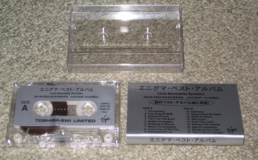 We have other Japanese deleted and PROMO CDs, cassettes, laserdiscs and more by ENIGMA and related (SANDRA etc) in stock - contact us for details! ARTIST : Enigma TITLE : Love Sensuality Devotion CATALOGUE NUMBER : VJCP-68299 CONDITION (SLEEVE): M- (some creasing and storage wear, very nice used condition). CONDITION (CASSETTE): EX+ (both labels have some 'bubbles' from air trapped under the label, so are raised/creased in a couple of places. See scan). CONDITION (CASE): EX+ (normal wear and scuffs). OTHER DETAILS: Official Japanese PROMO ONLY cassette tape with original promo only sleeve! This ultra rare record company tape was distributed only to selected music writers ahead of the official CD release and was never on sale in stores. This is the ONLY official Japanese cassette format issue of this album! Shipping & handling rates - Registered/signed-for airmail shipping with insurance is $8 to North America, Asia, Europe & Oceania. Rates for South America and Africa on request. Extra cassettes in the same parcel add $2 per cassette. We can accept payment via PAYPAL. Buyer is liable for any import taxes that may be charged by your country. Appropriate feedback is left for ALL deals. Payment must be sent within 3 days of the auction close and please don't bid if you aren't going to buy!! Thank you.
